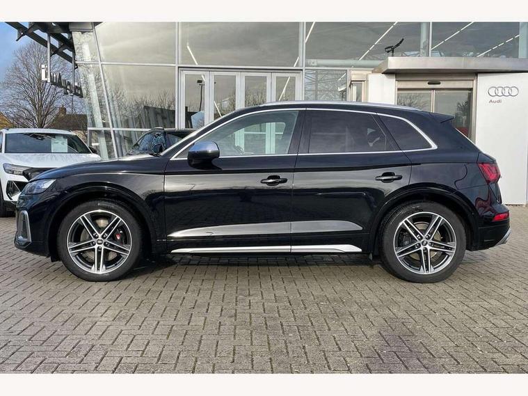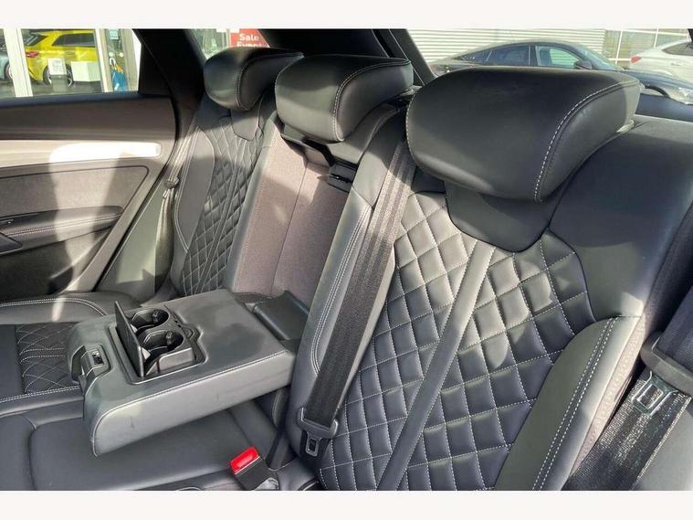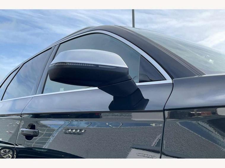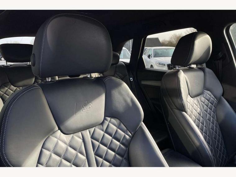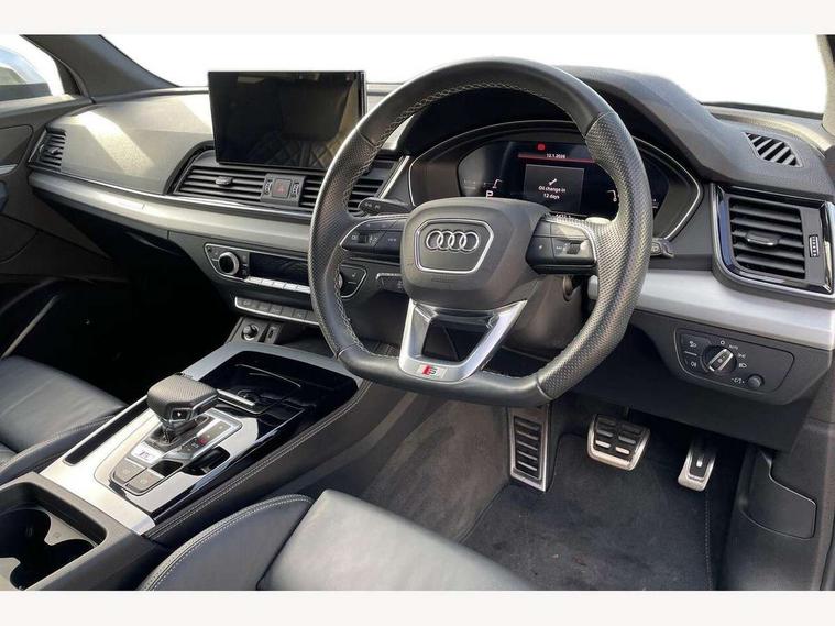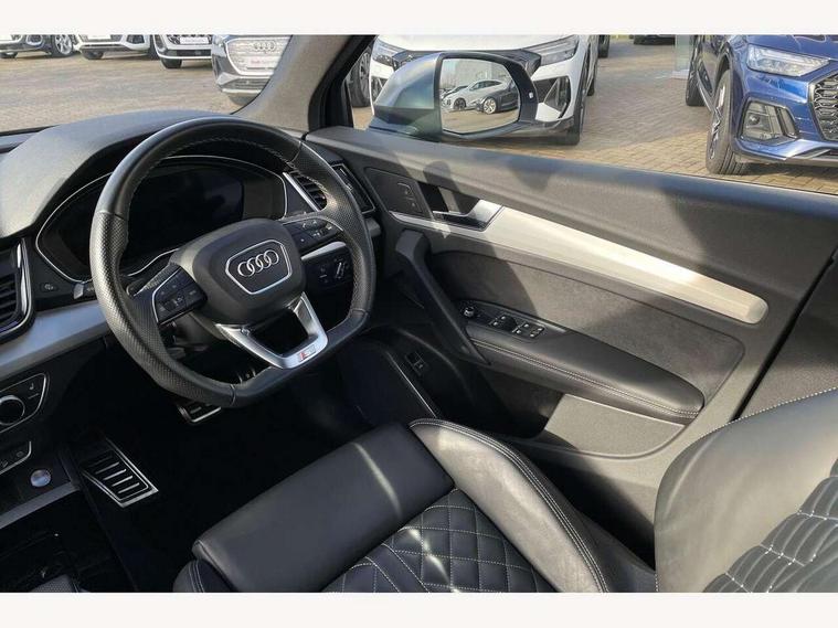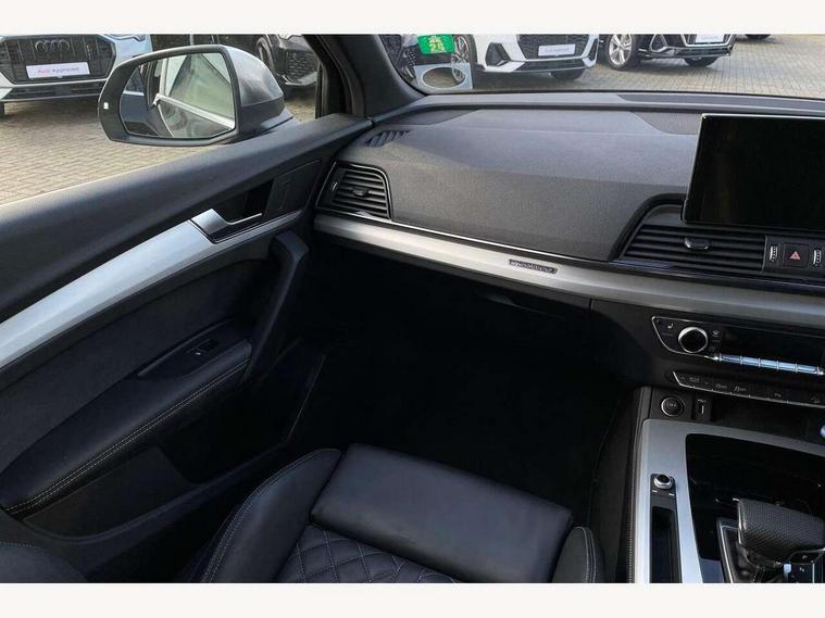 Audi connect safety and service (e-call), Audi connect with Amazon Alexa Integration, Audi drive select, Audi virtual cockpit plus with 12.3" screen and three different layout designs, Audi wireless smartphone interface, Automatic start-stop system with coasting functionality and efficiency programme, Bluetooth interface, Electro - mechanical power assisted steering, MMI navigation plus with 10.1" touch screen, Power tailgate, Reversing camera, Service interval indicator, Voice control system with Audi hotword activation "Hey Audi", 70 litre fuel tank and 24 litre AdBlue tank, Diesel particulate filter, Quattro on demand, S sports suspension, 2 x USB charging port with aux input socket, Audi sound system, DAB Digital radio, Acoustic windscreen, Aluminium roof rails, Audi beam, Audi beam with Audi rings logo, Auto dimming door mirrors, Auto dimming rear view mirror, Automatic headlight adjustment, Automatic headlights and windscreen wipers, Body colour bumpers, Body colour rear diffuser with matt aluminium silver surrounds, Body colour underbody protection, Chrome plated exhaust trims, Daytime running lights, Door sills in Selenite silver, Electric adjustable/heated/folding door mirrors, Front air inlet surrounds in titanium black, Front and rear electric windows, Front radiator grille in honeycomb design, Headlight washers, High gloss black B pillar trims and triangular rear door trim, High level LED brake light, Lower bumpers painted in contrast Manhattan grey, Rear chrome trim strip below lights, Rear privacy glass and rear side windows, Rear side wing doors, Rear wiper, Roof bars, S front and rear bumpers, S Line rear spoiler, S Line side skirts, S specific rear diffuser, 3 rear headrests, 4 way electric lumbar support for driver and front passenger, 40:20:40 split folding 3 rear bench seat in 2nd row with rear centre armrest, Black cloth headlining, Comfort front centre armrest, Contrast stitching on seats, steering wheel and gear lever gaiter, Deluxe 3 zone electronic climate control, Fine Nappa leather upholstery with diamond pattern contrast stitching + front sport seats with S embossed logo, Front/rear floor mats, Fully electrically adjustable seats, Gear lever in black leather, Heated front seats, Height adjustable front head restraints, Height/reach adjustable steering column, Illuminated door sill trims with S logo, ISOFIX child seat mounting and top tether, Luggage compartment cover, Massage function for front seats, Rear seat bench plus, Removable luggage compartment floor, Single front passenger seat, Stainless steel pedals, Sunvisors with vanity mirrors, Extended interior upholstery pack - Q5, High gloss pack - Q5, LED interior light pack - Q5, 3 point seatbelts on all seats, 6 airbags - Driver, front passenger, curtain and side airbags, Electrically operated child locks on rear doors, Electromechanical parking brake, Electronic stabilisation control including ABS, ASR and EDL, Front passenger airbag deactivation, Hill descent control, Hill hold assist, Multi collision brake assist, Pop-up bonnet for pedestrian protection, Pre sense city, Seat belt force limiter, Seatbelt monitoring, Tyre pressure warning, Warning triangle and first aid kit, Anti theft alarm, Anti-theft wheel bolts, Keyless Go access/ignition system, Remote central locking,