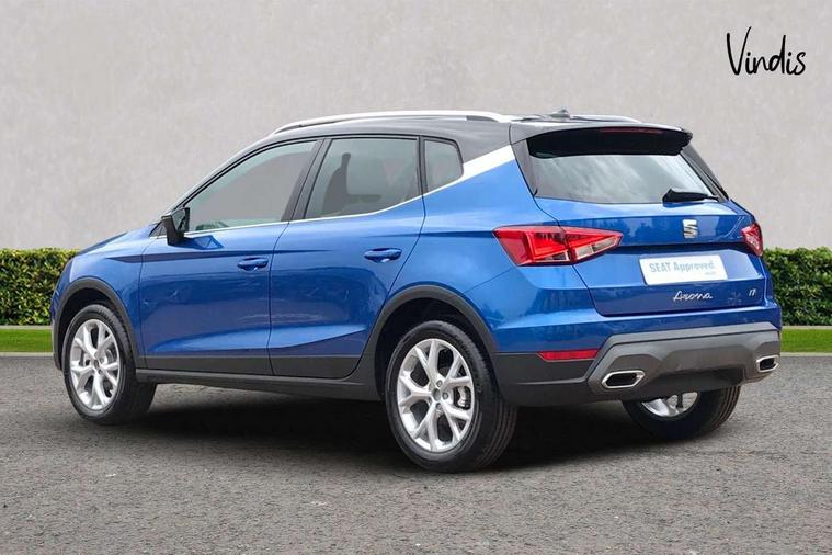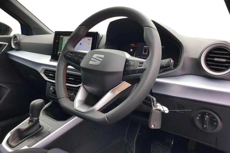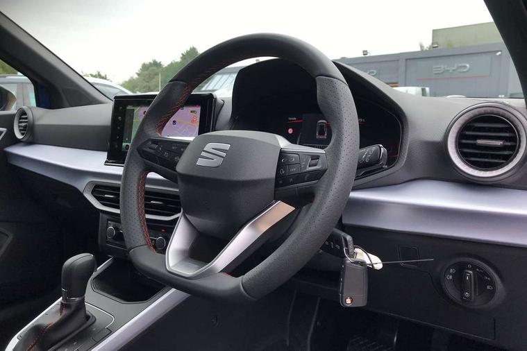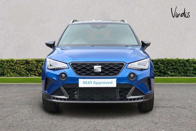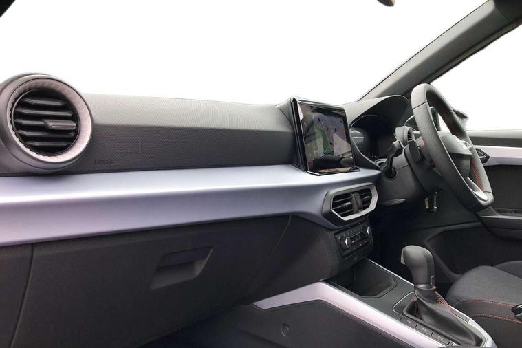 'Lights On' Reminder warning buzzer, 8" Digital cockpit, Digital clock, E-call, Electric speed sensitive power steering, Full link smartphone integration with mirror link, wireless apple carplay, Google android auto + USB Type C cable for apple and android devices, Lane keeping system, Low fuel warning light, Outside temperature display, RPM counter, SEAT Drive profile - Four different models normal-sport-eco-individual, steering response, throttle response and gear shifts mode, Trip computer, Wireless phone charger, 9.2" colour touchscreen with navigation system, voice control and USB port (type c), Bluetooth interface for hands free and audio streaming, DAB digital radio and AM/FM radio, Steering wheel mounted audio controls, Anti theft roof antenna, Auto dimming interior rear view mirror, Automatic activation of hazard warning lights, Body coloured bumpers, Body coloured door handle inserts, Chrome roof rails and window surrounds, Dark tinted rear windows, Electric front/rear windows, Electrically adjustable, heated and folding door mirrors, Front fog lights with cornering function and rear fog light, FULL LED automatic headlights with dynamic headlight range control, coming and leaving home, LED daytime running lights, LED rear tail lights and licence plate lights, Protective side mouldings, Rain sensing wipers, Rear side wing doors, Rear spoiler, Rear window wash/wipe, Roof colour door mirrors, Third brake light, Twin exhaust pipe styling hidden exhaust pipe, Visible VIN plate, 2 cupholders, 3 seat bench in 2nd row, 60/40 split folding rear seat, Aircare filter, Black interior roof, Cloth upholstery, Double boot floor, Driver sunvisor with covered mirror + card holder, Dual zone climate control, Front courtesy light with front reading lights, Gear shift indicator, Height adjustable front seats, Height/reach adjustable steering column, Illuminated air vent surrounds, Illuminated boot, Instrument lighting with brightness control, Interior ambient lighting, Interior light in footwell, central console and door panel, ISOFIX points in outer rear seats with top tether anchorage points, Passenger sunvisor with vanity mirror, Perforated flat bottomed leather steering wheel/gear knob/handbrake with red stitching and FR logo, Potentiometer, Single front passenger seat, Steering wheel mounted gearshift paddles, Two front and three rear height adjustable headrests, Interior chrome pack - Arona, Safe and driving pack (S) - Arona, 3 point seatbelts on all rear seats, ABS, Active front headrests, Child locks on rear doors, Driver and front passenger airbags with front passenger airbag de activation, front side and curtain airbags, Emergency Brake Assist (EBA) and front assist, Front and rear seatbelt reminder, Hill hold control, Multi-Collision braking, Tiredness recognition system, Traction control, Tyre pressure monitoring system, Alarm with back up horn with tow away protection, Deadlock, Electronic engine immobiliser, Locking wheel bolts, Remote central locking, Titan black dashboard, 17" Dynamic alloy wheels,