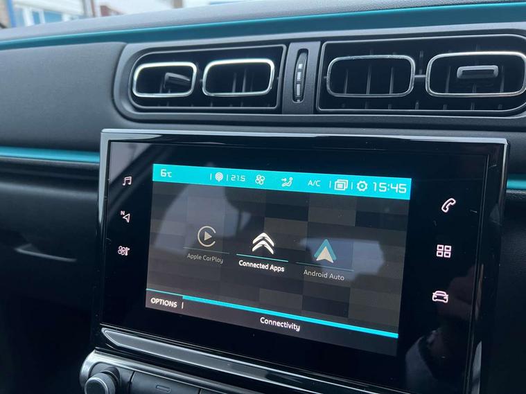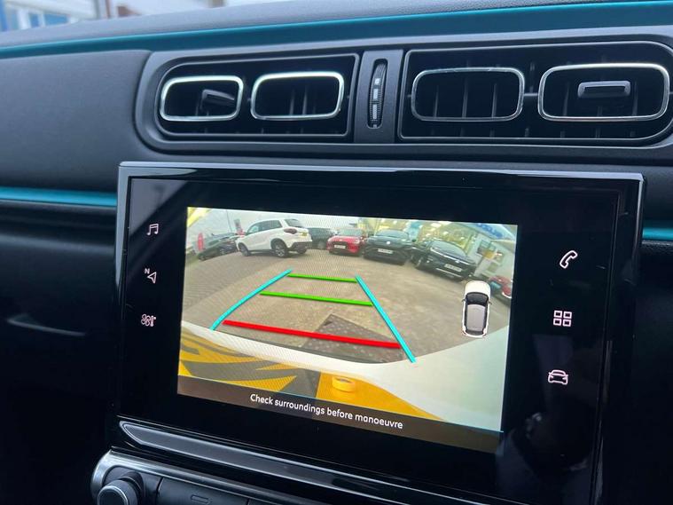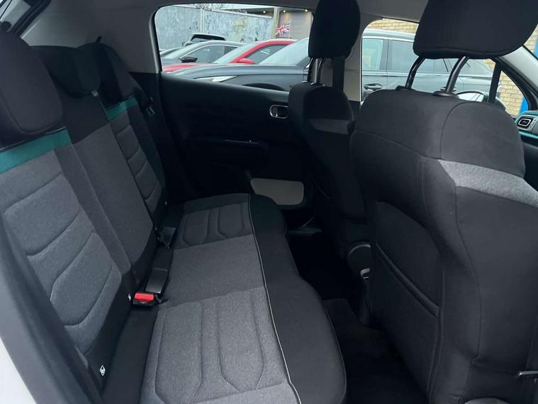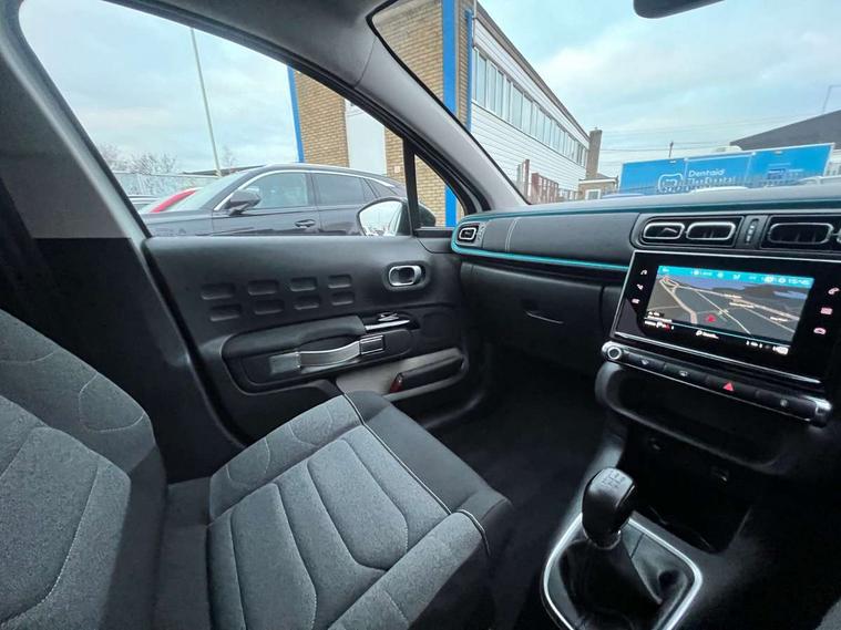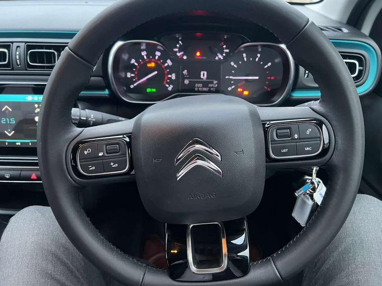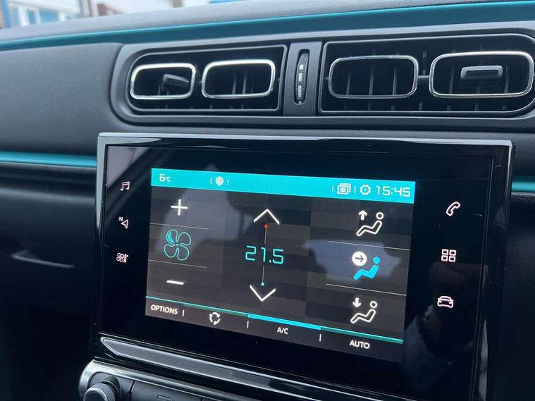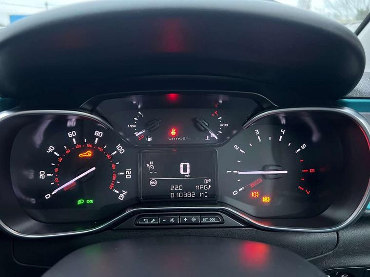 Citroen connect box emergency and assistance system, Citroen connected nav with DAB, 6 speakers, 7" captive touch screen, mirror screen includes apple carplay/android auto and bluetooth, Coffee Break Alert, Cruise control + speed limiter, eCall emergency call system, Exterior temperature display, Multi function trip computer, Reversing camera, Satin chrome surround instrument cluster with white LCD and analogue gauges, Variable assistance power steering, USB connection, 3D rear light signature, Airbump on side door panel, Auto dimming electrochrome rear view mirror, Auto headlights, Automatic activation of hazard warning lights, Body colour bumpers, Body colour door handles, Chrome decoration on front face, under chevrons and around daytime running lights, Citroen illuminated signature in LED headlights and LED daytime running lights, Dark tinted tailgate and rear side windows, Electric folding and heated door mirrors, Fog lights integrated into front bumper, Front sequential electric windows with one-touch open/close and anti-pinch system, Gloss black finish B pillar, LED Headlights, LED third brake light, Rear sequential electric windows with one-touch open/close and anti-pinch system, Rear side wing doors, Rear windscreen wiper with intermittent mode linked to vehicle speed and automatic activation when reverse gear selected, Roof colour rear view mirror caps, Variable front intermittent wipers, 1/3 to 2/3 split folding rear seat, 12V socket, 3 seat bench in 2nd row, Automatic air conditioning, Boot light, Cloth/leather effect upholstery, Driver and passenger's sun visor with courtesy mirror, Driver's central armrest, Driver's seat height adjustment, Front lighting panel with map reading lights, Front seats adjustable with forward back slide and adjustable backrest, Height adjustable front head restraints, Height/reach adjust steering wheel, ISOFIX mounting on outer rear seats with top tether and labels indicating fixing points, Leather steering wheel with gloss black + satin chrome elements and audio/telephone controls, Leather trimmed gear lever with leather effect gaiter and overstitching, Map pockets in back of driver and front passenger seats, Parcel shelf, Seatbelt unfastened on the move audible and visual alert for front and rear seats, Single front passenger seat, Storage space under touchscreen with rubber mat, Three rear headrests, Upholstered armrest in front and rear doors, Safety pack 1 - C3, Safety pack 2 - C3, Visibility pack with automatic lights - C3, ABS with Electronic brakeforce distribution and Emergency braking assistance, Driver and front passenger seatbelts with pyrotechnic pretensioners and force limiters, Driver's airbag, Electric child locks, ESP with anti skid system, Front passenger airbag, Front passenger airbag deactivation, Front side airbags + front/rear curtain airbags, Hill start assist, Manual parking brake with leather handle and chrome finish button, Mono-tone horn, Outer rear seats with pretensioners and force limiters, Three rear 3-point seatbelts, Tyre pressure monitoring system, Anti theft alarm, Automatic door and boot locking when moving off with automatic unlocking in case of impact, Central locking with locked indicator and interior one touch lock button, Immobiliser, Remote control central locking with two plip keys, 17" Vector diamond cut alloy wheels, Tyre puncture repair kit,