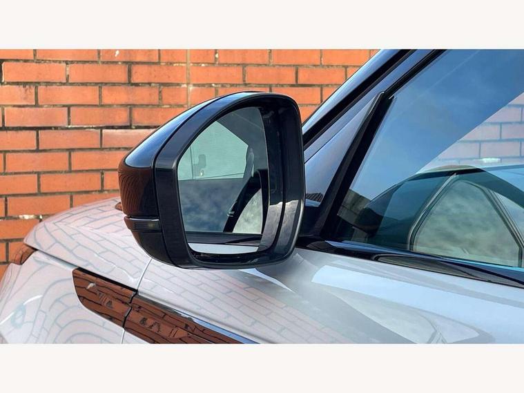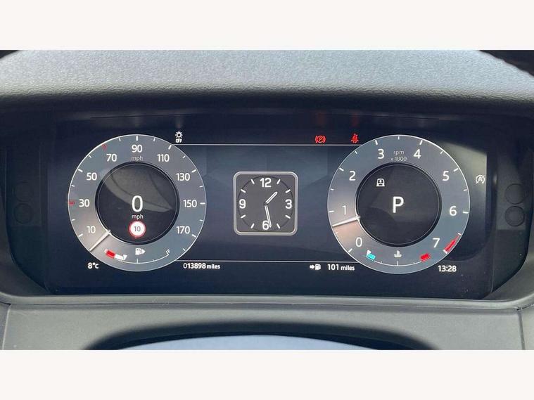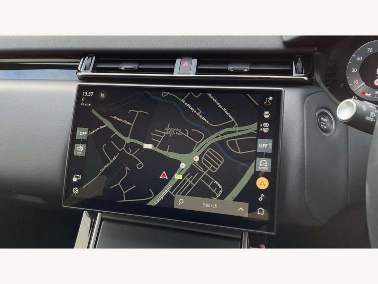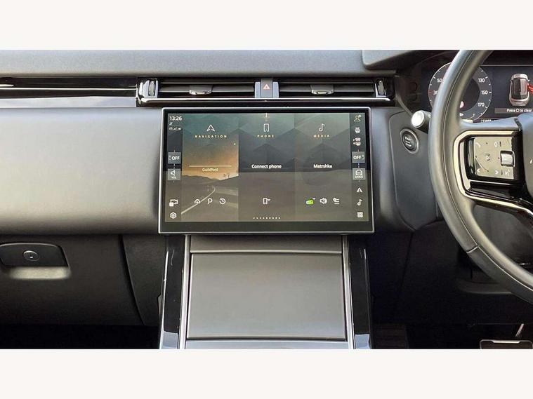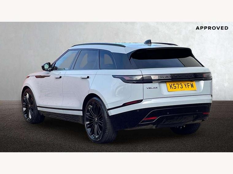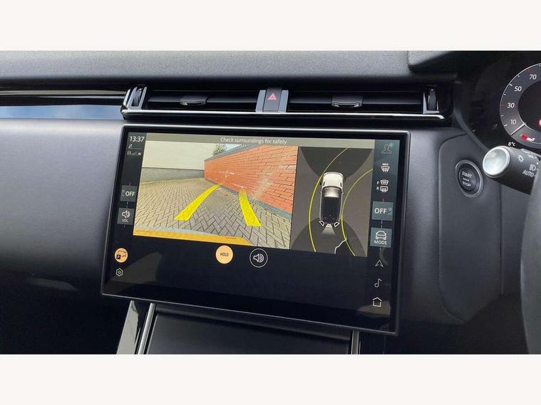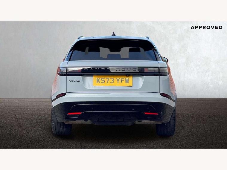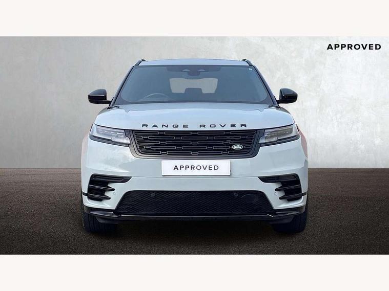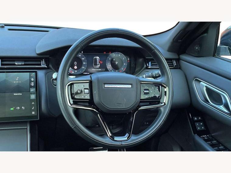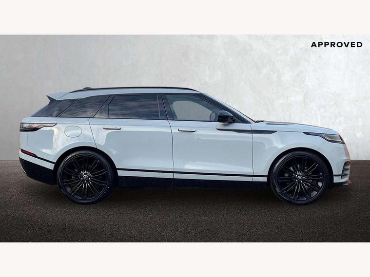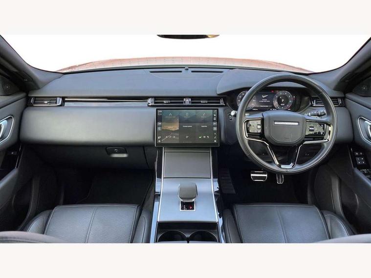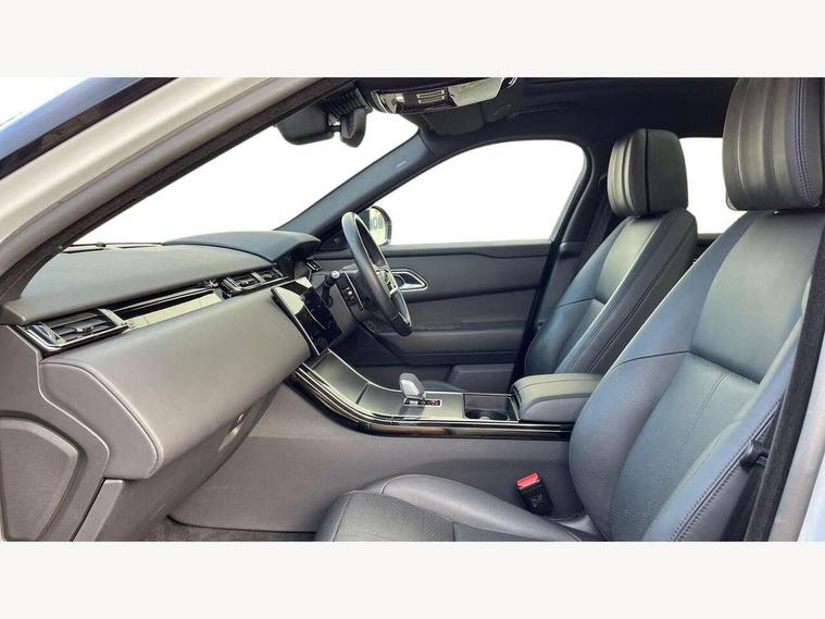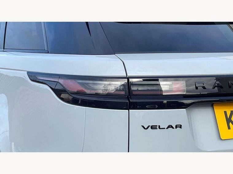 Adaptive cruise control with steering assist, Android Auto, Apple CarPlay, Blind spot assist, Bluetooth connectivity, Brake pad wear indicator warning light, Driver condition monitor, eCall emergency call system, Front and rear parking aid, InControl remote, Land Rover InControl apps, Lane keep assist, Pivi pro with connected navigation, Rear collision monitor, Rear traffic monitor, Service indicator, Speed proportional electronic power assisted steering (EPAS), Traffic sign recognition with adaptive speed limiter, Trip computer, Voice control system, Wireless device charging, 8 speed automatic transmission, Adaptive dynamics, All terrain progress control, Electronic air suspension, Open differential with torque vectoring by braking, Single speed transfer box, DAB radio, Steering wheel mounted controls, 3rd brake light, Acoustic laminated windscreen, Auto dimming interior rear view mirror, Automatic headlamp levelling, Automatic headlights, Body coloured bumpers, Boot protection plate, Electric windows with one touch open/close and anti trap, Flush deployable exterior door handles, Follow me home headlights, Heated rear window with timer, Heated washer jets, Metal front tread plates, Metal load space scuff plates, Pixel LED headlights with signature DRL, Power fold, auto-dimming, heated door mirrors with memory and approach lights, Rain sensor windscreen wipers, Rear animated directional indicators, Rear fog lights, Rear side wing doors, Rear wash/wipe, Tailgate/boot lid spoiler, Trailer stability assist, Velar badge, 3 seat bench in 2nd row, Ambient lighting, Bright metal pedals, Carpet mats, Driver/passenger sunvisors with illuminated vanity mirrors, Ebony morzine headlining, Electrically adjustable steering column, Extended leather upgrade, Heated steering wheel, Isofix system on outer rear seats, Loadspace cover, Overhead lighting console, Overhead stowage for sunglasses, Passive front headrests, Rear air vents, Rear centre headrest, Single front passenger seat, Twin front cupholders, Twin sliding front centre armrest, Online pack with data plan - Velar, Power socket pack 2 - Velar, 355mm Front and 325mm Rear brakes, 3x3 point rear seatbelts, Anti-lock braking system (ABS), Cornering brake control, Curtain airbags, Customer configurable autolock, Door side intrusion beams, Driver airbag, DSC - Dynamic Stability Control, Electronic brake force distribution, Electronic parking brake, Electronic traction control, Emergency braking, Front and rear seatbelt reminder, Hill descent control, Hill launch assist, Low traction launch, Passenger airbag, Power operated child locks, Rear airbags, Roll stability control, Side airbags, Tyre pressure monitoring system (TPMS), Global lock and unlock switch on driver door, Immobiliser, Intrusion sensor, Keyless entry, Lock only switch on front passenger door, Locking wheel nuts, Perimetric alarm, Remote central locking, All season tyres,