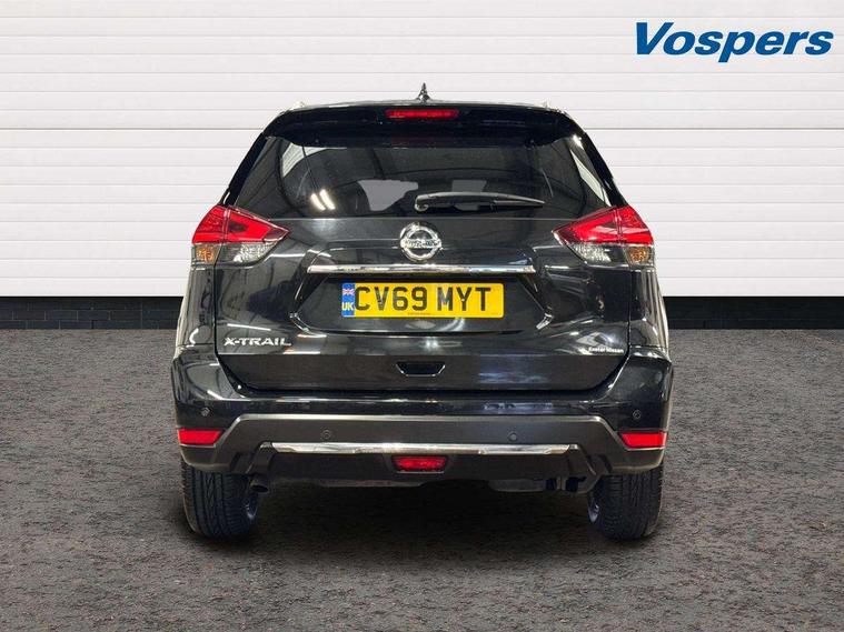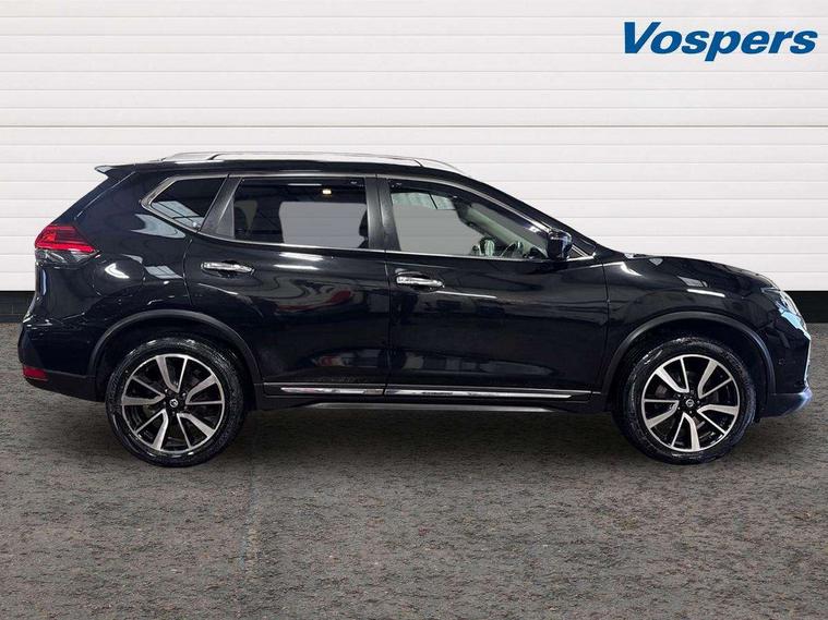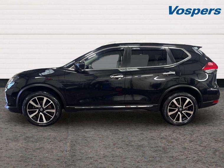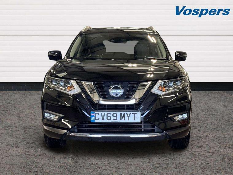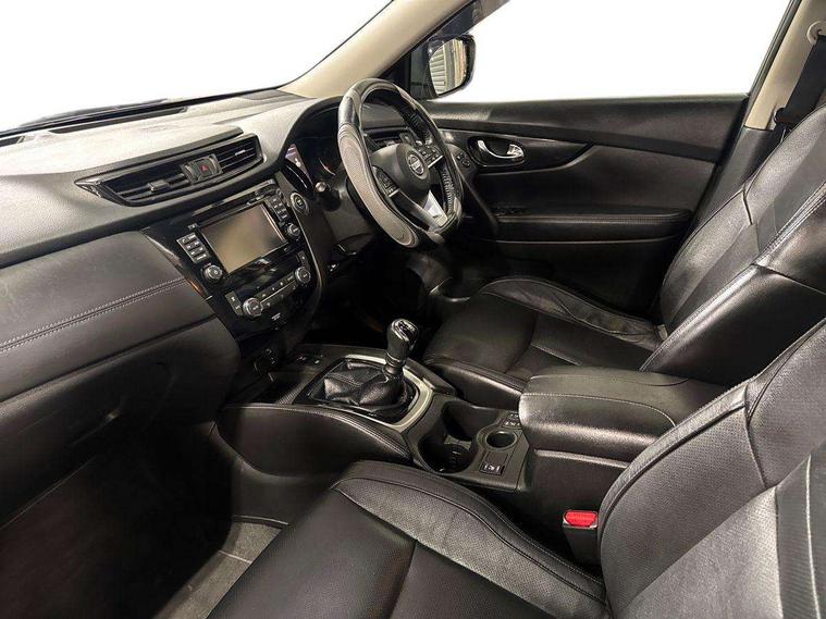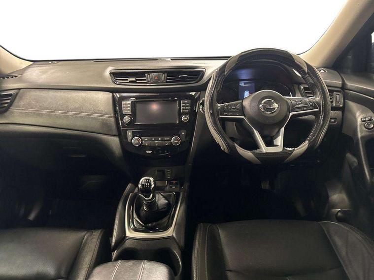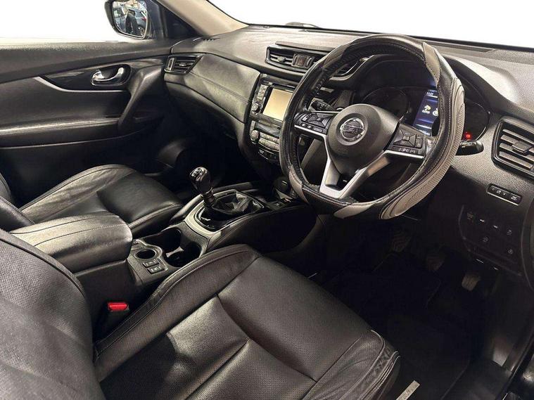 5" TFT driver information centre, Automatic tailgate opening, Blind spot monitoring, Bluetooth phone integration system, Driver attention alert system, Front and rear parking sensors, Intelligent around view monitor, Intelligent parking assist, Lane departure warning system, Moving object detection, Nissan connect evo 7" touchscreen navigation and entertainment system, PAS, Push button start, Stand still assist auto hold function, Traffic sign recognition, Trip computer, Nissan chassis control (intelligent ride control, intelligent trace control, intelligent engine brake), 6 speakers, DAB Digital radio, Radio/CD, Smartphone apps, Steering wheel mounted audio controls, USB/aux input socket, Adaptive front lighting system, Anti dazzle rear view mirror, Automatic headlights, Automatic rain sensing wipers, Black honeycomb front grille, Body colour door mirrors, Chrome door handles, Chrome side mouldings, Chrome window surround, Electric folding door mirrors, Electric heated door mirrors, Front and rear electric windows, Front fog lights, LED daytime running lights, LED Headlights, Panoramic sunroof with one touch shade, Rear privacy glass, Satin silver roof rails, Shark fin roof aerial, 3 rear headrests, 60/40 split rear bench seat, Centre console storage box/armrest, Configurable luggage board system, Driver's electric lumbar adjustment, Dual zone climate control, Electric adjustable front seats including height adjust, Front and rear door pockets with bottle holders, Front cupholders, Front/rear armrests, Heated front seats, Heated rear seats, Height adjustable front headrests, Individual rear reading lights, Isofix child seat attachment, Leather D shaped steering wheel, Leather steering wheel and gear knob, Pollen filter, Tilt/telescopic adjustable steering wheel, 3 point seatbelts on all seats, 6 airbags - Driver, front passenger, curtain and side airbags, ABS, Child locks on rear doors, EBD + Brake Assist, Electric parking brake, ESP + traction control, Intelligent emergency braking with pedestrian recognition, Seatbelt warning, Tyre pressure monitoring system, Immobiliser, Intelligent Key, Remote central locking, Thatcham Cat.1 alarm, Full size spare wheel,