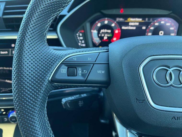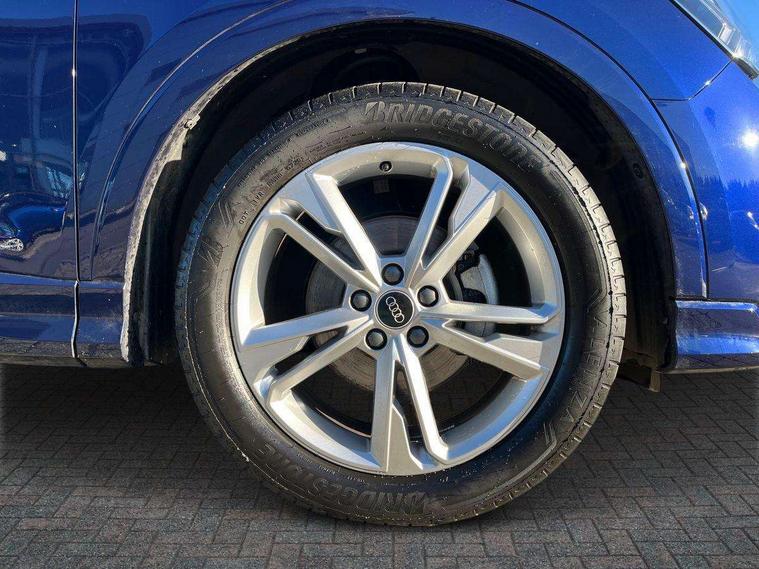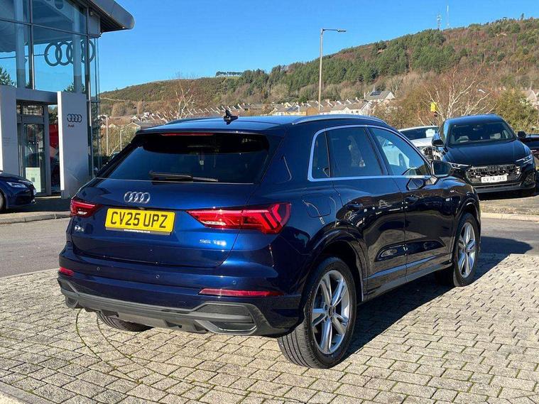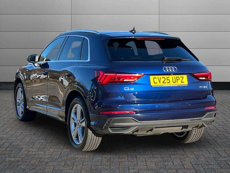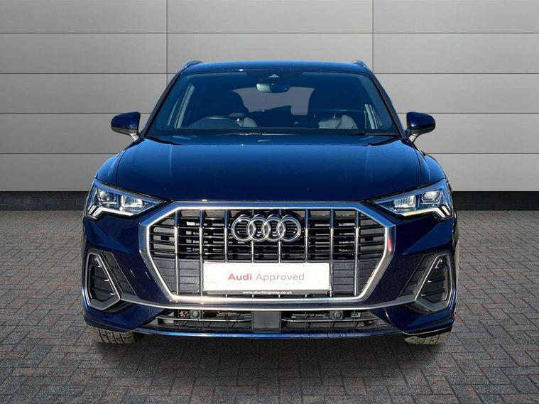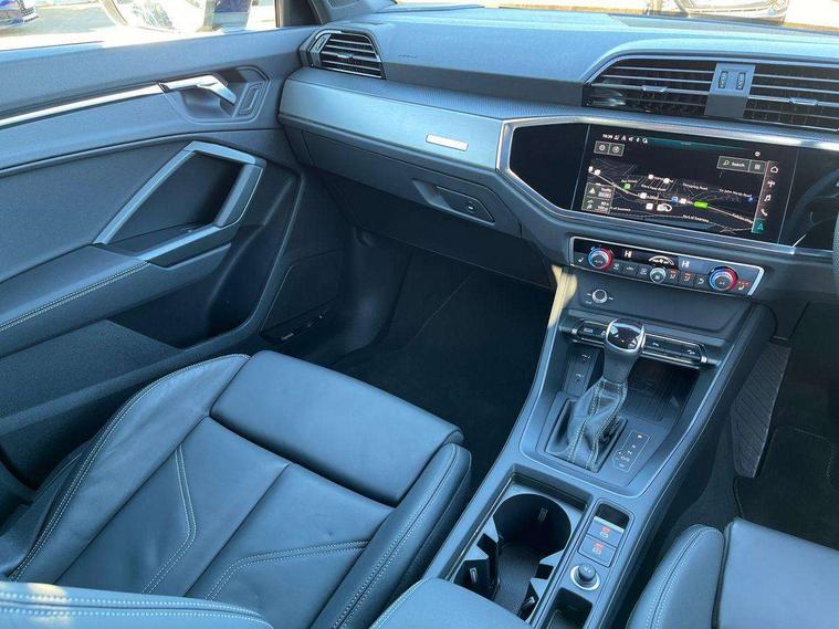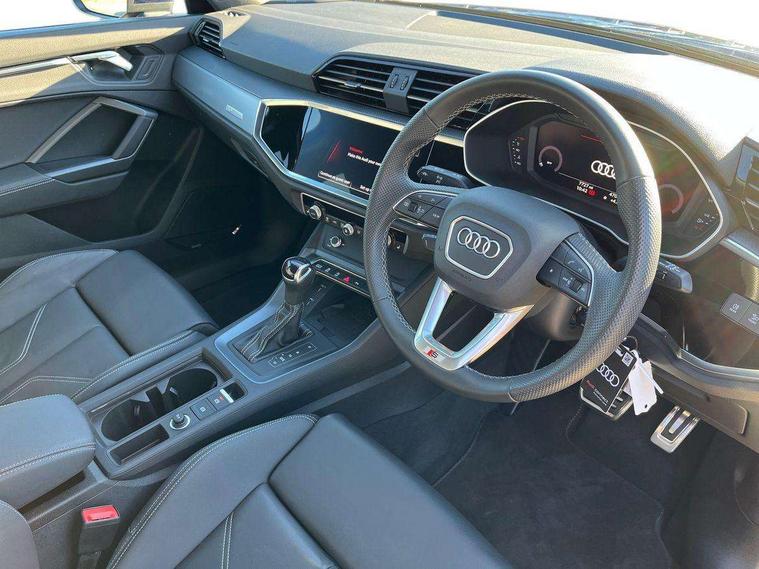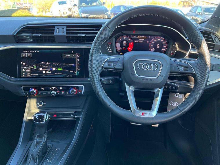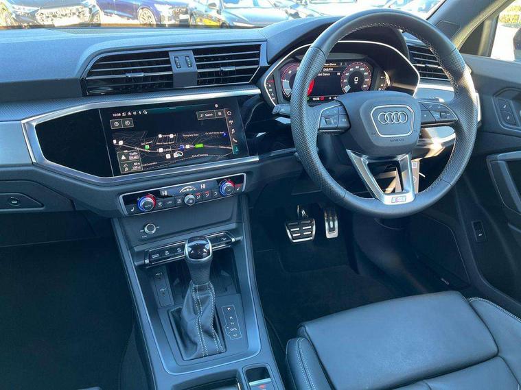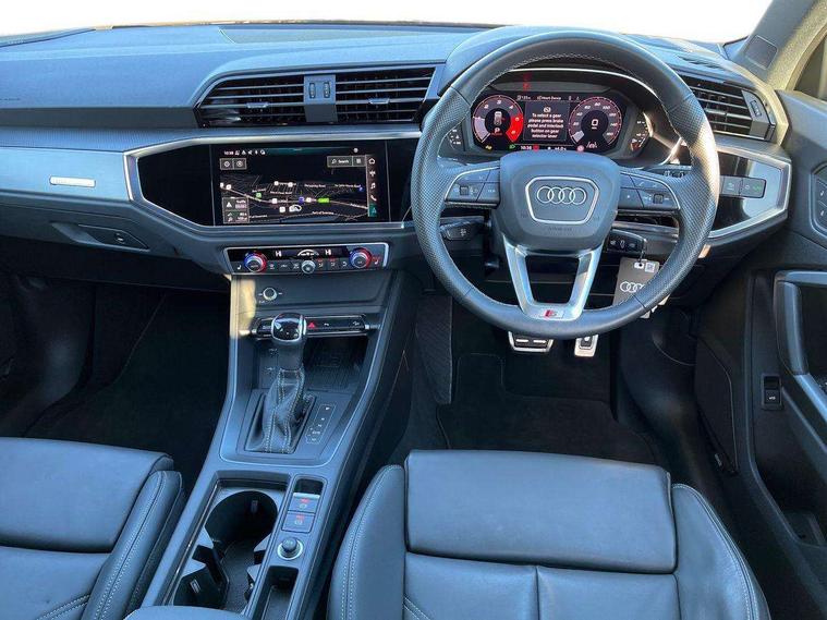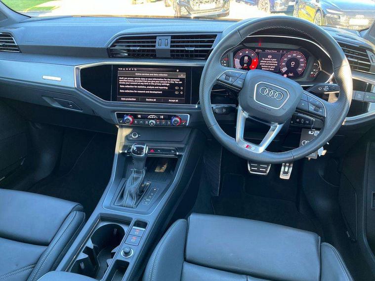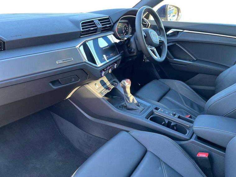 Amazon alexa Integration, Audi connect safety and service, Audi drive select, Audi lane departure warning, Audi Virtual Cockpit - 10.25" display, Bluetooth interface, Camera based traffic sign recognition, Distraction and Fatigue warning, Legal emergency call, MMI Navigation Plus with high resolution 10.1 inch touchscreen colour display, Power operated tailgate, Progressive steering, Service interval indicator, Smartphone interface includes wireless Apple carplay/Android Auto, Start stop system with recuperation, Voice control system with natural language interaction, Diesel particulate filter, Sports suspension, 2 USB-C ports with charge and data functions, 6 passive loudspeakers, DAB digital radio module, Acoustic windscreen, Aluminium roof rails, Aluminium window trim, Anthracite black radiator grille, Auto dimming door mirrors, Auto dimming frameless rear view mirror, Body colour front spoiler blade, Electrically folding, adjustable and heated door mirrors with integrated LED side indicators and kerb view function for passenger side, Front and rear electric windows, Front fog lights, Front side air inlets in matt platinum grey, Grille vertical bars in aluminium silver/Matt, High gloss black finish B and C pillars, LED Dynamic rear indicators, LED headlights with LED daytime running lights, LED rear lights, LED third brake light, Privacy glass dark tinted rear and rear-side windows (from B-pillar backwards), Rain and light sensors, Rear diffuser grille in grained matt black, Rear diffuser strip in matt anthracite black, Rear side wing doors, Rear wiper, S line badges on front wings, S line front and rear bumpers and side skirts in contrasting Manhattan grey paint finish, Side skirt insert in matt Platinium grey, Variable front intermittent wipers, 12V socket in rear centre console, 3 seat bench in 2nd row, 3 spoke leather multifunction steering wheel features S badging and grips in perforated leather with contrast stitching, 40:20:40 folding with manual adjustment for 60:40 forwards/backwards position and backrest angle, Adjustable rear seat bench/backrest with centre armrest and cupholder, Black cloth headlining, Dual zone electronic climate control, Electric lumbar support, Front and rear black floor mats with contrast stitching in rock grey, Front and rear headrests, Front centre armrest, Height and reach adjustable steering wheel, Illuminated door sill trims with S logo, ISOFIX child seat mounting for front passenger with airbag deactivation and outer rear seat including top tether attachment point for outer rear seats, Manual front seats with height adjustment, Perforated leather gearknob, Single front passenger seat, Stainless steel luggage compartment sill finisher, Stainless steel pedals, Twin leather upholstery with front sport seats + S embossing, Non smoking pack - Q3, 3x3 point rear seatbelts, 6 airbags - Driver, front passenger, curtain and side windows, Audi pre-sense front with pedestrain and cyclist recognition, Electrically operated child locks on rear doors, Electromechanical parking brake, Electronic stabilisation control including ABS, ASR and EDL, Front seatbelt reminder, Hill descent control, Hill hold assist, Pre sense basic, Seatbelt monitoring, Tyre pressure warning, Warning triangle and first aid kit, Anti theft wheel bolts, Immobiliser, Remote central locking, Thatcham approved category 1 anti theft alarm, Aluminium look interior elements, Dark matt brushed aluminium inlay, Detail dashboard around MMI touch colour display in glass look, black with surround in aluminium look, Leatherette door armrest,