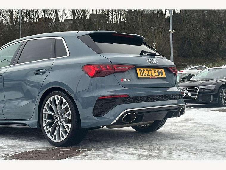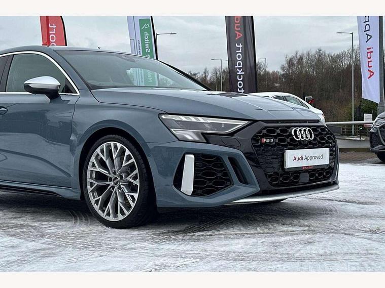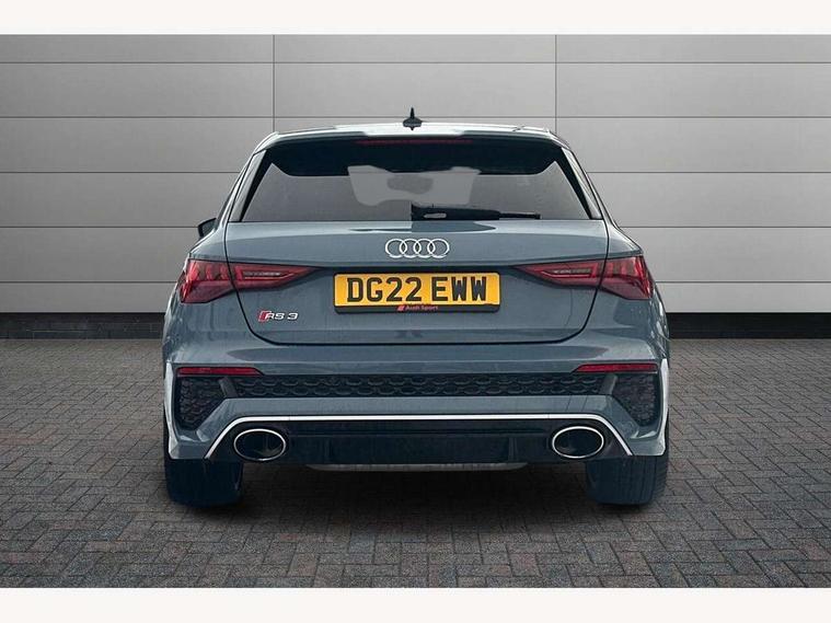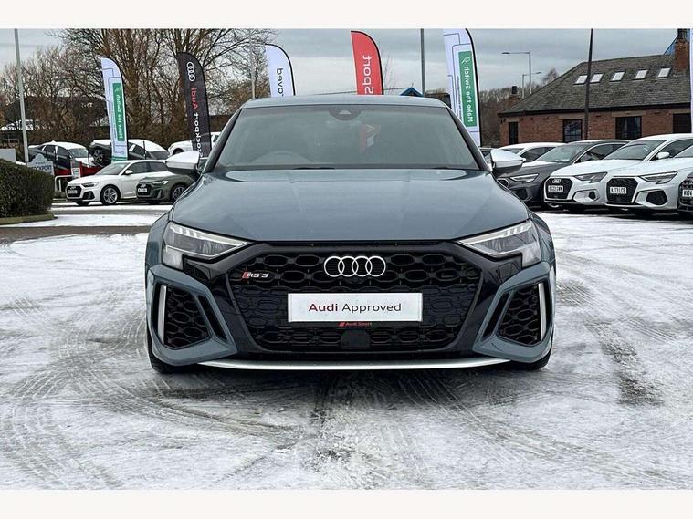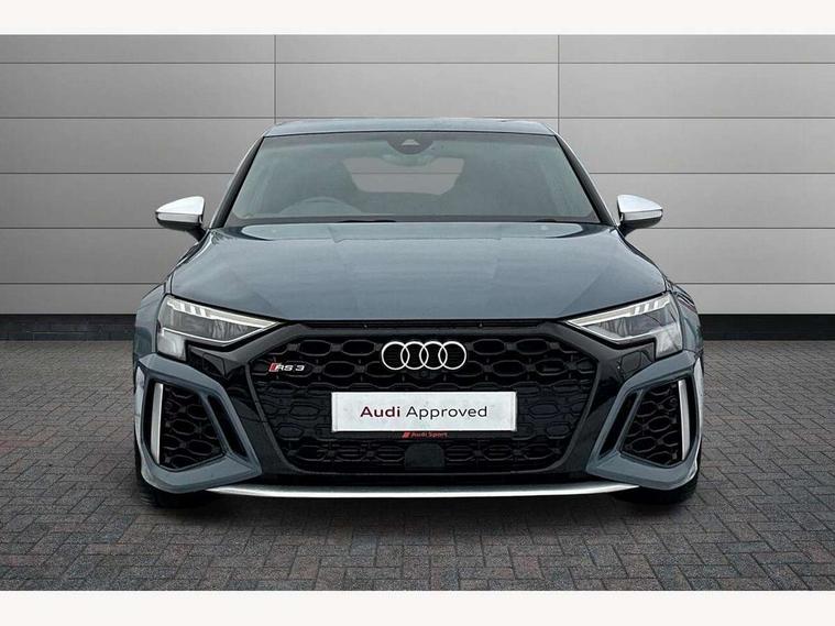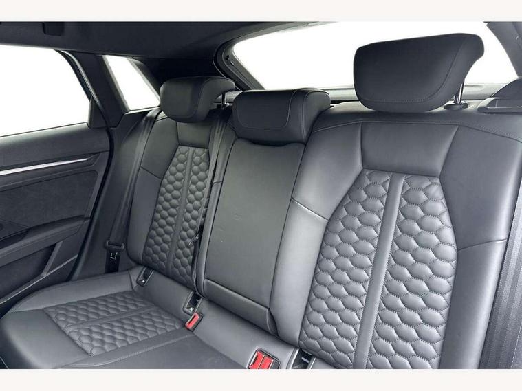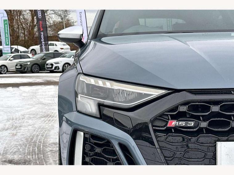 Audi connect emergency call and service, Audi smartphone interface, Audi virtual cockpit with RS specific display 12.3" full colour digital instrument cluster, Automatic start/stop system with recuperation, Bluetooth interface, Collision avoidance assistant, Lane departure warning system, Legal emergency call, Manual boot opening, Parking assist with parking system plus, Progressive power assisted steering, Quattro permanent four wheel drive, Rear suspension, Audi sound system impressive sound with 10 loudspeakers including centre speaker and subwoofer, 6-channel amplifier with a total output of 180 watts, DAB Digital radio, 3rd brake light, Acoustic glass windscreen, Audi beam uses LEDs to project the Audi sport logo onto the ground as you exit your RS 3, Auto dimming rear view mirror, Black side skirts, Body colour roof, Door mirrors - electrically adjustable, heated, folding and auto dimming on both sides, Headlight washers, LED headlights with LED rear lights + dynamic rear indicators, Light and rain sensors, Matt aluminium door mirrors, Matt aluminium window trims, Privacy glass - dark tinted rear and rear side windows from B-pillar backwards, Rear window wiper and washer system, 40/20/40 split folding rear seat bench, Black cloth headlining, Dual zone electronic climate control, Front and rear headrests, Front centre armrest, Front sports seats RS embossed logo, Front/rear floor mats, Heated front seats, Honeycomb stitching and RS embossing, Illuminated door sill trims inlays in aluminium with RS 3 logo, Manually adjustable front seats, RS emblems, Stainless steel pedals and front footrest in black, Aluminium interior elements pack - RS3, Ambient lighting pack - RS3, MMI navigation plus with MMI touch - RS3, RS bodystyling - RS3, Storage Pack - RS3, 3x3 point rear seat belts, ABS/EBD, ASR, Audi pre sense front, Driver/Front Passenger airbags, EDL, ESC - Electronic Stability Control + traction control, Front passenger airbag deactivation, Front side airbags with head airbags and interaction airbag, Hill hold assist, Seat belt reminder with passenger presence detection in rear, Tyre pressure loss indicator, Warning triangle and first aid kit, Anti theft alarm, Anti-theft wheel bolts, Electronically operated child lock, Remote control central locking, Carbon inlays, accent surfaces in the dashboard and centre console in platinum grey silk effect paint finish, 19" 10 Y spoke platinum grey, gloss turned finish alloy wheels, Tool kit, Tyre repair kit,