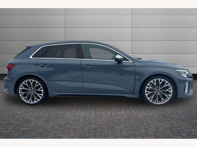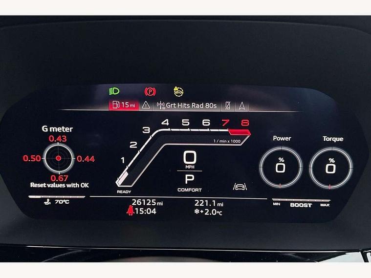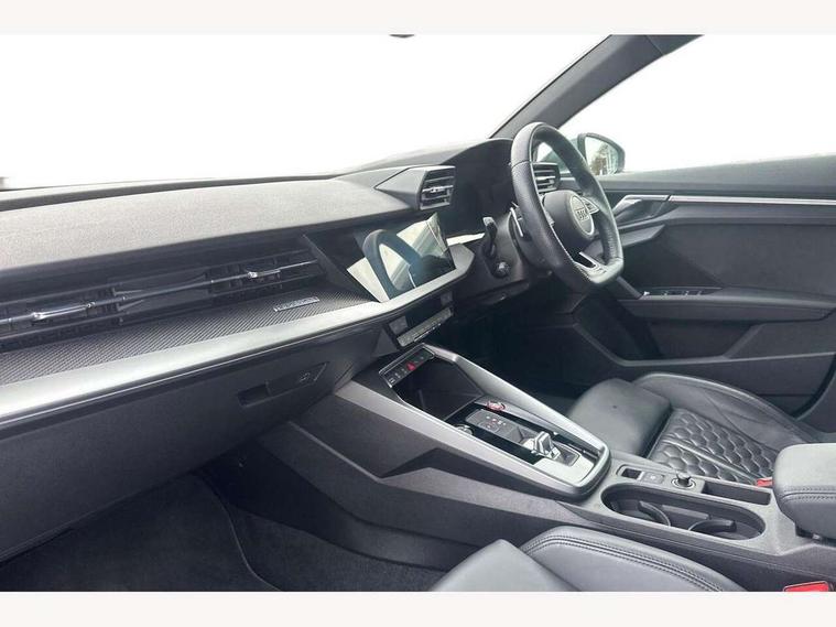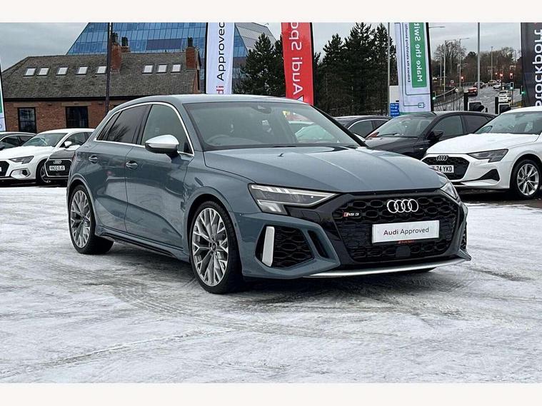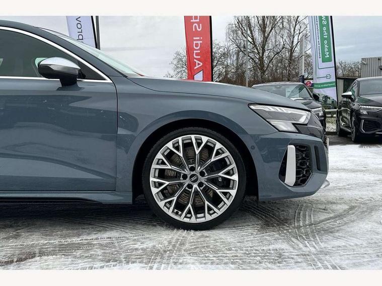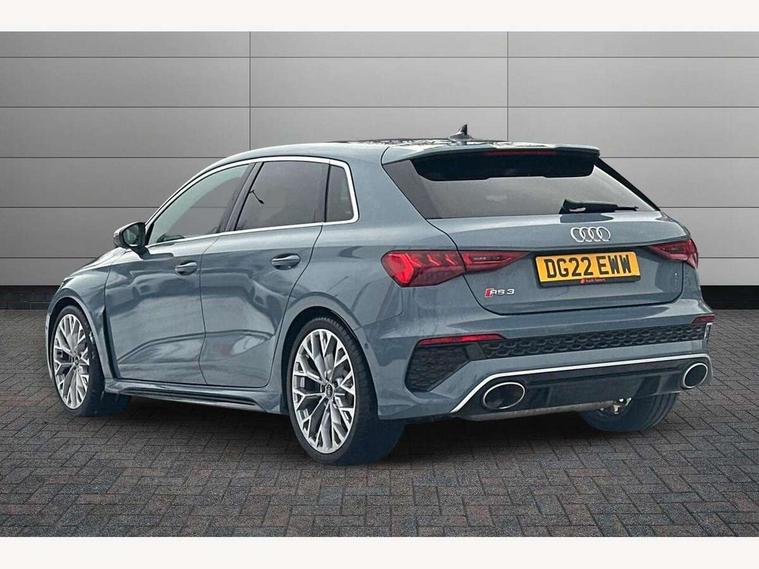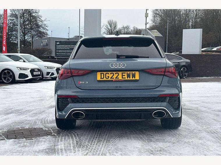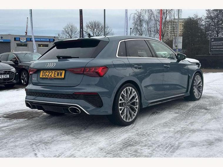 Audi connect emergency call and service, Audi smartphone interface, Audi virtual cockpit with RS specific display 12.3" full colour digital instrument cluster, Automatic start/stop system with recuperation, Bluetooth interface, Collision avoidance assistant, Lane departure warning system, Legal emergency call, Manual boot opening, Parking assist with parking system plus, Progressive power assisted steering, Quattro permanent four wheel drive, Rear suspension, Audi sound system impressive sound with 10 loudspeakers including centre speaker and subwoofer, 6-channel amplifier with a total output of 180 watts, DAB Digital radio, 3rd brake light, Acoustic glass windscreen, Audi beam uses LEDs to project the Audi sport logo onto the ground as you exit your RS 3, Auto dimming rear view mirror, Black side skirts, Body colour roof, Door mirrors - electrically adjustable, heated, folding and auto dimming on both sides, Headlight washers, LED headlights with LED rear lights + dynamic rear indicators, Light and rain sensors, Matt aluminium door mirrors, Matt aluminium window trims, Privacy glass - dark tinted rear and rear side windows from B-pillar backwards, Rear window wiper and washer system, 40/20/40 split folding rear seat bench, Black cloth headlining, Dual zone electronic climate control, Front and rear headrests, Front centre armrest, Front sports seats RS embossed logo, Front/rear floor mats, Heated front seats, Honeycomb stitching and RS embossing, Illuminated door sill trims inlays in aluminium with RS 3 logo, Manually adjustable front seats, RS emblems, Stainless steel pedals and front footrest in black, Aluminium interior elements pack - RS3, Ambient lighting pack - RS3, MMI navigation plus with MMI touch - RS3, RS bodystyling - RS3, Storage Pack - RS3, 3x3 point rear seat belts, ABS/EBD, ASR, Audi pre sense front, Driver/Front Passenger airbags, EDL, ESC - Electronic Stability Control + traction control, Front passenger airbag deactivation, Front side airbags with head airbags and interaction airbag, Hill hold assist, Seat belt reminder with passenger presence detection in rear, Tyre pressure loss indicator, Warning triangle and first aid kit, Anti theft alarm, Anti-theft wheel bolts, Electronically operated child lock, Remote control central locking, Carbon inlays, accent surfaces in the dashboard and centre console in platinum grey silk effect paint finish, 19" 10 Y spoke platinum grey, gloss turned finish alloy wheels, Tool kit, Tyre repair kit,