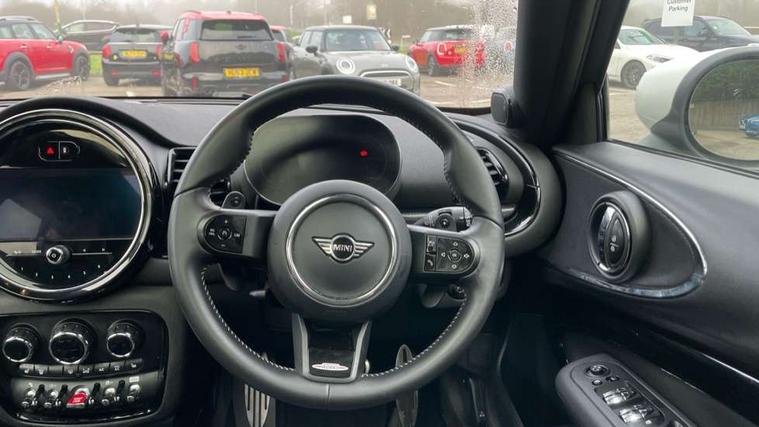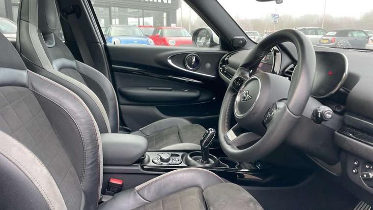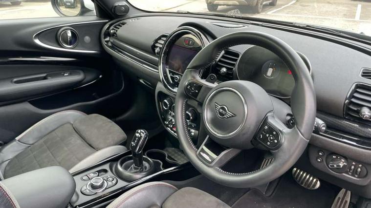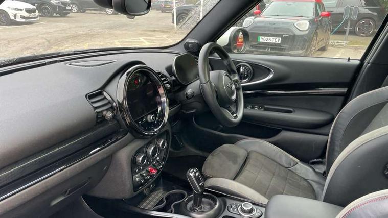 Active Guard incl speed limiting and lane departure functions with auto steering, and front collision warning with brake intervention, Automatic start/stop function with brake energy recuperation, Compatible mobile phone bluetooth with audio streaming, Digital cockpit, Electro-mechanical speed dependant steering assistance, Instrument cluster, Mini E-call, MINI TeleServices, On board computer, Rear parking distance control, Double Vanos system, Fully variable valve control, High precision injection, Performance Control, Steptronic sport transmission with double clutch and steering wheel paddles, FM tuner and DAB digital radio, Bonnet scoop, Chrome fuel filler cap, Dynamic brake lights, Electric windows, Heated rear window, Heated windscreen washer jets, John Cooper Works - aerodynamic kit (front and rear apron, spoiler), front and rear sport bumpers and part-painted side sills with door sill finishers, John Cooper Works rear spoiler, LED headlights with closed ring as daytime driving lights, LED rear light with union jack design, Metal door sill strips with Cooper S imprint, Model logo, Model logo on rear doors, Radiator grille, Rain sensor with auto headlights, Rear fog lights, Rear window wiper, Side scuttle panel with integrated indicator, Split rear doors, Sun/heat protection glass, Twin exhaust tailpipe, White indicator lenses, 12V Accessory socket in centre console, 360L luggage compartment capacity, 4 lashing eyes in luggage compartment, 60/40 split folding rear seat, Anthracite headlining with grab handles and clothes hooks, Chrome interior highlights, Cupholders, English handbook, Glove compartment, Height and length steering column adjustment, Interior lighting with 12 basic colours selectable via toggle switch in roof, Isofix rear child seat preparation, John Cooper Works perforated leather steering wheel with contrast stitching in chilli red and John Cooper Works logo, John Cooper Works sports seat with integrated headrest, adjustable thigh support and John Cooper Works logo, Leather gearshift lever and handbrake gaiters, LED reading lights, vanity mirror lights, front foot well light and spotlight on front seats, Manual air conditioning, Multifunction steering wheel, Storage compartments in doors, Sunvisors with vanity mirrors, Toolkit, Excitement pack - Clubman, Navigation pack - Clubman, 2 tone horn, 3 point seatbelts on all seats, 6 Airbags - front, side, head and seat belt tensioners, Anti-lock braking system (ABS), DSC - Dynamic Stability Control, Electronic handbrake, Front and rear disc brakes, Tyre pressure monitoring system, Alarm system with tilt sensor, monitoring doors, bonnet interior and tailgate, Auto drive away locking, Deadlocking function, Electronic vehicle immobiliser, Locking wheel bolts, Start/stop toggle with keyless go,