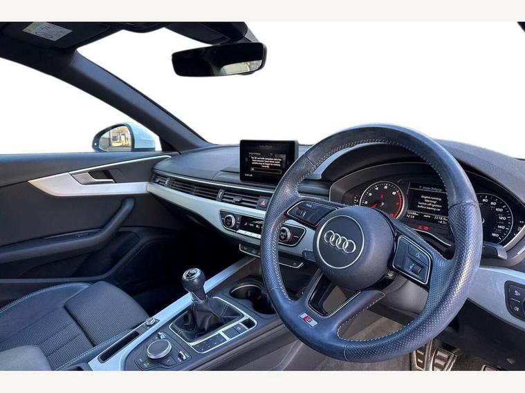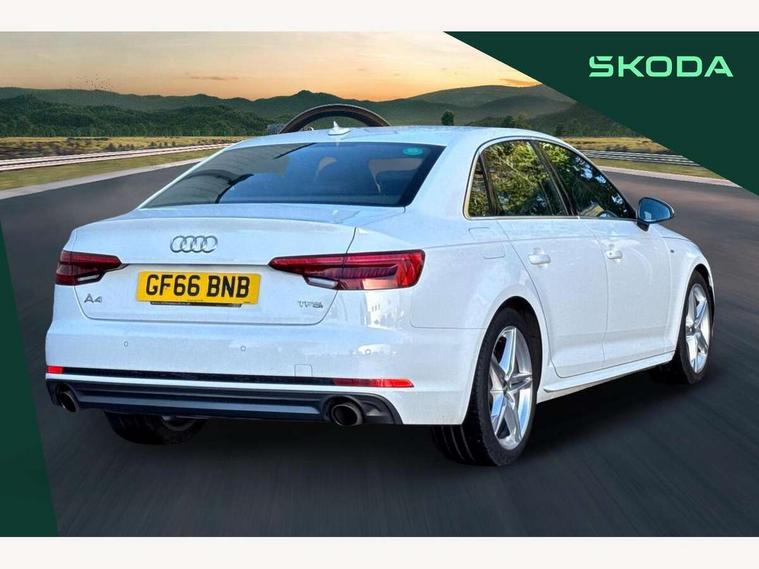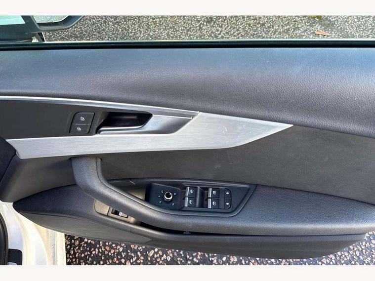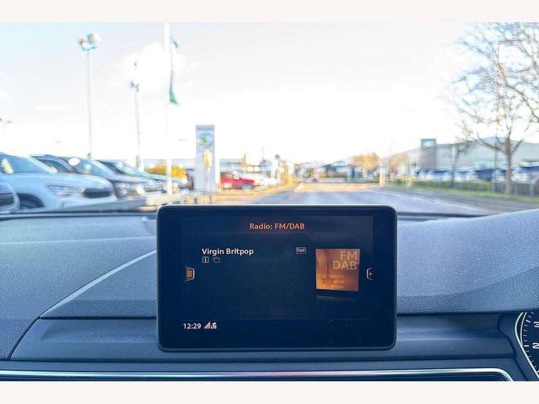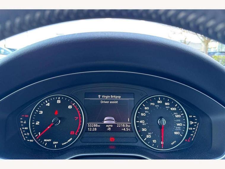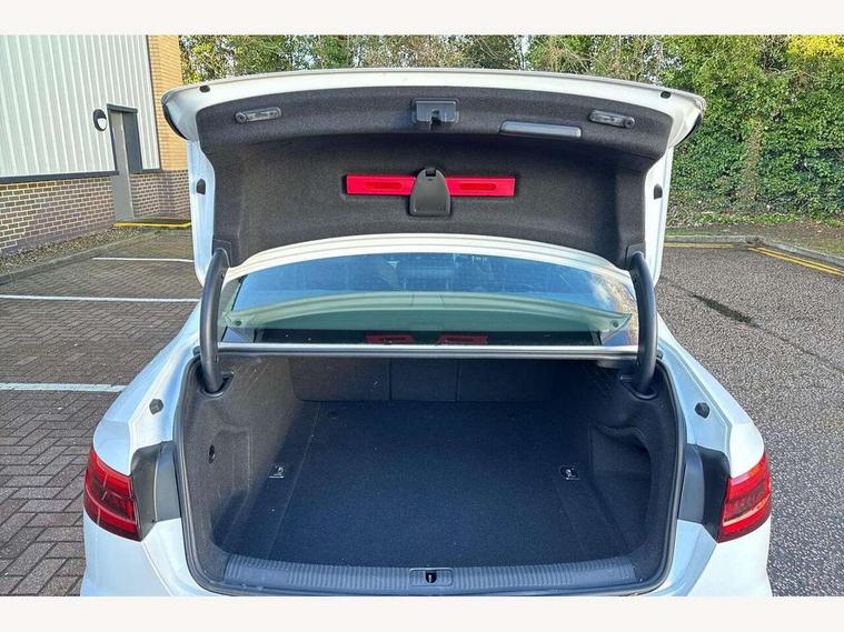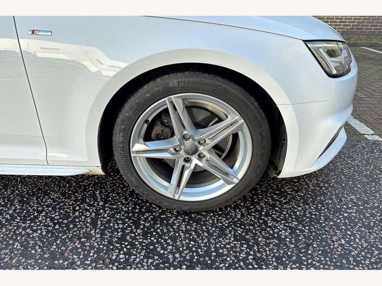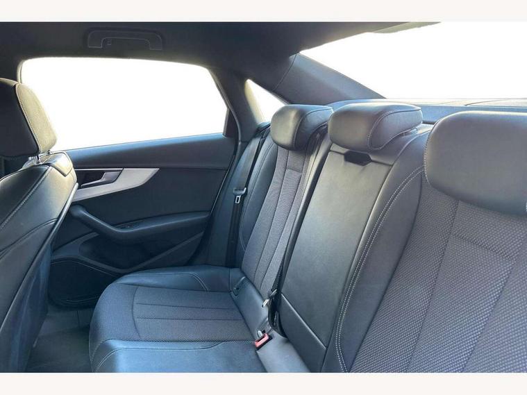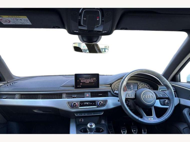 Audi drive select, Audi Pre sense collision avoidance, Audi smartphone interface, Auto boot lid opening, Electro-mechanical PAS, Service interval indicator, Stop/start button, Voice control system, 2 USB ports, Aux input, DAB digital radio module, MMI radio plus with CD player, Acoustic windscreen, Air inlets in titan black with two horizontal inlays in chrome, Auto dimming rear view mirror, Automatic headlights + automatic windscreen wipers, Body colour bumpers, Chrome door handles, Chrome rolled exhaust, Electric adjustable heated door mirrors, Electric front windows, Electric rear windows, Headlight range control, LED daytime running lights, LED indicators in door mirrors, Rear diffuser in Twilight grey matt, Roof spoiler, 3 zone climate control, Black cloth headlining, Front centre armrest with 12v socket, Front sport seats, Front/rear floor mats, Illuminated door sill finishers, Isofix child seat preparation for front passenger/outer rear seats inc passenger airbag deactivation, Jack and tool kit, Perforated leather gearknob, Reach + rake adjustable steering column, Rear headrests, Split folding rear seats, Stainless steel foot rest, Stainless steel pedals, Sunvisors with vanity mirrors, Top tether anchor plate for isofix child seat, S line exterior styling pack - A4 Saloon, 3 point seatbelts on all rear seats, ABS/EBD, Adaptive driver and front passenger airbags, Electromechanical parking brake, ESP, First aid kit, Front head airbags, Front seatbelt pretensioners + load limiters, Front side airbags, Seatbelt warning, Traction control, Tyre pressure monitoring system, Warning triangle, Keyless Start, Locking wheel bolts, Remote central locking, Thatcham category 1 alarm + immobiliser, Space saver spare wheel,