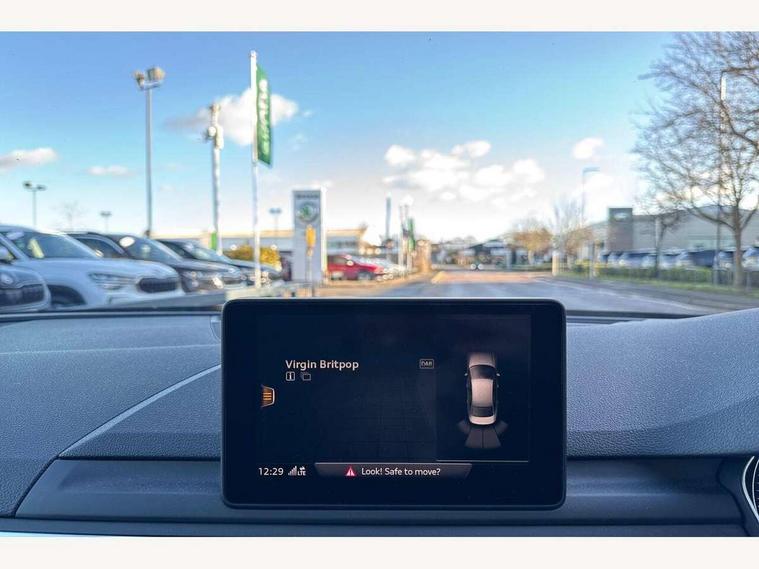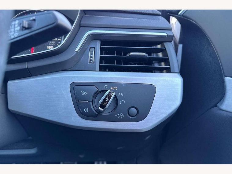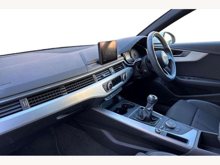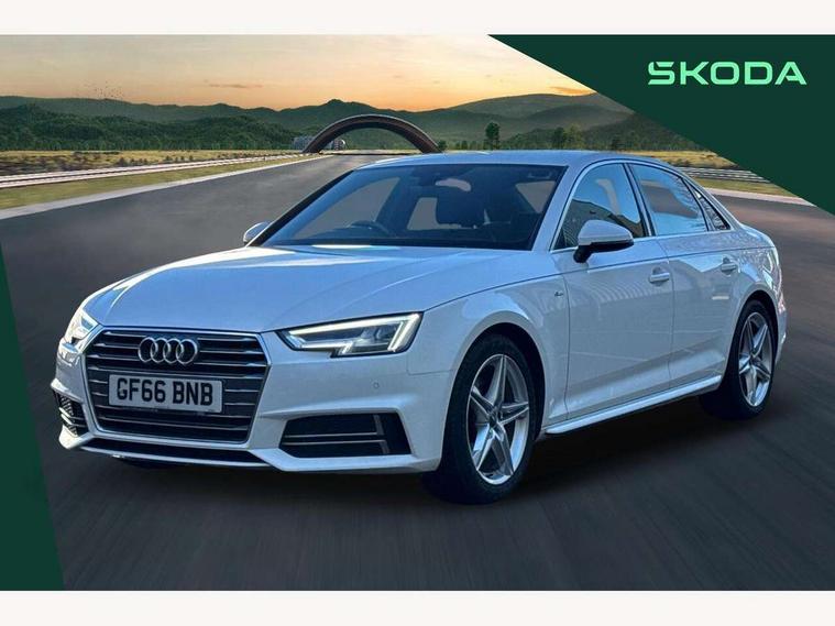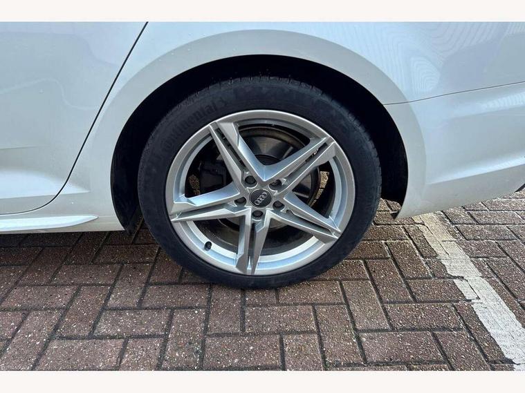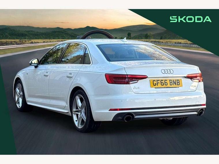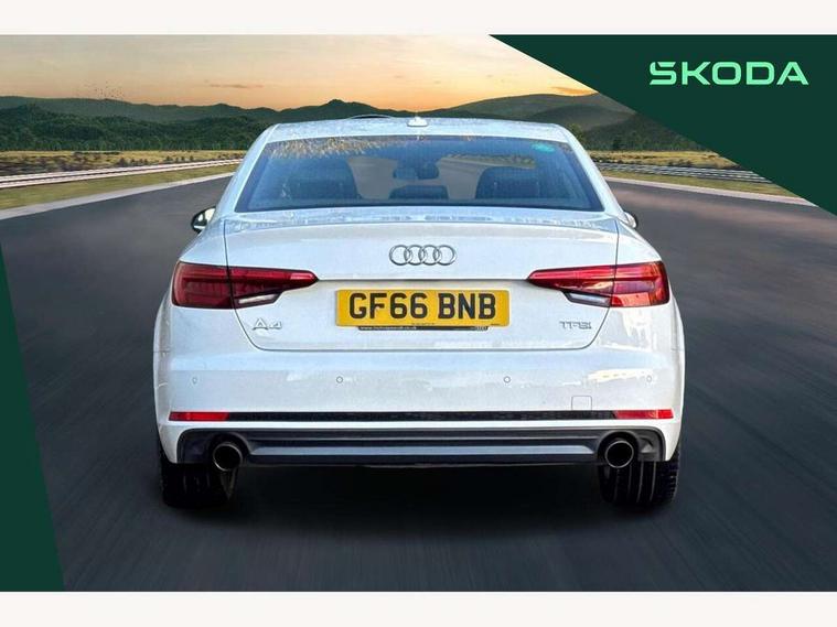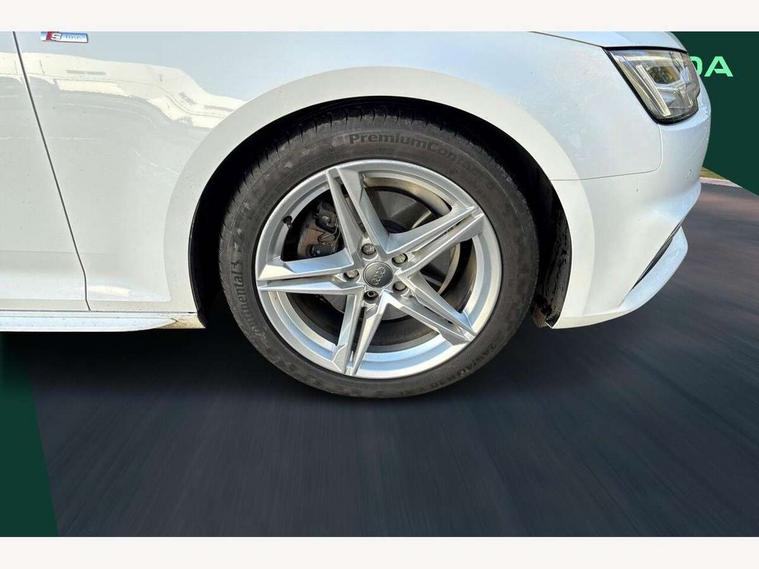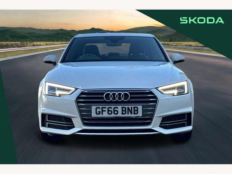 Audi drive select, Audi Pre sense collision avoidance, Audi smartphone interface, Auto boot lid opening, Electro-mechanical PAS, Service interval indicator, Stop/start button, Voice control system, 2 USB ports, Aux input, DAB digital radio module, MMI radio plus with CD player, Acoustic windscreen, Air inlets in titan black with two horizontal inlays in chrome, Auto dimming rear view mirror, Automatic headlights + automatic windscreen wipers, Body colour bumpers, Chrome door handles, Chrome rolled exhaust, Electric adjustable heated door mirrors, Electric front windows, Electric rear windows, Headlight range control, LED daytime running lights, LED indicators in door mirrors, Rear diffuser in Twilight grey matt, Roof spoiler, 3 zone climate control, Black cloth headlining, Front centre armrest with 12v socket, Front sport seats, Front/rear floor mats, Illuminated door sill finishers, Isofix child seat preparation for front passenger/outer rear seats inc passenger airbag deactivation, Jack and tool kit, Perforated leather gearknob, Reach + rake adjustable steering column, Rear headrests, Split folding rear seats, Stainless steel foot rest, Stainless steel pedals, Sunvisors with vanity mirrors, Top tether anchor plate for isofix child seat, S line exterior styling pack - A4 Saloon, 3 point seatbelts on all rear seats, ABS/EBD, Adaptive driver and front passenger airbags, Electromechanical parking brake, ESP, First aid kit, Front head airbags, Front seatbelt pretensioners + load limiters, Front side airbags, Seatbelt warning, Traction control, Tyre pressure monitoring system, Warning triangle, Keyless Start, Locking wheel bolts, Remote central locking, Thatcham category 1 alarm + immobiliser, Space saver spare wheel,