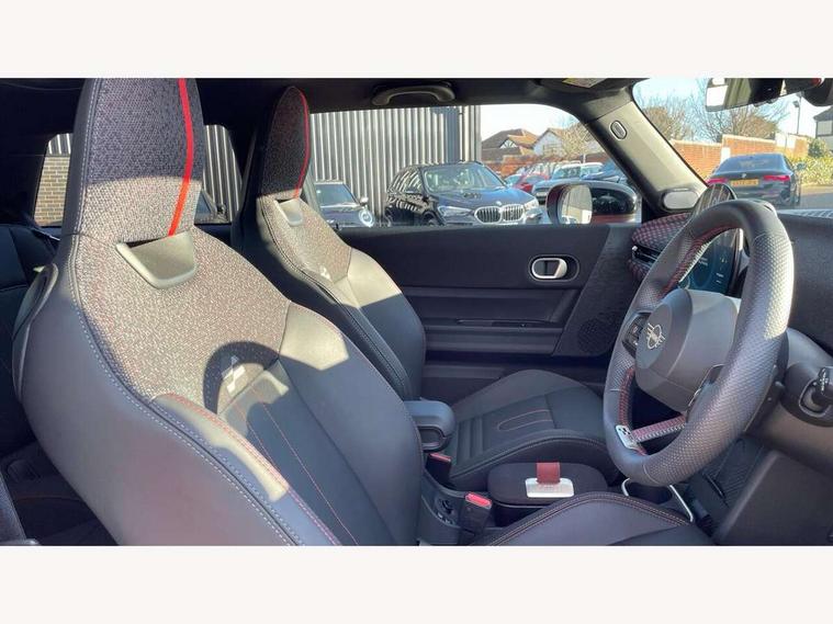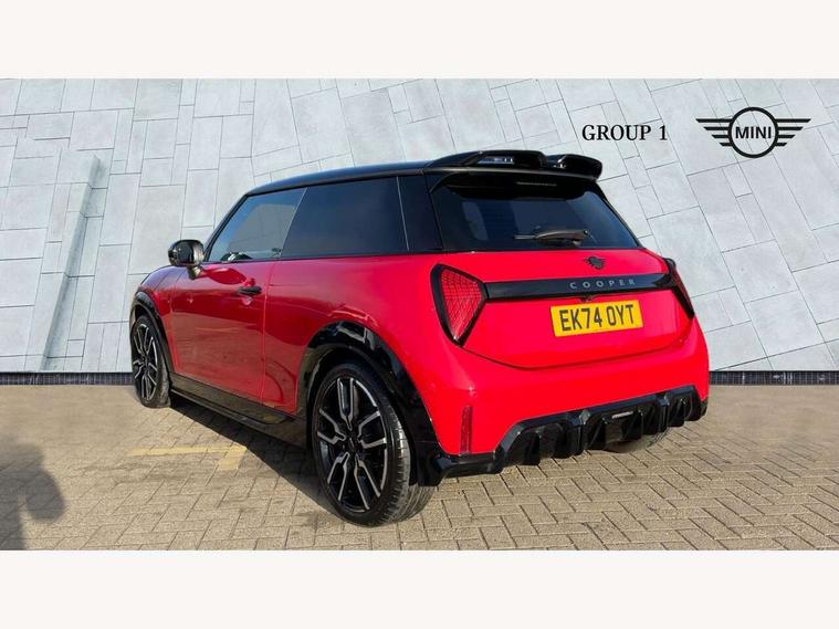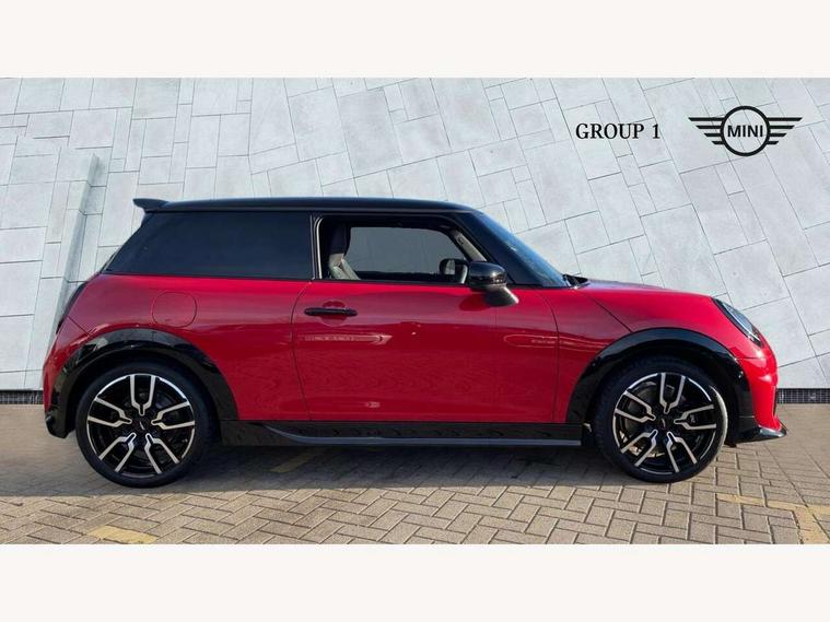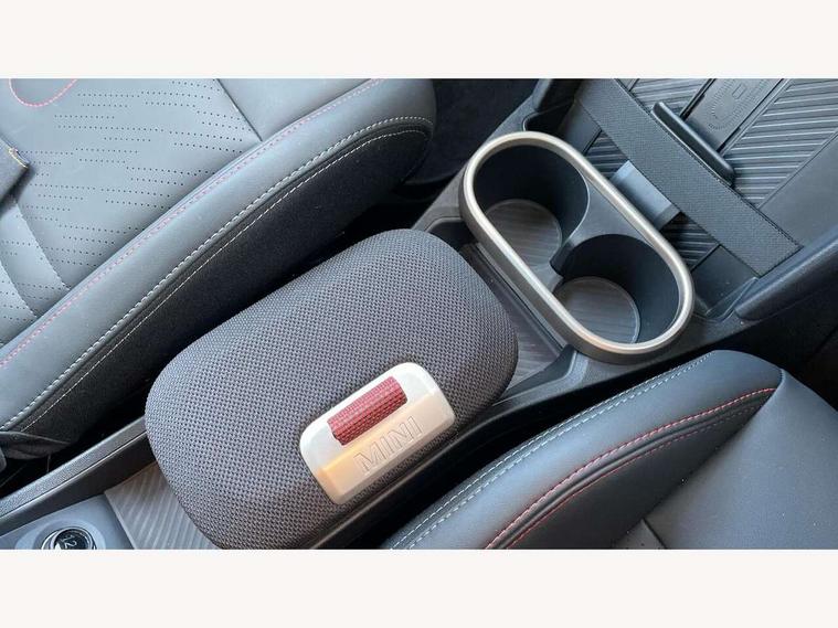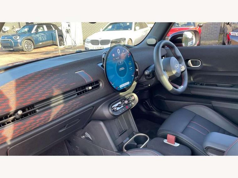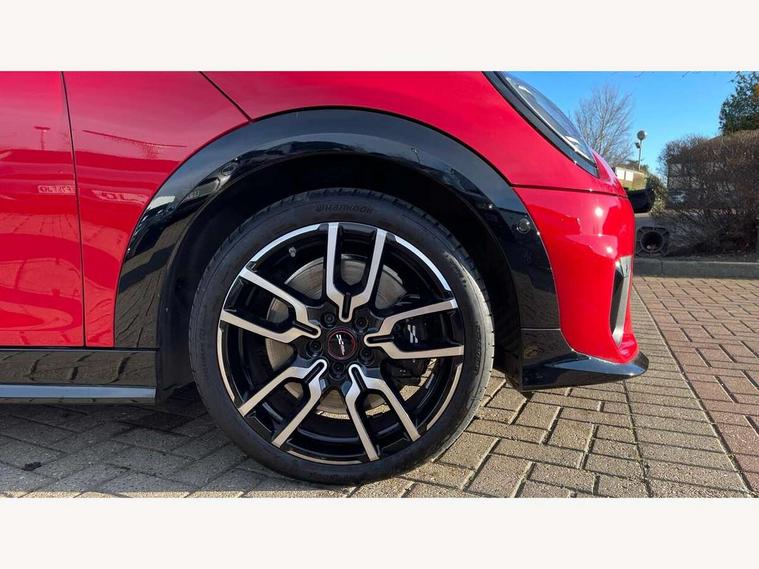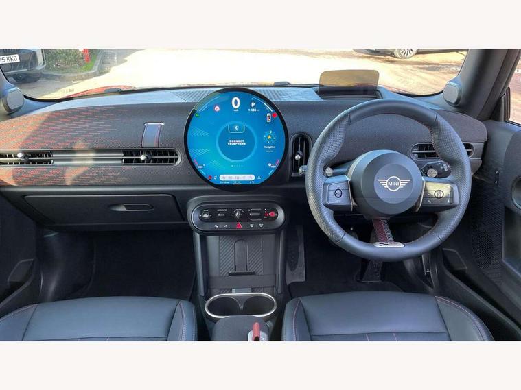 Central toggle bar, Circular OLED Screen, Compatible mobile phone bluetooth with audio streaming, Cruise control, Digital instrument cluster, Electro-mechanical speed dependant steering assistance, Emergency call service, MINI Experience Modes, Mini navigation system, On board computer, Service interval indicator, 7 speed steptronic sport transmission with double clutch, Adaptive suspension, DAB Digital radio, Personal eSim, Auto headlights, Electric adjustable heated door mirrors, Electric front windows, Front and rear apron, Heated rear window, Heated windscreen washer jets, High gloss black wheel arches, High gloss hexagonal patterned grille surround, JCW body kit, LED daytime running lights, LED Headlights, LED indicator lights, LED rear lights, Rain sensor window wipers, Rear fog lights, Rear roof spoiler with airblades, Rear window wiper, 2 seat bench in second row, 2 zone automatic air conditioning, 60/40 rear seat bench, Ambient lighting, Black lower band in high gloss, Cupholders, Dark headliner, Floor mats, Front and rear head restraints, Front compact armrest, Heated steering wheel, Height adjustable passenger seat, Lidded storage box in Black/Red knit, Luggage compartment lighting, Partially perforated vescin steering wheel with red accent, black/red decorative strap, Single front passenger seat, Steering wheel paddle shift, Sunvisors with vanity mirrors, Vescin/Cord upholstery, Driving assistant pack - Cooper Hatchback, Park assistant pack - Cooper Hatchback, 3 point seatbelts on all four seats, 6 Airbags - front, side, head and seat belt tensioners, Acoustic pedestrian protection, Anti-lock braking system (ABS), Brake caliper in Black with JCW badge, DSC - Dynamic Stability Control, Electronic parking brake, Front and rear disc brakes, Front ISOFIX (iSize), Front passenger airbag deactivation, JCW Sport Brakes, Traction control, Tyre pressure monitoring system, Alarm, Immobiliser, Remote central locking, Black/Red decorative dash strap, JCW Black/Red dashboard knit, Tyre repair kit,