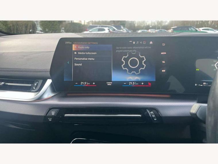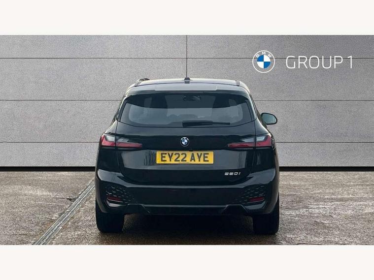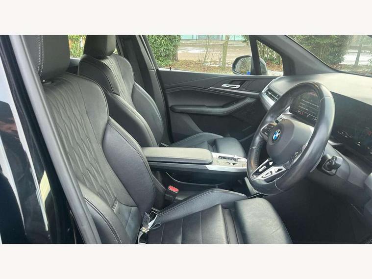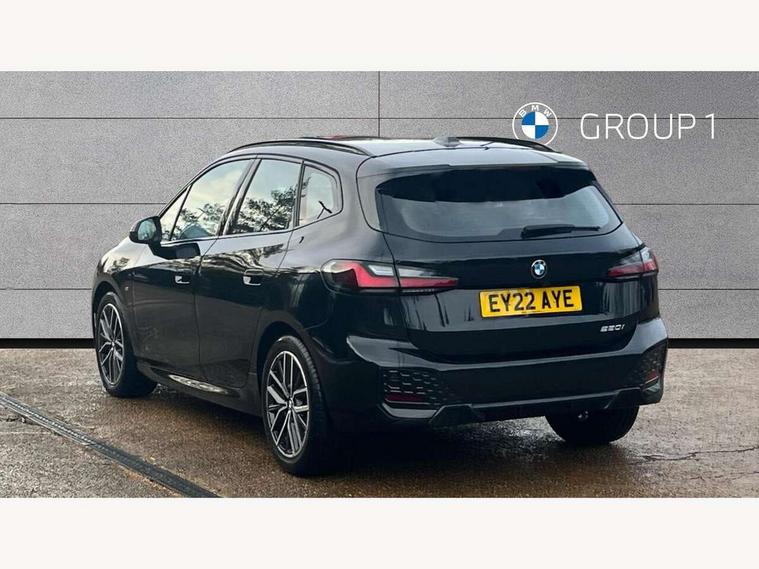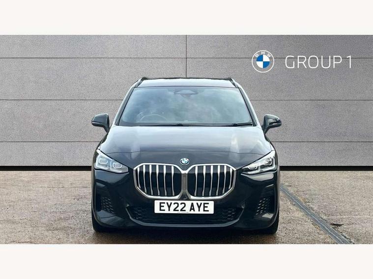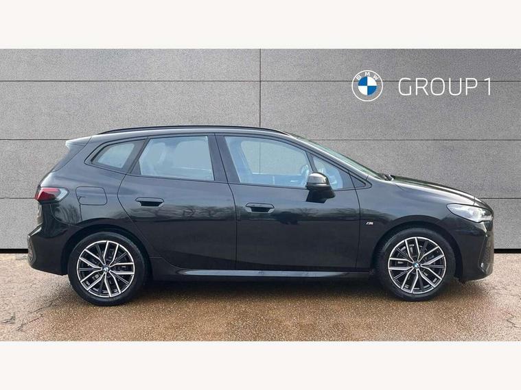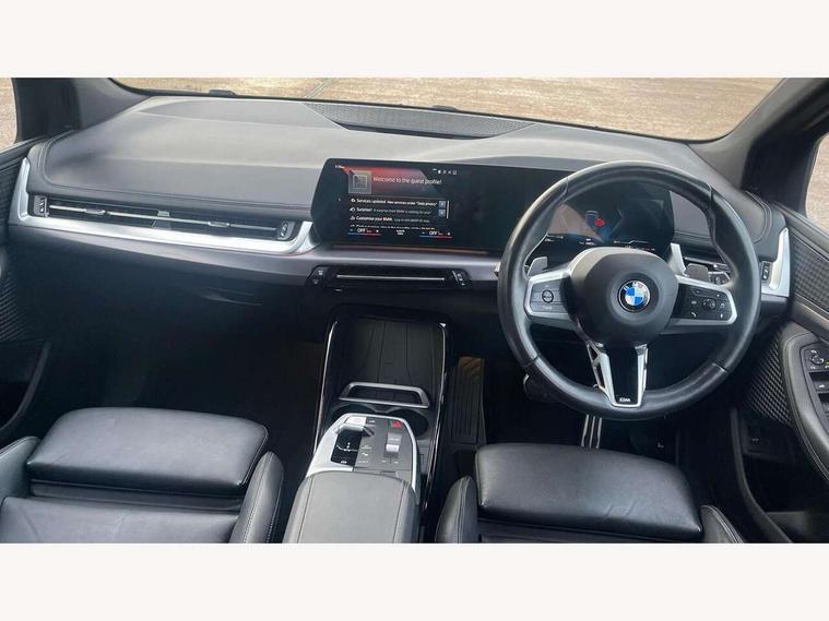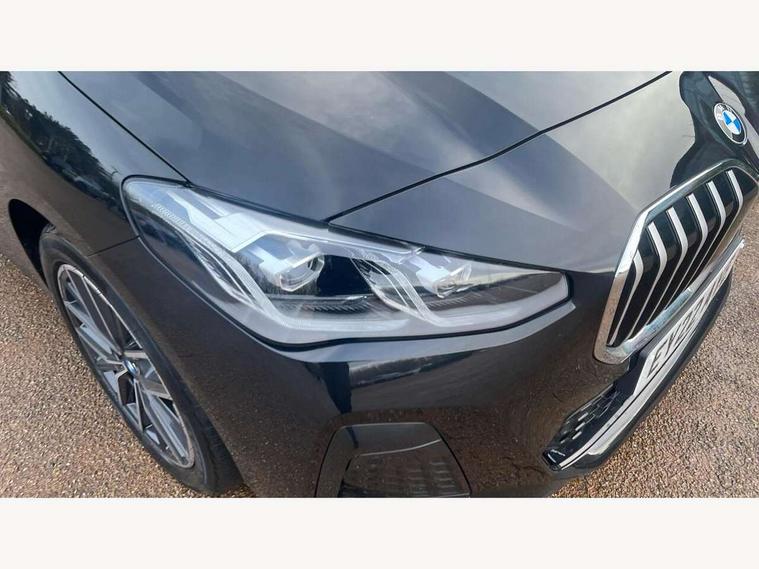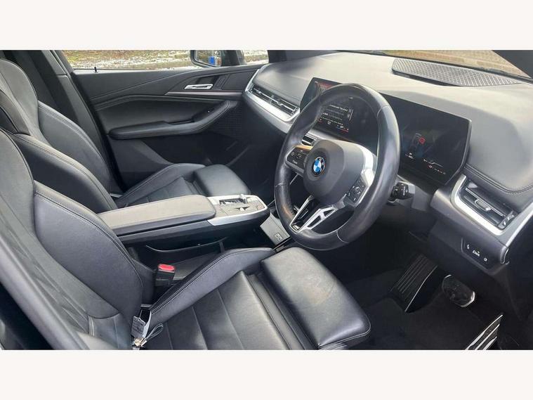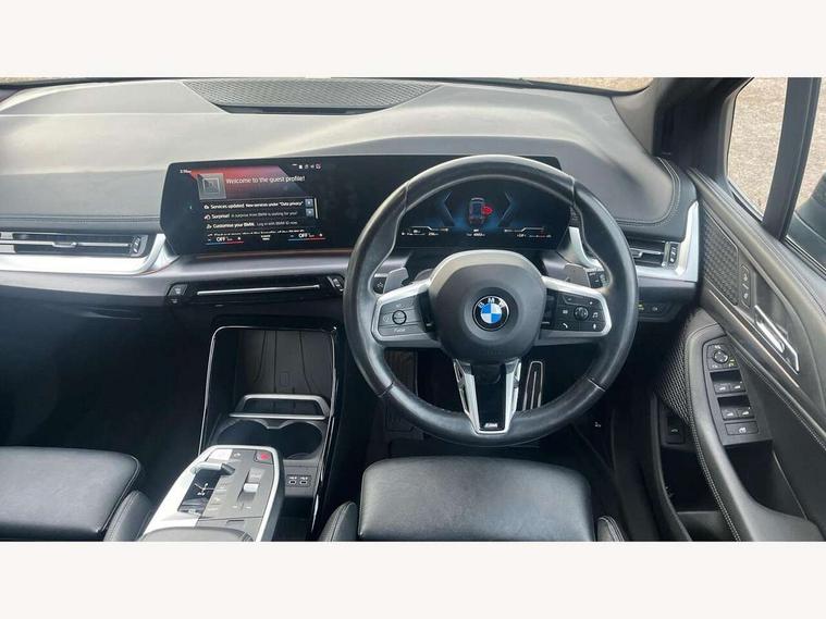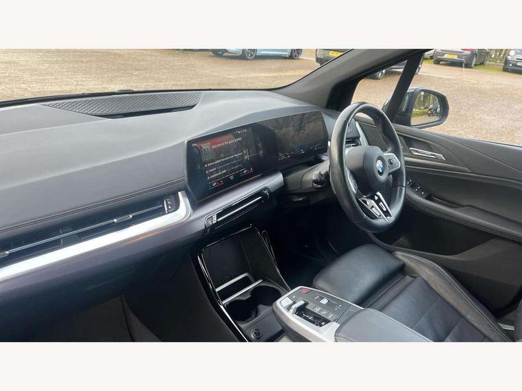 Active Guard incl speed limiting and lane departure functions with auto steering, and front collision warning with brake intervention, Automatic powered tailgate, Automatic start/stop function, BMW Live cockpit plus with Navigation function, BMW Teleservices, Brake pad wear indicator in front and rear, Drive off assistant, Flat air vents on instrument panel in high gloss black, adjustable slats with elements in pearl chrome, iDrive controller, Instrument cluster with speedometer with miles per hour read out, tachometer and fuel gauge, Language version English, On board computer - average speed+fuel consumption, service interval, clock/date, odometer/trip meter, outside temperature display and ice warning, Parking assistant with active park distance control, reversing assistant, lateral parking aid and rear view camera, Servotronic variable electric power steering (EPS), Smartphone integration, Widescreen display, Drive performance control with ECO PRO comfort + sport mode, Gear selector switch with toggle operation, M Adaptive suspension, Petrol Particulate Filter, Steptronic transmission with double clutch and gear shift paddles, 2x USB Type C ports in front centre console for charging and data transfer, 2x USB Type C ports in rear centre console for charging, DAB Digital radio, Air inlet middle part on front apron in lines specific design with trim strip in satinised aluminium, Automatic headlights, BMW emblem, engine compartment lid and tailgate, Body colour roof mouldings, Body coloured door mirror caps, Contoured rear roof spoiler in vehicle colour with side aeroblades in black high-gloss, Driver side exterior mirror lighting with BMW logo projection, Dynamic brake lights, Electric adjustable heated door mirrors, Electric windows - front and rear, with open/close fingertip control, anti-trap facility and comfort closing, Folding door handles integrated flush with surface, Front and rear windscreen wipers with heated front washer nozzles, Front bumper cover with independent design in body colour with inserts in black high gloss, Front bumper design elements in satinised aluminium, Front door exit lights, Front door sill finishers aluminium inserts with M inscription, Front entry sills with aluminium inserts + BMW inscription, Front oramental grille with radiator grille bars in satinised aluminium, Heated rear window, Hidden exhaust pipe, High gloss shadow line, High gloss shadowline roof rails, Key with M identification, LED Daytime running lights and parking lights with turn indicators, LED number plate light, LED third brake light in rear spoiler, M identification on sides, Manual headlight range control, Model inscription on right tailgate, Rain sensor, Rear bumper cover with independent design in body colour with inserts in black high gloss, Rear bumper trim strip in satinised aluminium, Rear side wing doors, Shark fin antenna, Side sill covers with independent design in Body colour, Trailer stabilisation logic, Trims on front and rear bumper covers colour-coordinated with side window graphic, Visible VIN plate, Welcome lighting, Windscreen washer nozzle for rear view camera, 12V power socket in luggage compartment and front centre console, 12V socket in right side trim panel, 2 bag hooks in luggage compartment, 2 front reading lights, 2 open cup holders in front centre console, 3 seat bench in 2nd row, 40:20:40 split folding rear seat backrests, Ambient lighting front and rear, Automatic two zone climate control air conditioning, Bottle trays in all doors, Child seat ISOFIX attachment for two outer rear seats and front passenger seat with anchorage points, Driver and front passenger sports seats, Four grab handles integrated in roof lining, Front and rear door pockets, Front and rear footwell lighting, Front and rear side armrest integrated into door trim, Front centre console storage compartment, Front head restraints, Glovebox with light, Heated front seats, Height adjustable 3 rear head restraints, Interior door handle recess light on all doors, Luggage compartment lighting, M Anthracite headlining, M specific floor mats, M sport leather steering wheel, Map pockets, Mechanical rear seats with fore/aft adjustment, Multi-function controls for steering wheel, One piece parcel shelf opens together with tailgate and removable, Rear cloth hooks, Single front passenger seat, Sliding rear seat bench, Stainless steel pedals, Steering wheel column manual adjustment, Storage compartment lighting in centre console and storage tray in centre stack, Storage compartment net in left side trim panel, Storage compartment with folding cover under centre console armrest cushion, Storage tray in right side trim panel, Sunvisors with illuminated vanity mirrors, Three spoke sport leather steering wheel, Connected pack professional - 2 Series Active Tourer, Technology pack - 2 Series Active Tourer - MY22, 3 point seatbelts on all seats, front pyrotechnic belt tensioners, stopper and belt force limiters, rear coded belt buckles, Airbag - Front driver and passenger, front and rear head, front side, curtain head protection, manual deactivation of front passenger airbag possible, Anti lock braking system (ABS) with brake assist, Automatic hold function, BMW emergency call, Brake drying, Braking readiness, Child proof locking system in rear door, Cornering brake control, Crash Sensor - activates hazard/interior lighting + unlocks doors, DSC - Dynamic Stability Control, Dynamic brake control, Dynamic Traction Control - DTC, Electromechanical parking brake, Energy recovery system, Front disc brakes, Integrated braking system, PC iBrake PostCrash approach control warning with light braking function, Rear disc brakes, Tyre pressure monitoring system, Warning triangle and first aid kit, Anti theft alarm system, Closing system with central locking, Engine immobiliser, Locking wheel bolts, Front centre console trim in high gloss black, BMW mobility tyre sealing system, Reduced rolling resistance tyres,