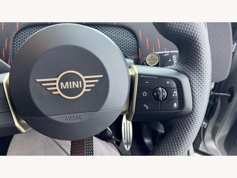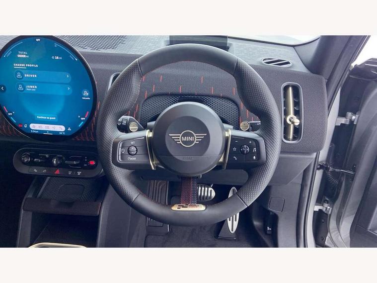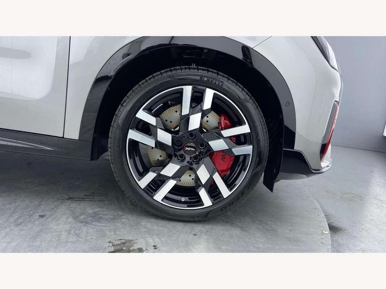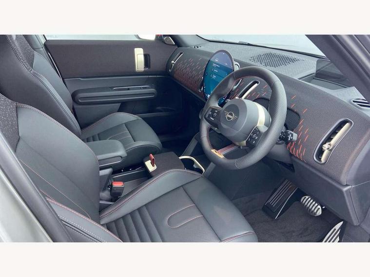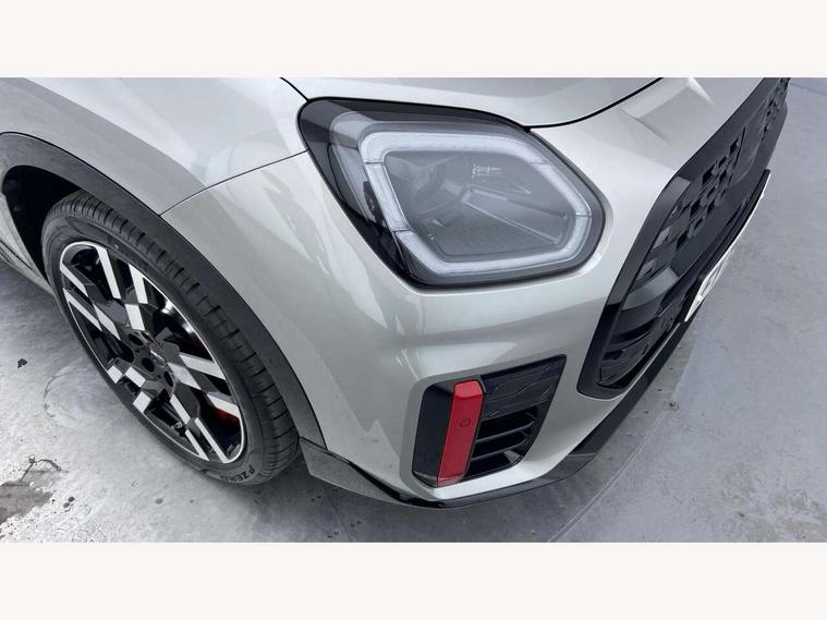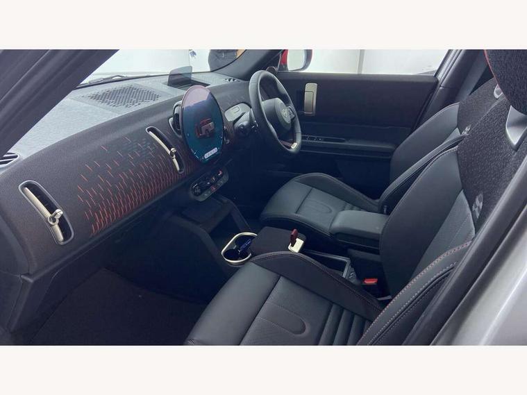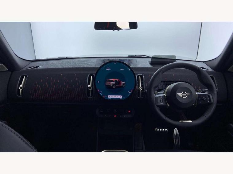 Bluetooth connection, Circular OLED Screen, Compatible mobile phone bluetooth with audio streaming, Cruise Control (DCC), Digital dashboard display, Driving assistant, Driving Assistant Plus Preparation, E-call, Electro-mechanical speed dependant steering assistance, MINI Experience Modes, MINI Head up display, Mini navigation system, MINI TeleServices, Parking assistant in camera and ultrasound based assistance system, rear view camera, parking aid and distance control, Adaptive suspension, Double clutch sports transmission, Larger capacity fuel tank, Quad exhaust system, DAB Digital radio, Harman Kardon surround sound system, Personal eSim, Auto tailgate, Electric adjustable heated door mirrors, Front and rear apron, Front and rear electric windows, Heated rear window, High beam assistant, High gloss hexagonal patterned grille surround, Interior rear-view mirror with automatic anti-dazzle function, LED daytime running lights, LED headlights with extended contents including Adaptable light signatures, LED rear lights, LED third brake light, Rain sensor with auto headlights, Rear roof spoiler with airblades, Rear side wing doors, Rear window wiper, Roof rails, 3 seat bench in 2nd row, 60/40 split rear bench seat, Anthracite headliner, Auto air conditioning, Driver and front passenger seat heating, Floor mats, Front armrest, Front headrests, Heated steering wheel, Height and length steering column adjustment, JCW Front sports seats, Lidded storage box in Black/Red knit, Luggage compartment separating net, Perforated Vescin steering wheel, Rear headrests, Seat adjustment for rear seats, Single front passenger seat, Sunvisors with vanity mirrors, Wireless charging tray, Interior and exterior mirror package - Mini Countryman, 3x3 point rear seat belts, 6 Airbags - front, side, head and seat belt tensioners, ABS, DSC - Dynamic Stability Control, Electronic handbrake, Electronic Stability Programme (ESP), Front ISOFIX (iSize), Hill descent control, Hill hold assist, Hill start assist, JCW logo in brake calipers, JCW Sport brakes with Chilli Red calipers, Manual rear child locks, Traction control, Tyre pressure monitoring system, Warning triangle, Alarm system with tilt sensor, monitoring doors, bonnet interior and tailgate, Auto drive away locking, Comfort access system, Deadlocking function, Electronic vehicle immobiliser, Locking wheel bolts, Remote control locking, Start/stop toggle with keyless go, 19" JCW Runway Spoke Black alloy wheels, Tyre repair kit plus,