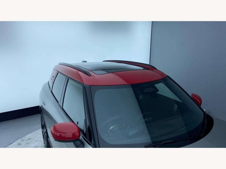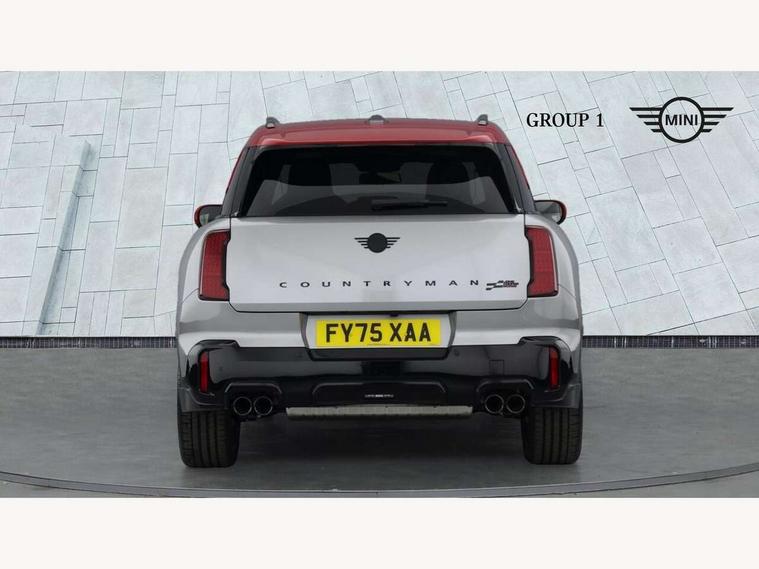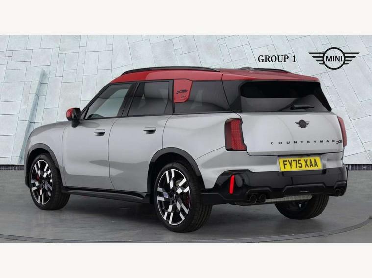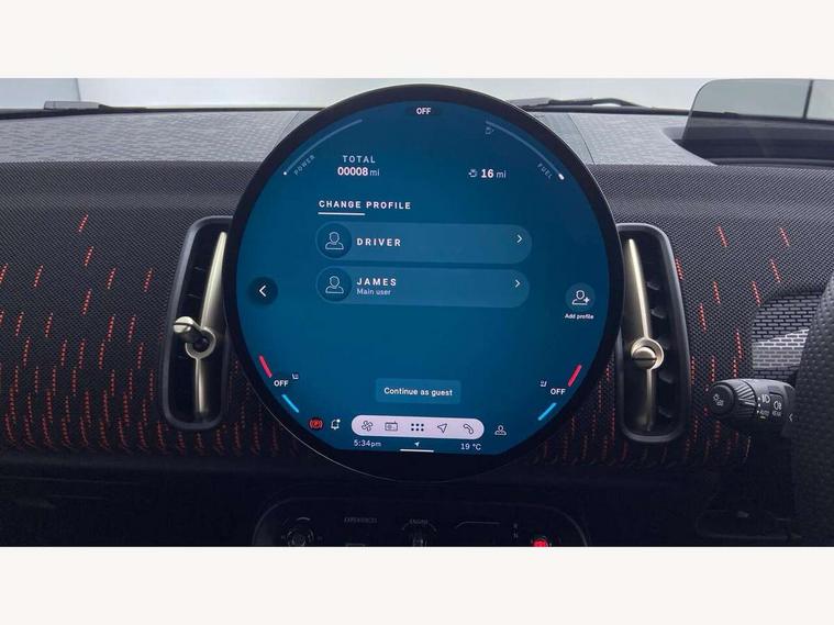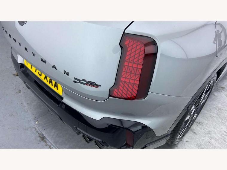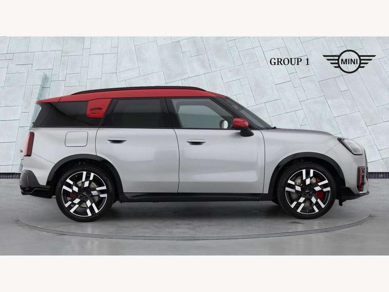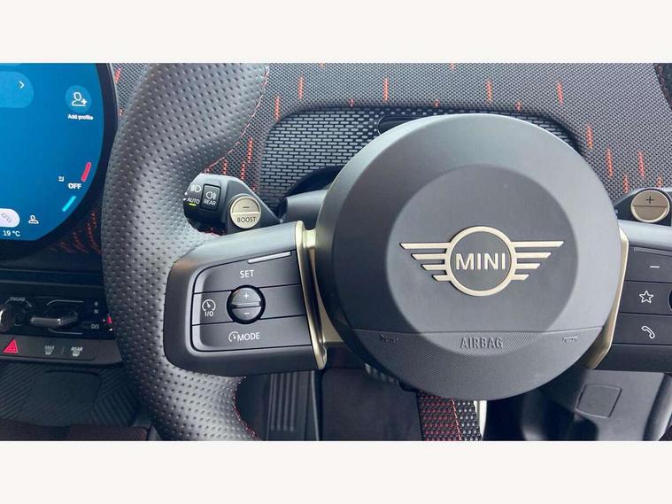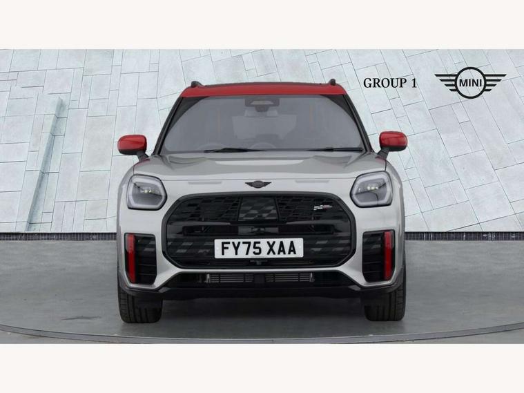 Bluetooth connection, Circular OLED Screen, Compatible mobile phone bluetooth with audio streaming, Cruise Control (DCC), Digital dashboard display, Driving assistant, Driving Assistant Plus Preparation, E-call, Electro-mechanical speed dependant steering assistance, MINI Experience Modes, MINI Head up display, Mini navigation system, MINI TeleServices, Parking assistant in camera and ultrasound based assistance system, rear view camera, parking aid and distance control, Adaptive suspension, Double clutch sports transmission, Larger capacity fuel tank, Quad exhaust system, DAB Digital radio, Harman Kardon surround sound system, Personal eSim, Auto tailgate, Electric adjustable heated door mirrors, Front and rear apron, Front and rear electric windows, Heated rear window, High beam assistant, High gloss hexagonal patterned grille surround, Interior rear-view mirror with automatic anti-dazzle function, LED daytime running lights, LED headlights with extended contents including Adaptable light signatures, LED rear lights, LED third brake light, Rain sensor with auto headlights, Rear roof spoiler with airblades, Rear side wing doors, Rear window wiper, Roof rails, 3 seat bench in 2nd row, 60/40 split rear bench seat, Anthracite headliner, Auto air conditioning, Driver and front passenger seat heating, Floor mats, Front armrest, Front headrests, Heated steering wheel, Height and length steering column adjustment, JCW Front sports seats, Lidded storage box in Black/Red knit, Luggage compartment separating net, Perforated Vescin steering wheel, Rear headrests, Seat adjustment for rear seats, Single front passenger seat, Sunvisors with vanity mirrors, Wireless charging tray, Interior and exterior mirror package - Mini Countryman, 3x3 point rear seat belts, 6 Airbags - front, side, head and seat belt tensioners, ABS, DSC - Dynamic Stability Control, Electronic handbrake, Electronic Stability Programme (ESP), Front ISOFIX (iSize), Hill descent control, Hill hold assist, Hill start assist, JCW logo in brake calipers, JCW Sport brakes with Chilli Red calipers, Manual rear child locks, Traction control, Tyre pressure monitoring system, Warning triangle, Alarm system with tilt sensor, monitoring doors, bonnet interior and tailgate, Auto drive away locking, Comfort access system, Deadlocking function, Electronic vehicle immobiliser, Locking wheel bolts, Remote control locking, Start/stop toggle with keyless go, 19" JCW Runway Spoke Black alloy wheels, Tyre repair kit plus,