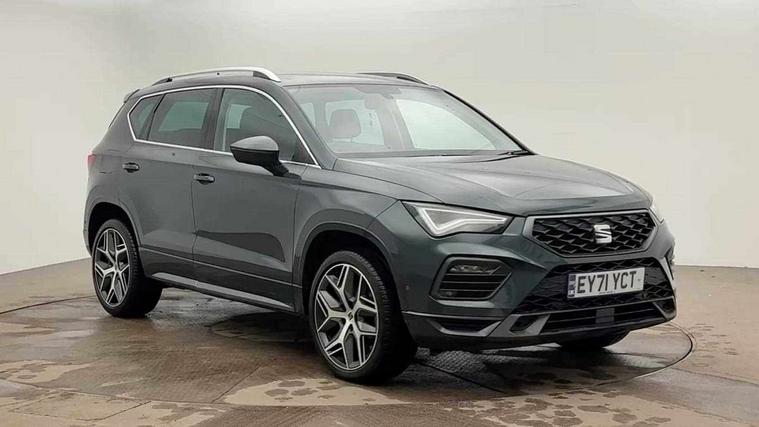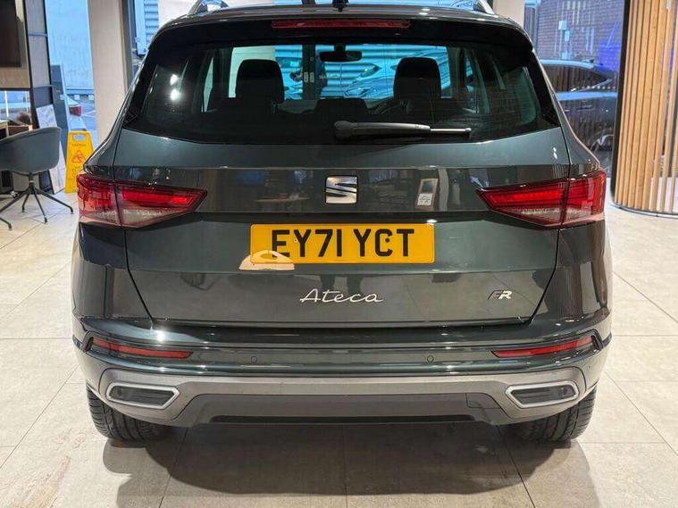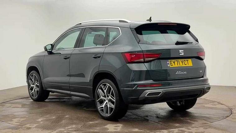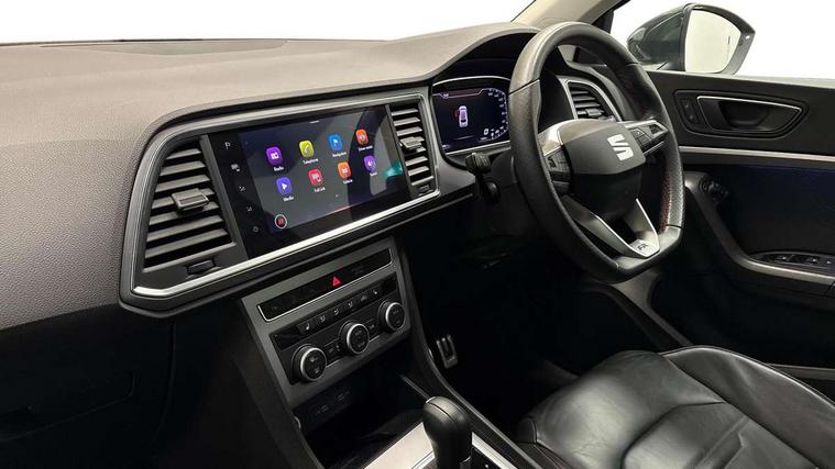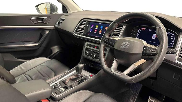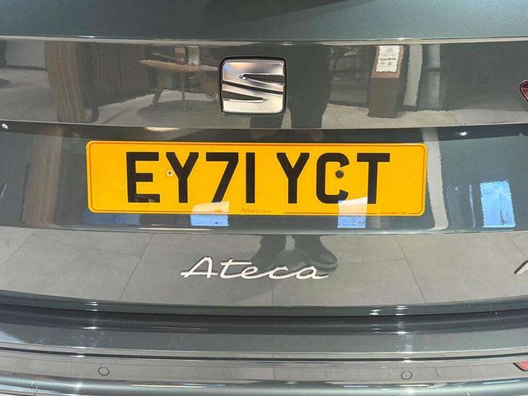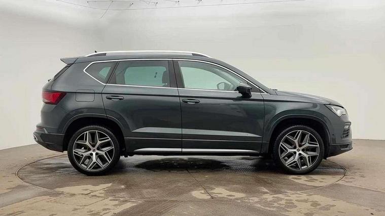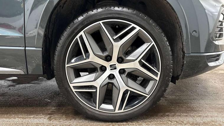 Cruise control system with speed limiter, Digital cockpit, E-call, Outside temperature gauge, Progressive power assisted steering, SEAT drive profile with driving experience button - Normal, Sport, Eco and Individual mode, gearshift, steering and throttle response, Self parking functionality (includes front and rear parking sensors), Trip computer, Wireless full link smartphone integration, Wireless phone charger, Steering wheel mounted audio/phone controls, Body colour bumpers, Body coloured wheel arch surrounds, Chrome roof rails, Chrome side window trim, Cosmo grey front grille frame, Dark tinted rear windows, Daytime running lights, Door mirrors with welcome light silhouette, Dynamic headlight range control with self adjusting whilst driving, Electric adjustable/heated/folding door mirrors, Front and rear electric windows, Full LED headlamps with lens and LED front fog lamps with cornering function, Illuminated aluminium front door sill, LED rear tail lights with dynamic indicators, Rear fog lights, Rear side wing doors, Rear spoiler, Rear wash/wipe, Simulated exhaust pipes in chrome frame, 12V socket in front, 3 seat bench in 2nd row, 60/40 split folding rear seat, Aluminium pedals, Dual zone climate control, Electric adjustable driver seat with lumbar adjustment, Front and rear head restraints, Front centre armrest, Front seat back storage pockets, Heated front seats, Height adjustable passenger seats with lumbar adjustment, ISOFIX points in outer rear seats with top tether anchorage points, Leather steering wheel and gear knob, Leather upholstery with front sports seats, Rear armrest and easy back seat release mechanism from boot, Single front passenger seat, Steering wheel mounted gearshift paddles, Convenience pack - Ateca, Interior lighting pack - Ateca, Navigation system pack with DAB - Ateca, 3x3 point rear seatbelts, ABS, Traction control system (TCS), Electronic stability control (ESC) and Electronic differential lock system (XDS), Airbags - Driver and front passenger airbag with deactivation, front side, two curtain and driver's knee airbags, Electric parking brake with auto hold function, Front and rear seatbelt reminder, Front assist with autonomous emergency braking, Hill hold control, Manual rear child locks, Tiredness recognition system, Traction control, Tyre pressure monitoring system, Alarm, Keyless entry, Locking wheel bolts, Chrome interior detailing, 19" Exclusive machined alloy wheels with decorative inserts 36/7 in cosmo grey,