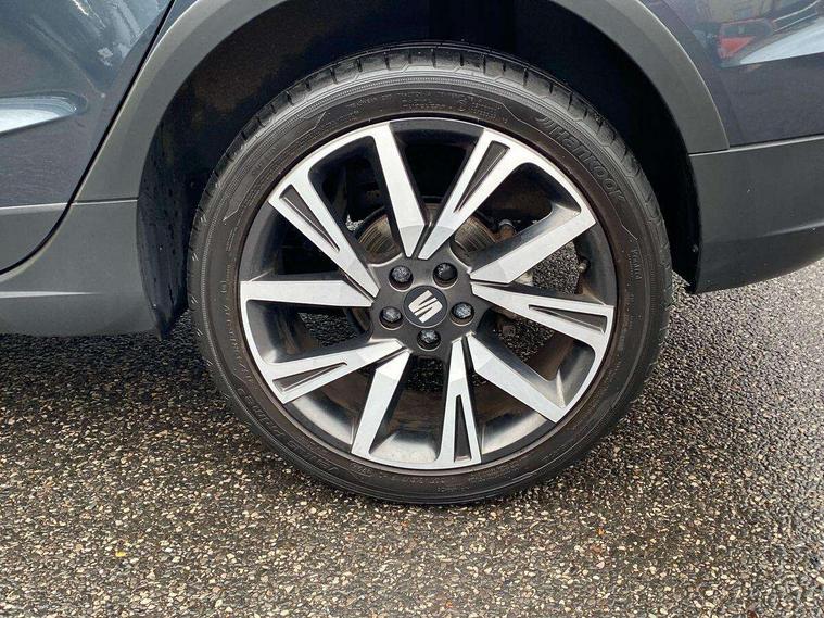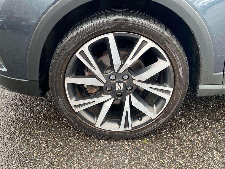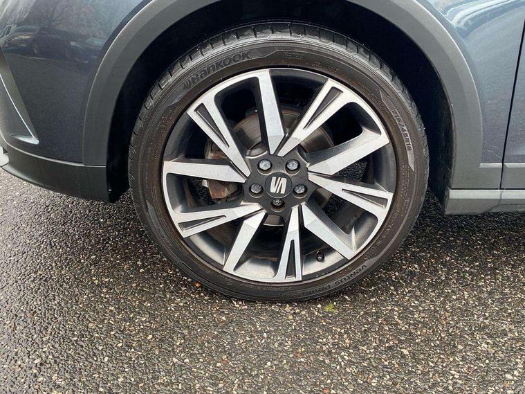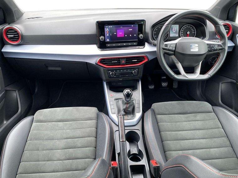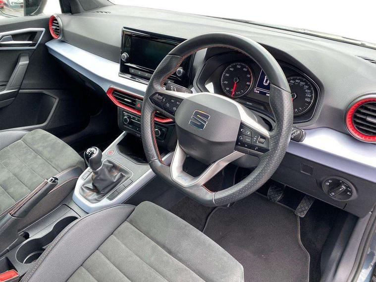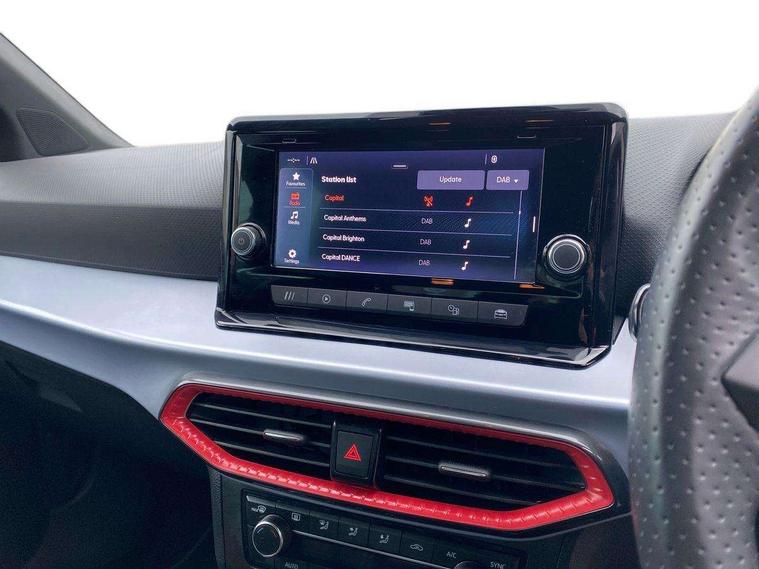 'Lights On' Reminder warning buzzer, Analogue cockpit with physical dials, Digital clock, E-call, Electric speed sensitive power steering, Full Link Smartphone Integration with Mirror Link, Apple Car Play, Google Android Auto with USB Type C cable for Apple and Android compatibility, Lane keeping system, Low fuel warning light, Outside temperature display, Rear parking sensor, RPM counter, Seat connect with safety, service and remote, SEAT Drive profile - Four different models normal-sport-eco-individual, steering response, throttle response, Trip computer, Wireless phone charger, Bluetooth interface for hands free and audio streaming, DAB digital radio and AM/FM radio, Media system with 8.25" colour touchscreen with USB port (type c), Steering wheel mounted audio controls, Anti theft roof antenna, Automatic activation of hazard warning lights, Body coloured bumpers, Body coloured door handle inserts, Chrome roof rails and window surrounds, Dark tinted rear windows, Dimming rear view mirror, Electric front/rear windows, Electrically adjustable and heated door mirrors, Front fog lights with cornering function and rear fog light, FULL LED automatic headlights with dynamic headlight range control, coming and leaving home, LED daytime running lights, LED rear tail lights and licence plate lights, Protective side mouldings, Rear side wing doors, Rear spoiler, Rear window wash/wipe, Roof colour door mirrors, Third brake light, Twin exhaust pipe styling hidden exhaust pipe, Visible VIN plate, Windshield wiper with intermittent control and potentiometer, 2 cupholders, 3 seat bench in 2nd row, 60/40 split folding rear seat, Aircare filter, Black interior roof, Double boot floor, Driver sunvisor with covered mirror + card holder, Dual zone climate control, Front comfort seats, Front courtesy light with 2x front and 2x rear reading lights, Gear shift indicator, Height adjustable front seats, Height/reach adjustable steering column, Illuminated boot, Instrument lighting with brightness control, Interior ambient lighting, Interior light in footwell, central console and door panel, ISOFIX points in outer rear seats with top tether anchorage points, Microsuede cloth upholstery, Passenger sunvisor with vanity mirror, Perforated flat bottomed leather steering wheel/gear knob/handbrake with red stitching and FR logo, Single front passenger seat, Two front and three rear height adjustable headrests, Interior chrome pack - Arona, 3 point seatbelts on all rear seats, ABS, Active front headrests, Child locks on rear doors, Driver and front passenger airbags with front passenger airbag de activation, front side and curtain airbags, Electronic stability control, Emergency Brake Assist (EBA) and front assist, Front and rear seatbelt reminder, Hill hold control, Multi-Collision braking, Tiredness recognition system, Traction control, Tyre pressure monitoring system, Alarm with back-up horn, Electronic engine immobiliser, KESSY Keyless entry and go, Locking wheel bolts, Remote central locking + deadlocks, Tow away protection, Titan black dashboard,
