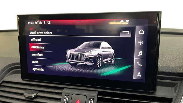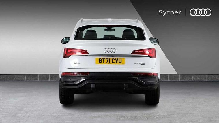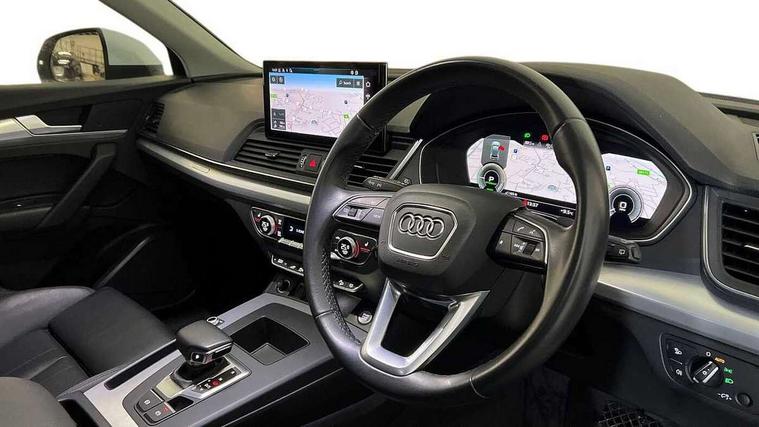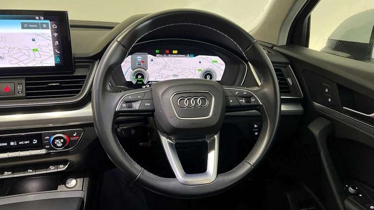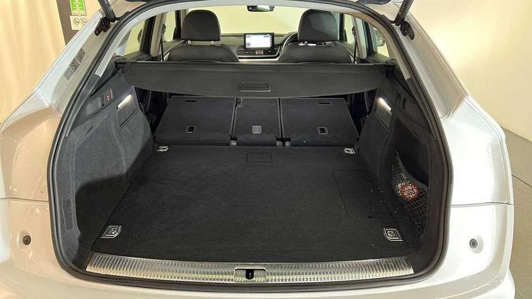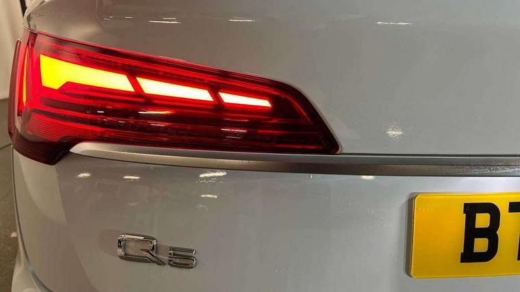 Audi connect safety and service (e-call), Audi connect with Amazon Alexa Integration, Audi drive select, Audi virtual cockpit plus with 12.3" screen and three different layout designs, Audi wireless smartphone interface, Automatic start-stop system with coasting functionality and efficiency programme, Bluetooth interface, Cruise control + speed limiter, Electro - mechanical power assisted steering, MMI navigation plus with 10.1" touch screen, Power tailgate, Reversing camera, Service interval indicator, Voice control system with Audi hotword activation "Hey Audi", 3 pin 10 amp domestic charging cable, Dynamic suspension, Quattro on demand, Type 2 mode 3 22kW 32 amp charging cable, Type 2 socket for AC charging, DAB Digital radio, Acoustic windscreen, Air inlets in matt titanium black with blades in matt aluminium silver, Aluminium roof rails, Auto dimming rear view mirror, Automatic headlights and windscreen wipers, Body colour bumpers, Body colour door mirrors, Chrome plated exhaust trims, Door sills in Selenite silver, Electric adjustable/heated/folding door mirrors, Front and rear electric windows, LED headlights and LED tail lights, Lower bumpers painted in contrast Manhattan grey, Matt selenite silver underbody protection, Matt twilight grey radiator grille with chrome vertical struts, Rear chrome trim strip below lights, Rear diffuser strip in selenite silver, Rear spoiler, Rear wiper, Roof bars, 2 x USB charging port with aux input socket, 3 rear headrests, 3 spoke multifunction leather steering wheel with shift paddles, 40:20:40 split folding rear seat with rear centre armrest, Comfort front centre armrest, Deluxe 3 zone electronic climate control, Door sills trims with aluminium inlays, Front/rear floor mats, Heated front seats, Height adjustable front head restraints, Height/reach adjustable steering column, ISOFIX child seat mounting and top tether, Manual seat adjustment with 4-way electric lumbar support, Rear seat bench plus, Silver cloth headlining, Sunvisors with vanity mirrors, Tool kit, Trunk roller cover, Twin leather upholstery + front sports seats, High gloss pack - Q5, LED interior light pack - Q5, 3 point seatbelts on all seats, 6 airbags - Driver, front passenger, curtain and side airbags, Electrically operated child locks on rear doors, Electromechanical parking brake, Electronic stabilisation control including ABS, ASR and EDL, Front passenger airbag deactivation, Hill descent control, Hill hold assist, Multi collision brake assist, Pop-up bonnet for pedestrian protection, Pre sense city, Seat belt force limiter, Seatbelt monitoring, Tyre pressure warning, Warning triangle and first aid kit, Anti theft alarm, Anti-theft wheel bolts, Keyless Go access/ignition system, Aluminium rhombus inlay, 18" 5 twin spoke dynamic design alloy wheels, Tyre repair kit,