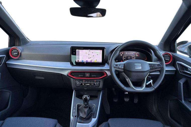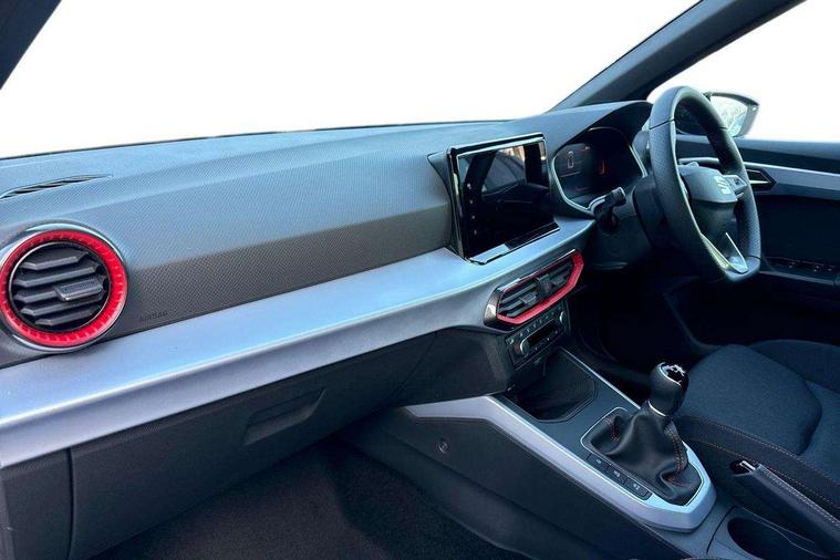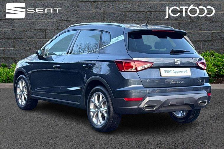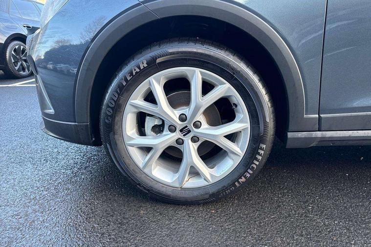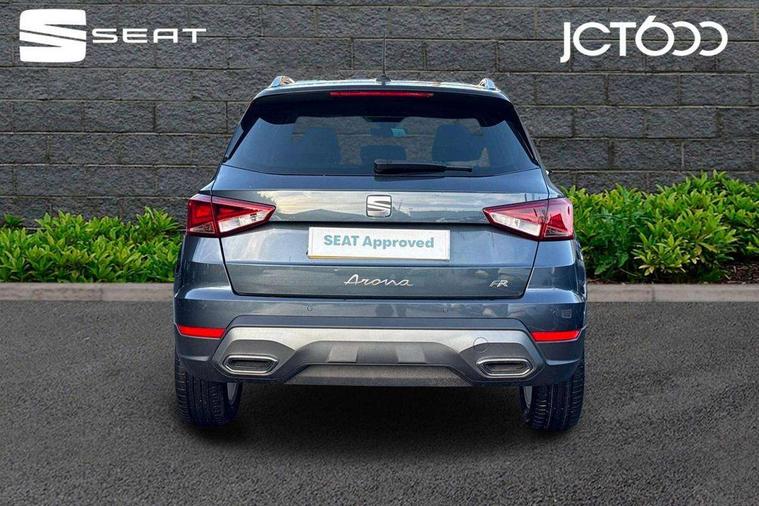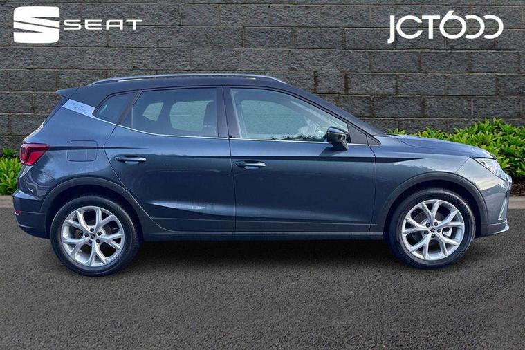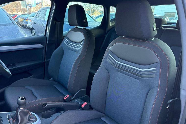 'Lights On' Reminder warning buzzer, 8" Digital cockpit, Digital clock, E-call, Electric speed sensitive power steering, Full link smartphone integration with mirror link, wireless apple carplay, Google android auto + USB Type C cable for apple and android devices, Lane keeping system, Low fuel warning light, Outside temperature display, RPM counter, SEAT Drive profile - Four different models normal-sport-eco-individual, steering response, throttle response, Trip computer, Wireless phone charger, 9.2" colour touchscreen with navigation system, voice control and USB port (type c), Bluetooth interface for hands free and audio streaming, DAB digital radio and AM/FM radio, Steering wheel mounted audio controls, Anti theft roof antenna, Auto dimming interior rear view mirror, Automatic activation of hazard warning lights, Body coloured bumpers, Body coloured door handle inserts, Chrome roof rails and window surrounds, Dark tinted rear windows, Electric front/rear windows, Electrically adjustable, heated and folding door mirrors, Front fog lights with cornering function and rear fog light, FULL LED automatic headlights with dynamic headlight range control, coming and leaving home, LED daytime running lights, LED rear tail lights and licence plate lights, Protective side mouldings, Rain sensing wipers, Rear side wing doors, Rear spoiler, Rear window wash/wipe, Roof colour door mirrors, Third brake light, Twin exhaust pipe styling hidden exhaust pipe, Visible VIN plate, 2 cupholders, 3 seat bench in 2nd row, 60/40 split folding rear seat, Aircare filter, Black interior roof, Cloth upholstery, Double boot floor, Driver sunvisor with covered mirror + card holder, Dual zone climate control, Front courtesy light with front reading lights, Gear shift indicator, Height adjustable front seats, Height/reach adjustable steering column, Illuminated air vent surrounds, Illuminated boot, Instrument lighting with brightness control, Interior ambient lighting, Interior light in footwell, central console and door panel, ISOFIX points in outer rear seats with top tether anchorage points, Passenger sunvisor with vanity mirror, Perforated flat bottomed leather steering wheel/gear knob/handbrake with red stitching and FR logo, Potentiometer, Single front passenger seat, Two front and three rear height adjustable headrests, Interior chrome pack - Arona, Safe and driving pack (S) - Arona, 3 point seatbelts on all rear seats, ABS, Active front headrests, Child locks on rear doors, Driver and front passenger airbags with front passenger airbag de activation, front side and curtain airbags, Emergency Brake Assist (EBA) and front assist, Front and rear seatbelt reminder, Hill hold control, Multi-Collision braking, Tiredness recognition system, Traction control, Tyre pressure monitoring system, Alarm with back up horn with tow away protection, Deadlock, Electronic engine immobiliser, Locking wheel bolts, Remote central locking, Titan black dashboard, 17" Dynamic alloy wheels,