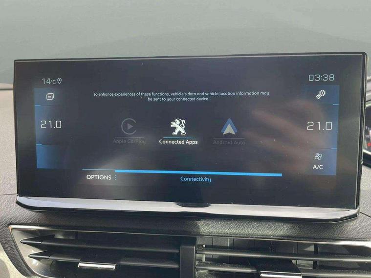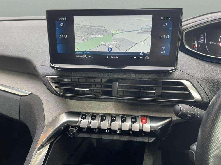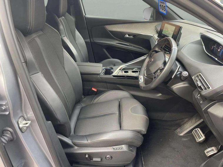 3D connected navigation with 10" HD touchscreen + voice recognition system, Apple car play and Android auto, Blind spot detection system, Bluetooth telephone facility, Drive modes select (Eco, normal and sport), Driver Attention Alert level 3, Driving Time Warning (DAA1), Emergency services call system, Extended traffic sign recognition, Exterior temperature indicator with ice warning, Front and rear parking sensors, Lane departure warning system, Lane Keeping Assistance (LKA) with road edge detection, Mirror screen with mirror link, apple carplay and android auto, Multi function trip computer, Peugeot i-cockpit with compact multi-function sports steering wheel, PEUGEOT i-Cockpit with configurable 12.3" Head-up digital instrument panel, PEUGEOT SOS and assistance, Rear passenger USB charging sockets (x2) (type A), Speed limit recognition and recommendation, Dynamic stability control and electronic anti-skid system, Stop/start function, DAB Digital radio, USB socket, Auto self levelling headlights, Automatic hazard light activation upon heavy brake application, Automatic triggered rear windscreen wiper in reverse gear, Black with chrome detailed front wing trim, Body colour door handles, Body colour rear roof spoiler with stainless steel edging trim, Body protectors (bottom of front and rear bumpers + wheel arches + protection at bottom of doors) in black, Dark tinted rear side windows + tailgate window, Diamond Black door mirror shells, Door mirror mounted LED courtesy floor lighting, Electric folding door mirrors with exterior courtesy LED lighting, Electric operated/heated door mirrors, Fog Mode, Front windscreen wiper with magic wash cleaning system, Full LED headlights with LED fog lights with static cornering function, Gloss black B and C pillar and aerodynamic deflector trim, Gloss black front bumper air scoops, Gloss black rear cluster connecting strip, Gloss black windscreen trim, GT emblem in satin copper (front wings and tailgate), Headlights left on audible warning, Heated rear windscreen with integrated antenna, High beam assist, LED daytime running lights, LED front indicator, LED rear number plate lighting, LED side indicator lights integrated into door mirrors, LED third brake light, One touch electric front/rear windows with pinch protection, Rear LED Peugeot signature 'Claw Effect' lights with clear lens and scrolling LED direction indicators, Rear side wing doors, Twin exhaust tailpipe, 1/3 to 2/3 split folding rear seats, 12V Sockets in dashboard, rear cabin and load area, 2 cupholders in front centre console, 2 cupholders in rear armrest, 2 x Rear reading spotlights, 2x Rear coat hooks, 3x Isofix child seat fittings in the front passenger and outer rear seats, 4 Grab handles retractable and damped, Aikinite stitching in armrest, gear lever and dashboard facia, Aluminium pedals, Blue ambient lighting for connecting zone, Blue ambient lighting to front door panels, central storage and cupholders, Blue ambient lighting to headup instrument panel, Centre front armrest with butterfly wing opening and illuminated storage compartment, Driver seat manual adjustment (longitudinal and back rest angle), Dual zone automatic climate control, e-Toggle compact gear selector, Electric power steering with reach and rake adjustable steering column, Flocked front door pocket interior with blue ambient lighting, Flocked glovebox interior, Foldable front passenger seat with picnic table, Footwell illumination, Front interior light with 2 reading spotlights and rear interior light with timer, Front passenger seat manual adjustment (longitudinal and back rest angle), Front seat back map pockets, Gear shift indicator, Illuminated glovebox, Individual left and right controls in boot for seat folding, LED interior lighting in storage spaces and load area, LED roof interior lighting, Mistral floor mats with Aikinite contrast stitching, Mistral full grain perforated leather steering wheel with aikinite stitch detail and satin chrome 'GT' emblem, Rear bench seat with central armrest and ski hatch, Rear centre console ventilation system, Roof lining - Mistral black, Satin chrome dashboard trim, Satin chrome digital instrument panel and touchscreen trim, Satin chrome front door panel recess trim, Satin chrome interior door handles, Satin chrome scorpion's tail and toggle switch trim, Seatbelt not fastened audible and visual alert for front seats, Seatbelt unfastened on the move audible and visual alert for front and rear seats, Sunvisors with illuminated vanity mirrors, Two position boot floor, Drive assist plus pack - 3008, Visibility pack - 3008 GT, 3x Rear three-point retractable seatbelts with force limiters in the outer rear seats, ABS (Anti-lock Braking System) with EBD (Electronic Brakeforce Distribution) and EBA (Emergency Braking Assistance), Adaptive driver and front passenger airbags with passenger airbag deactivation function, Driver and front passenger side airbags, Electric child locking functionality on rear windows and doors, Electric parking brake, Front and rear curtain airbags, Front optimised safety headrests and 3 x rear retractable headrests with height adjustable, Front three point retractable seatbelts with pre tensioners and force limiters, Front ventilated disc brakes and rear disc brakes, Hill start assist, Two tone horn, Automatic door locking when moving off, Electronic immobiliser, key operated exterior door lock from the left hand door, Perimetric and volumetric alarm with lift and tilt sensor, Peugeot Open and Go System, Remote control central locking with two plip keys, Puncture repair kit including compressor, sealant cartridge and towing eye,