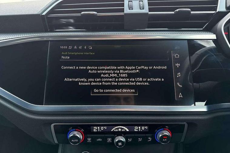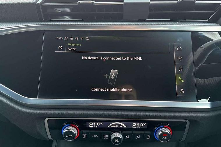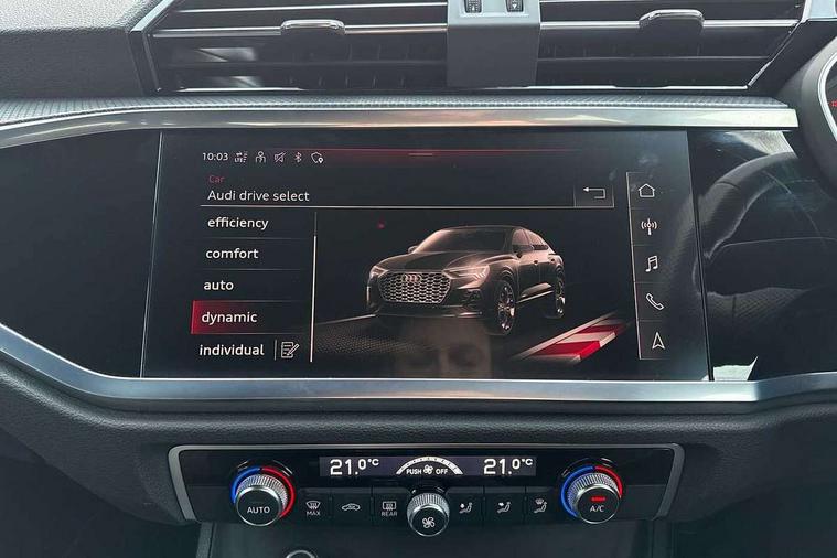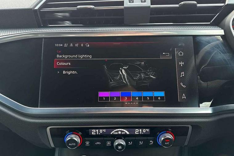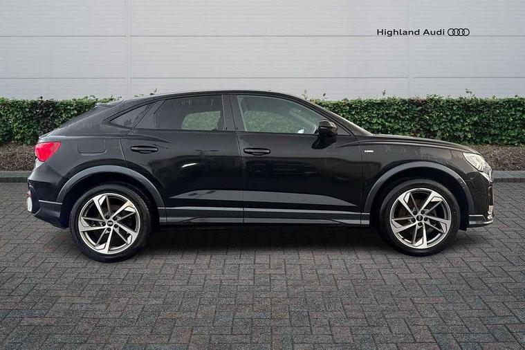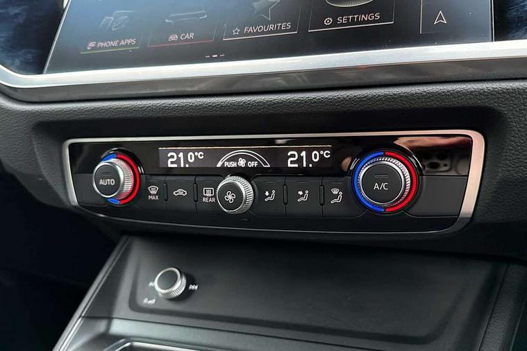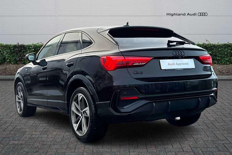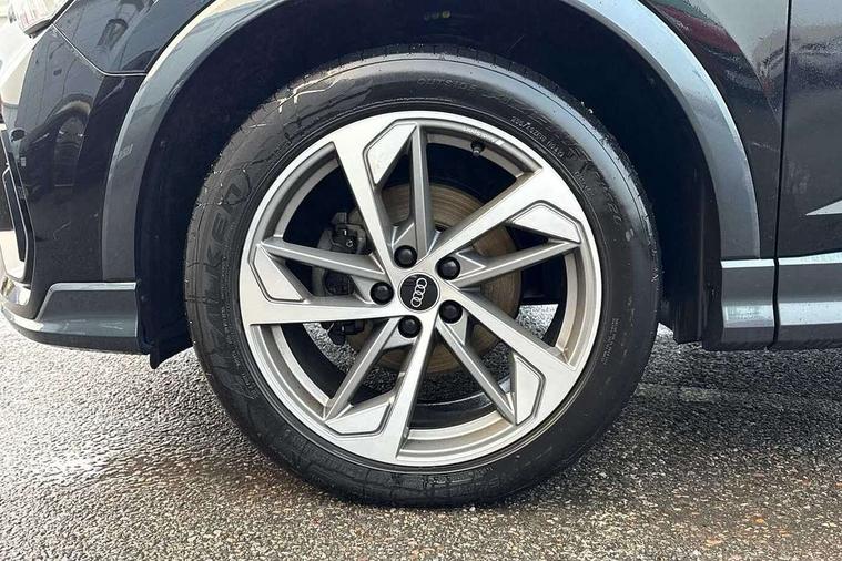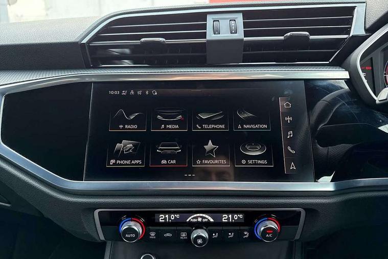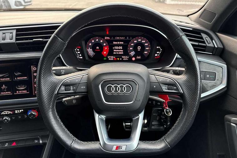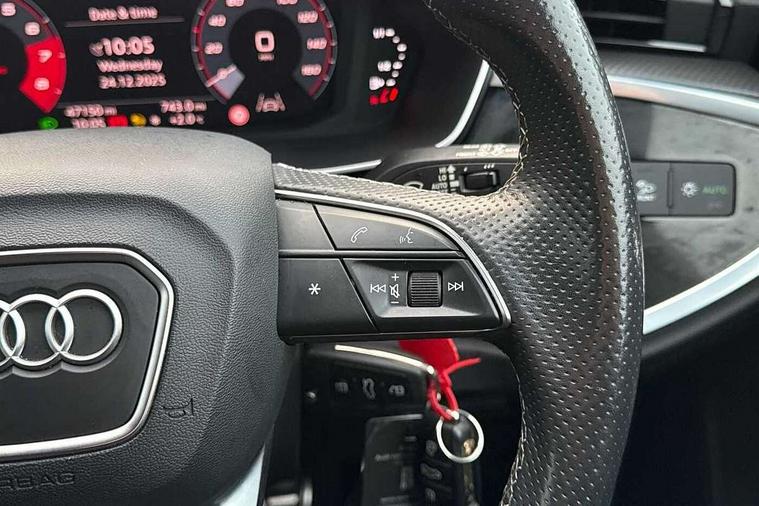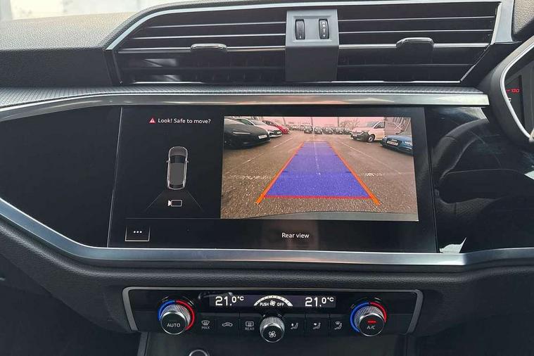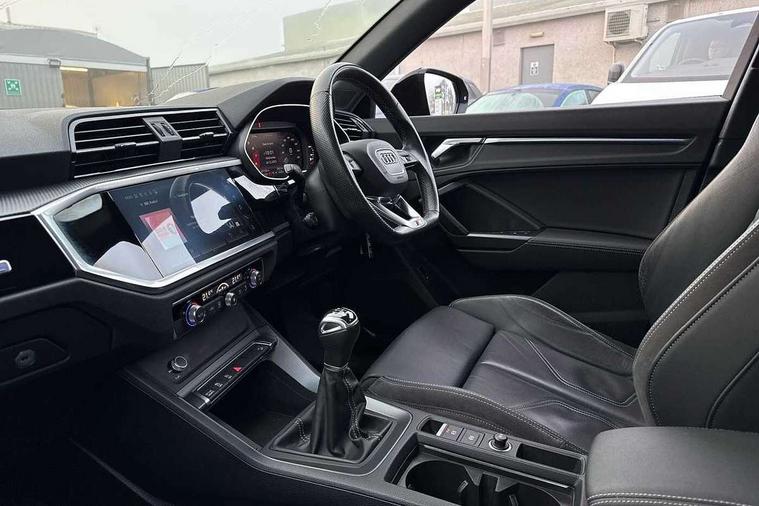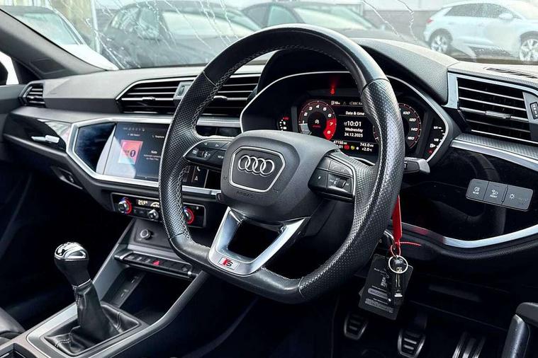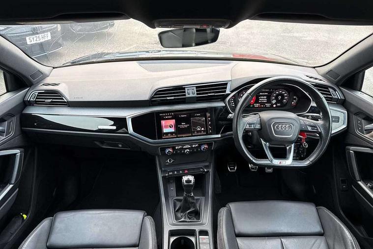 Amazon alexa Integration, Audi connect safety and service (e-call), Audi drive select, Audi lane departure warning, Audi Virtual Cockpit - 10.25" display, Bluetooth interface, Camera based traffic sign recognition, Cruise control + speed limiter, MMI Navigation Plus with high resolution 10.1 inch touchscreen colour display, Power operated tailgate, Progressive steering, Rear parking sensors, Service interval indicator, Smartphone interface includes wireless Apple carplay/Android Auto, Start stop system with recuperation, Voice control system with natural language interaction, Sports suspension, 2 USB-C ports with charge and data functions, 6 passive loudspeakers, DAB digital radio module, Acoustic windscreen, Auto dimming frameless rear view mirror, Black roof rails, Electrically folding, adjustable and heated door mirrors with integrated LED side indicators and kerb view function for passenger side, Front and rear electric windows, Front fog lights, Grille vertical bars in aluminium silver/Matt, High gloss black finish B and C pillars, LED headlights with LED daytime running lights and dynamic rear indicator, LED rear lights, Privacy glass dark tinted rear and rear-side windows (from B-pillar backwards), Rain and light sensors, Rear diffuser strip in matt titanium black, S line bumpers in contrasting Manhattan grey, 12V socket in rear centre console, 3 spoke flat bottomed multi-function leather sport steering wheel, 40:20:40 folding with manual adjustment for 60:40 forwards/backwards position and backrest angle, Adjustable rear seat bench/backrest with centre armrest and cupholder, Black cloth headlining, Dual zone electronic climate control, Front and rear black floor mats with contrast stitching in rock grey, Front and rear headrests, Front and rear roof module including reading lights, Front centre armrest, Glove compartment lighting, Height and reach adjustable steering wheel, Illuminated door sill trims with S logo, ISOFIX child seat mounting for front passenger with airbag deactivation and outer rear seat including top tether attachment point for outer rear seats, Luggage compartment light, Manual front seats with height adjustment, Perforated leather gearknob, Stainless steel luggage compartment sill finisher, Stainless steel pedals, Black styling pack - Q3, Non smoking pack - Q3, 3x3 point rear seatbelts, 6 airbags - Driver, front passenger, curtain and side windows, Audi pre-sense front with pedestrain and cyclist recognition, Electrically operated child locks on rear doors, Electromechanical parking brake, Electronic stabilisation control including ABS, ASR and EDL, Hill descent control, Hill hold assist, Pre sense basic, Seatbelt monitoring, Tyre pressure warning, Warning triangle and first aid kit, Anti theft alarm, Anti theft wheel bolts, Remote central locking, Detail dashboard around MMI touch colour display in glass look, black with surround in aluminium look, Leatherette door armrest, Piano black inlay,