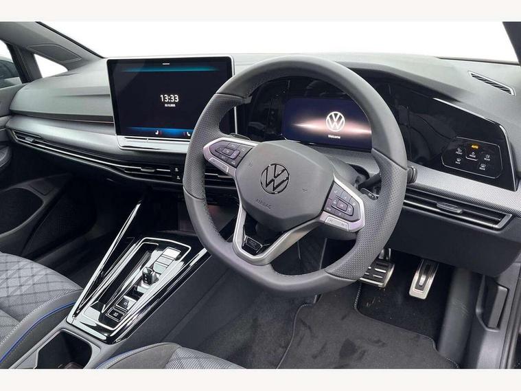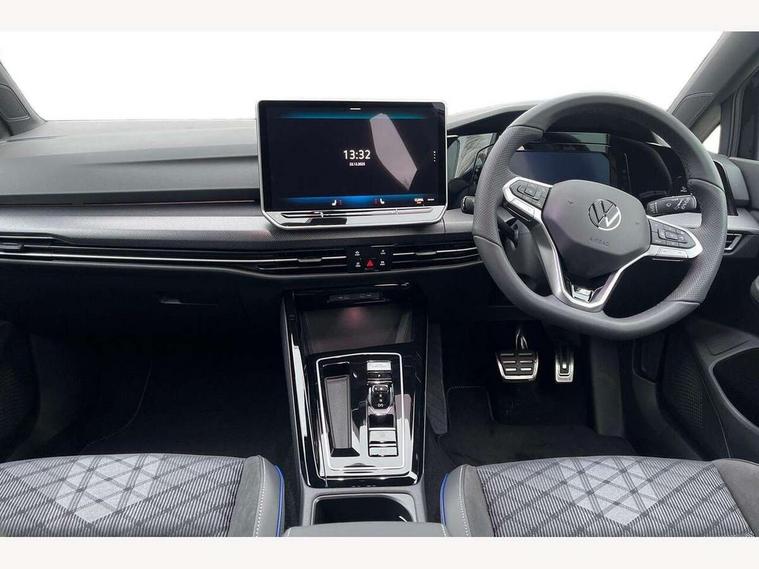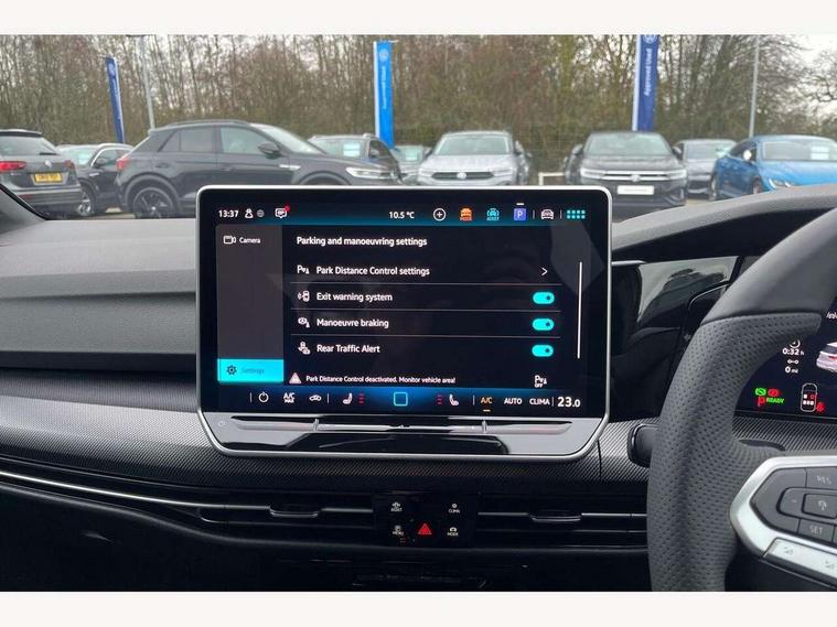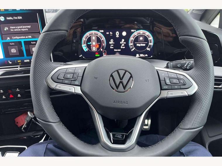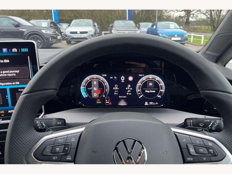 Activated carbon canister, Adaptive cruise control (ACC), Advanced driver attention and drowsiness monitor, Dynamic road sign display, Dynamic steering, E-Sim card for online connectivity, eCall emergency call system, Multi-color Digital cockpit pro, selection of different info profile possible, Multifunction front facing camera for distance control, Navigation system, Oncoming vehicle braking when turning including swerve support, Speed limiter, Speedo, rev counter, electronic odometer, trip, service interval display, exterior temperature and fuel gauge, Traffic jam assist, Voice enhancer and voice control, Warning signal and warning light for front and rear seatbelts not fastened, We connect plus preparation, We connect preparation, Wireless app connect, Hybrid propulsion system, Petrol Particulate Filter, Start-stop system with battery regeneration (recuperation - energy recovery during braking), XDS electronic differential lock for improved traction and handling, 2 USB C ports in front, 2 USB charging sockets on the centre console in the rear charging capacity upto 45W, Digital radio reception (DAB), Diversity antenna for FM reception, Gaming platform via car app, Infotainment system with 12.9" display, Mobile phone interface with inductive charging feature, 3rd brake light, Auto dimming rear view mirror, Automatic headlamp activation with Coming home and Leaving home feature, Body colored bumpers in R-Line style, Body colour door handles, Exterior ambient lighting, Exterior mirrors convex on the left and aspherical on the right, Front and rear electric windows, Heat insulating windshield made of laminated glass, LED separate daytime running light, Rain sensor, Rear exhaust tailpipe, Rear fog light on one side and reversing lights on both sides, Rear side wing doors, Rear windscreen washer and wiper with interval delay, Remote electrically foldable door mirrors, puddle lights and reverse activated passenger's door mirror, Volkswagen logo in front, illuminated lighting animation with wake up/goodbye scenario and illuminated door handles, Welcome light with surround lighting, 12V socket in front centre console, 12V socket in luggage compartment, 3 rear head restraints, 3 seat bench in 2nd row, Ambient lighting with 30 colour including LED light unit in front footwell with selectable light colour, Black roof lining, Brushed stainless steel pedals, Chrome plated radiator grille inserts, air vent surrounds and light switch surrounds, Door insert, side trim panel and arm support in leatherette, Front + rear black carpet mats, Front centre armrest, Front seat lumbar support adjuster, Integrated front head restraints, ISOFIX anchors for child seats on outer rear bench seats and on front passanger seat compatible for i-Size, Luggage compartment lighting, Manual height adjustable front passenger seat, Manually height adjustable driver seat, Plastic gear knob, Premium sports seats in front, Rear cupholder and loadthough, Sardegna cloth upholstery with front and outer rear seats Art Velour inner sides of bolsters, Single front passenger seat, Split folding backrest with centre armrest and unsplit rear seat bench, Sun visors with illuminated vanity mirrors, Titanium black instrument panel, Black exterior Styling package with Matrix LED headlights - Golf, Winter package - Golf DSG Estate/Hatchback, 3 point height adj front seatbelts + pretensioners, 3 rear three point seatbelts, ABS, Autonomous emergency braking front assist with pedestrian and cyclist monitoring, Child locks on rear doors, Driver and front passenger airbag with front passenger airbag deactivation, Electronic parking brake with auto hold, ESC (Electronic Stability Control), Extended pedestrian protection measures, Hill start assist, Rear disc brakes, Two tone horn, Tyre pressure loss indicator, Volkswagen roadside assistance, Anti theft wheel bolts, Preparation for alcohol interlock, Decorative inserts carbon grey for dashboard and front door trim panels, 18" Leeds alloy wheels, Tool kit for tyre mobility set, Tyre mobility kit Includes 12V compressor and tyre sealant,