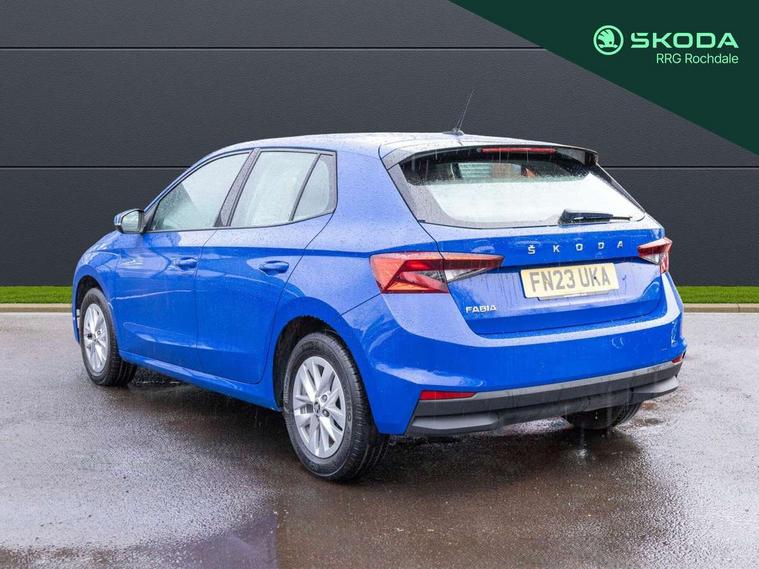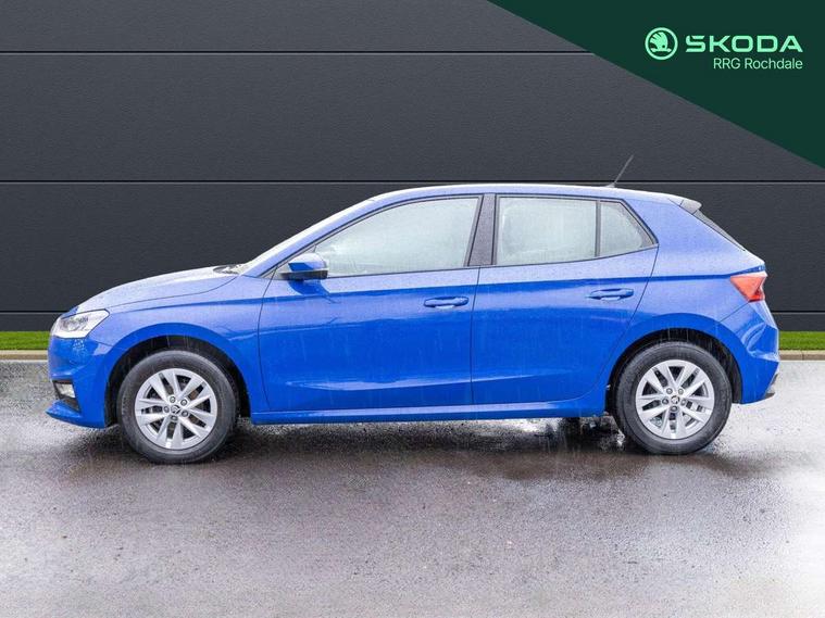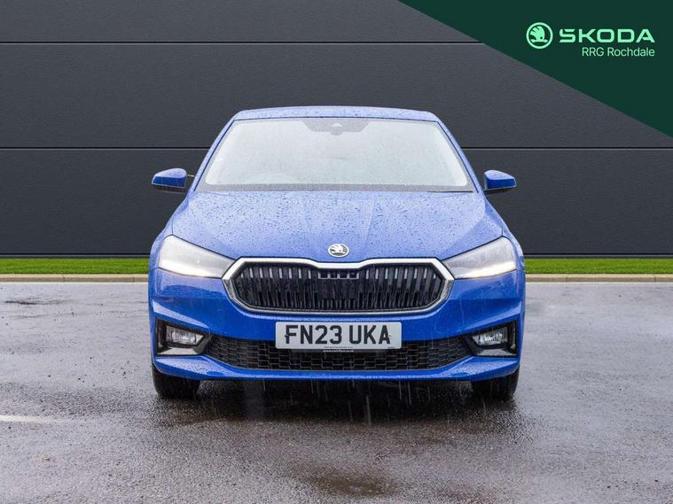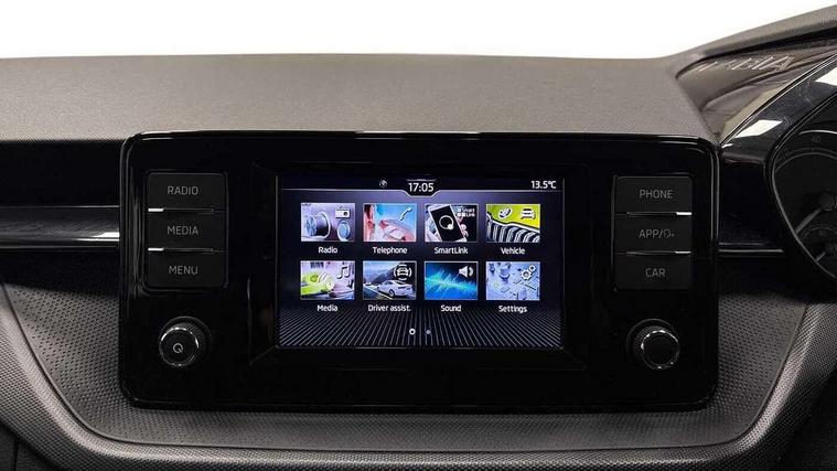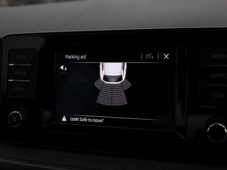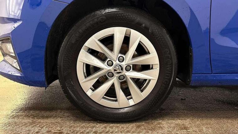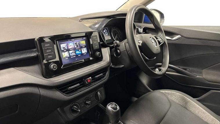 Bluetooth connection, Driver alert system - DAS, Electromechanical power steering, Exterior temperature gauge, Lane assist including road edge detection, Multifunction trip computer in black and white, Service interval indicator, Speed limiter, 2x USB-C in the front (for data transmission and charging), 4 speakers in front, Auxiliary socket for external MP3 player, DAB digital radio reception, Radio Swing with 6.5" colour display, Basic LED Headlights, Basic rear lights, Body colour door mirrors, Body coloured bumpers, Dimming rear view mirror with black frame, Door mirror integrated indicators, Electrically adjustable and heated door mirrors, Electrically adjustable front windows with function auto up/down, Front fog lights, Front window wiper intermittent control, Headlight range control - Automatic, Ice scraper in fuel cap, LED daytime running lights with coming and leaving home feature, Mechanical adjustable rear windows, Rain sensor, Rear LED fog light, Rear side wing doors, Rear window wiper with washing nozzles, Roof mounted spoiler, SKODA tailgate lettering in chrome, Third brake light, 2 reading lights in front and 2 reading lights in rear, 2 spoke leather multifunction steering wheel, 3 rear headrests, Backrest split and folding, Central console with fixed cup holder and storage box, Chrome handbrake release button, Fabric upholstery, Gearshift knob/handle in leather, Grain satin black interior door handles, Hand brake lever handle in leather, Height adjustable front headrests, Height adjustable front seats, Height adjustable steering wheel, ISOFIX and TopTether anchorage points to the outer rear seats, ISOFIX and TopTether on the front passenger seat, Luggage compartment lighting, Manual air conditioning, Manually adjustable lumbar support in front seats, Pollen filter, Rear seat bench unsplit, Single front passenger seat, Storm grey headlining, Sun visors with mirror and airbag label on passenger side, Ticket holder, 3-point height adjustable front seats belts with pretensioner and force limiter, Automatic warning lights in case of crash, Driver and passengers airbag with switch off function, e-Call+, ESC including ABS, MSR, ASR, EDS, HBA and XDS, Front and rear seat belt warning, FRONT ASSIST (AEB City and AEB Inter Urban), Front side airbags, Head airbags, One tone horn, Pedestrian protection, Three rear 3-points safety seat belts with pretensioner and force limiter including stop function for outer rear seat belts, Tyre pressure monitoring system, Anti-theft alarm system including immobiliser, interior monitoring, backup horn, and towing protection, Central locking with radio remote control, interior controls, SAFE function and 2 foldable keys, Black painted air vents, Glossy black decorative trim, Grain satin black central console cover, Grain satin black lower decorative trim, Satin black door and side trim panel in front, Anti-theft wheel bolts protection, Super-low rolling resistance tyres,