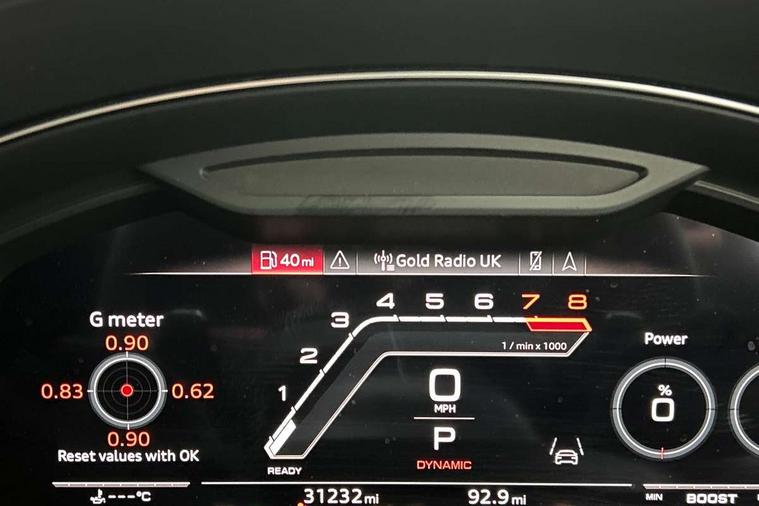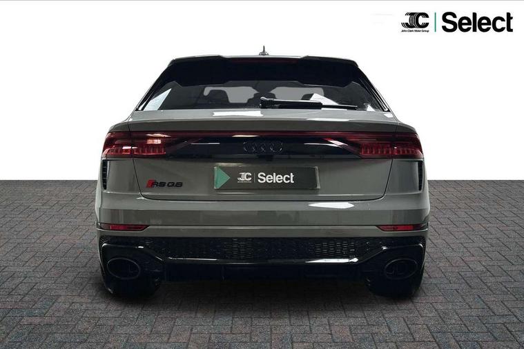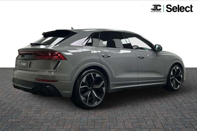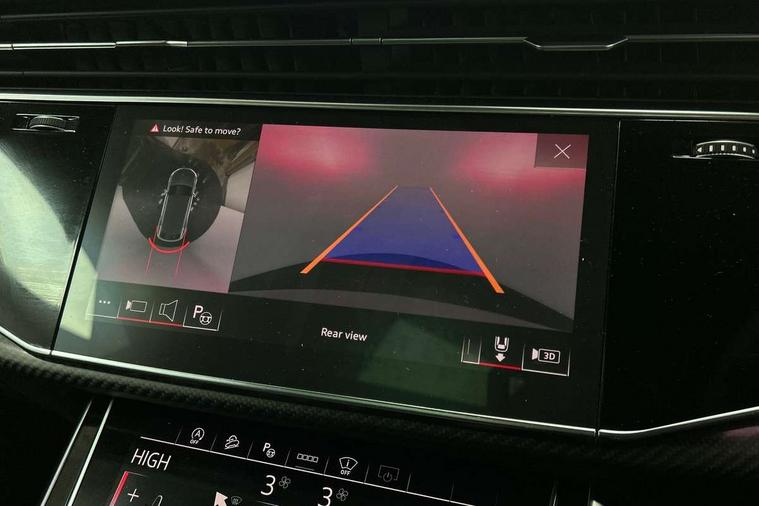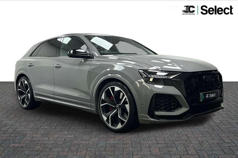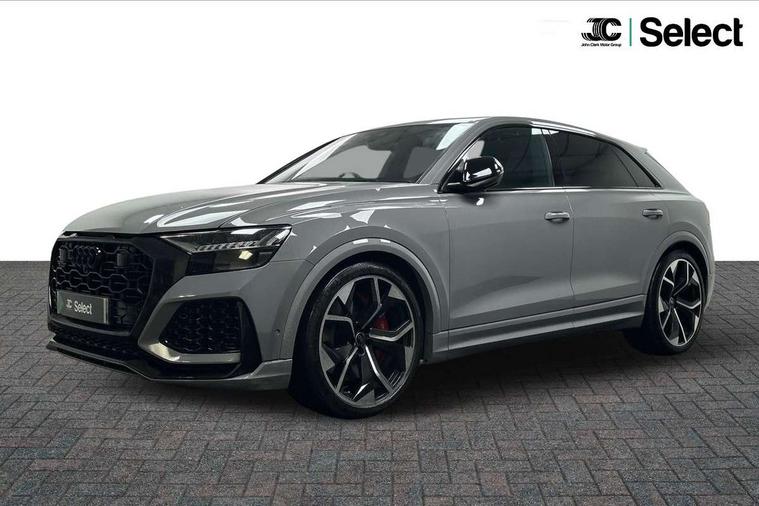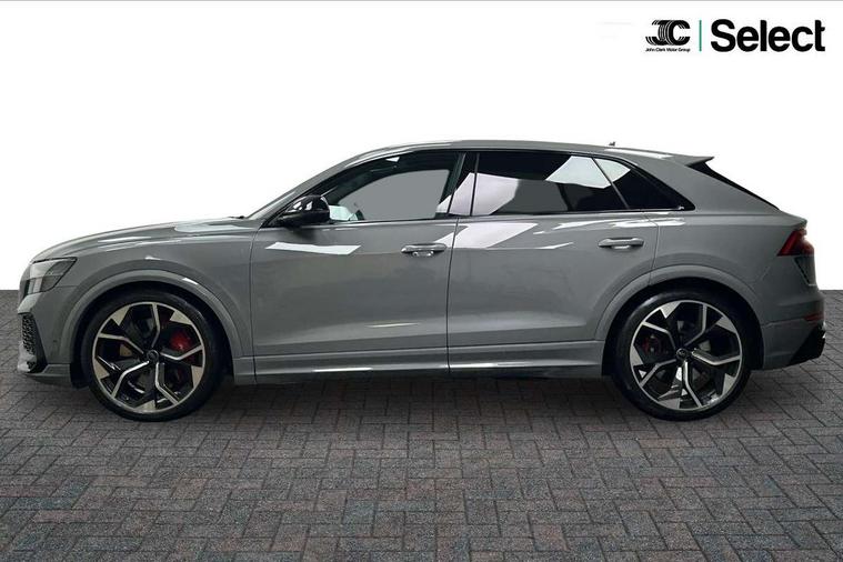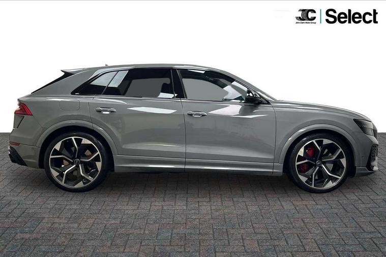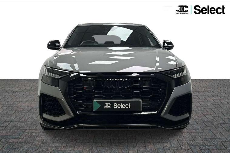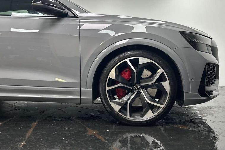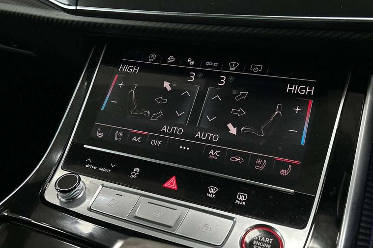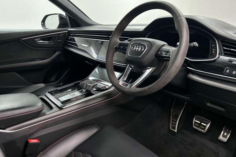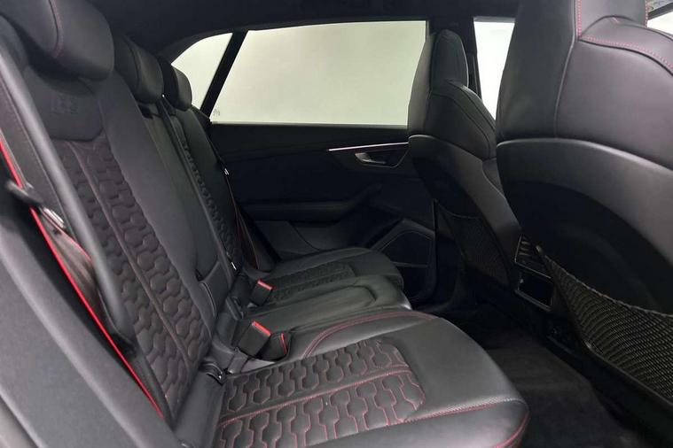 10.1" and 8.6" Dual colour touchscreens, 2 USB ports with charge and data functions in the rear, All wheel steering, Audi connect safety and service (e-call), Audi connect with Amazon Alexa Integration, Audi smartphone interface includes wireless Apple carplay/Android Auto, Audi virtual cockpit - 12.3" high resolution LCD display with fully customisable instrument cluster and RS specific menus and options, Automatic start/stop system, Bluetooth interface, Electro-mechanical PAS, Head up Display, MMI navigation plus with MMI touch, Natural voice recognition, On board computer, Operating buttons in black, glass look with haptic feedback, Power door closure, Power operated tailgate, RS Audi drive select, Service interval indicator, 48V Mild hybrid technology, Electromechanical active roll stabilisation, Quattro all wheel drive with sport differential, RS specific Adaptive air suspension, Audi music interface in rear - 2 USB ports with charger and data functions in rear, Aux-in socket, DAB Digital radio, Adaptive windscreen wipers with integrated washer jets, Audi Beam uses LEDs to project Vorsprung logo, Audi HD Matrix LED headlights in RS specific design with dynamic front and rear indicators, Auto dimming frameless rear view mirror, Electric front+rear windows, Electric panoramic glass sunroof, Electrically folding auto dimming/adjustable/heated door mirrors with memory function, LED side indicators and kerb view function for passenger side, Gloss black finish for exterior Audi rings and RS Q8 logo, Headlight washers, Heat insulating glass in windshield, Illuminated door sill trims with RS logo, LED 3rd brake light, LED signature daytime running lights, Privacy glass - dark tinted rear and rear side windows from B-pillar backwards, Rain and light sensors, Rear side wing doors, Rear wiper, RS badges on front wings, RS coming/leaving home animations in front and rear, RS manhattan grey front spoiler lip and rear diffuser insert, RS manhattan grey grille surround with honeycomb grille insert in black, RS specific bumpers in full body colour paint finish, RS sport exhaust system with black exhaust tips, 3 bench rear seats in 2nd row, 4 zone automatic climate control, 4-way lumbar support for front seats, 40:20:40 split folding rear bench seat, Black dinamica headlining, Comfort front centre armrest, Double sun visor with illuminated vanity mirror on driver and passenger side extendable, Driver and front passenger seat memory function for electrically adjustable front seats, Electric adjustable steering column with memory functionality, Electric sunblind for the rear side windows and manual sunblind for the rear window, Front head restraints, ISOFIX child seat mounting for front passenger seat and 2 outer rear seats with top tether child seat mounting for all 3 rear seats, Luggage compartment sill protection in stainless steel, Massage and ventilation function for front seats, Perforated Valcona leather upholstery + RS front super sports seats + honeycomb pattern with RS embossed logo, Rear headrests, Rear seat bench plus, Single front passenger seat, Stainless steel pedals, Air quality package - RS Q8, Anthracite black styling pack - RS Q8, City assist pack - Q8, Comfort and sound pack - RS SQ8, Multi-coloured extended LED interior lighting pack - RS Q8, RS specific styling pack - RS Q8, Tour pack - Q8, 3 point seatbelts on all seats, Audi pre sense front, Child locks on rear doors, Driver and front passenger, front side and curtain airbags, Electromechanical parking brake, Electronic Stability Control (ESC) including ABS, ASR and EDL, Front passenger airbag deactivation, Hill descent control, Hill hold assist, Predictive pedestrian protection, Seatbelt monitoring, Tyre pressure loss indicator, Warning triangle and first aid kit, Advanced key, Anti theft alarm with tow away protection, Anti-theft wheel bolts and wheel loosening detection, Immobiliser, 23" x 10.5J 5 Y spoke rotor design Audi sport alloy wheels in gloss anthracite black with diamond finish, Tool kit, Tyre repair kit,