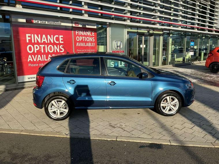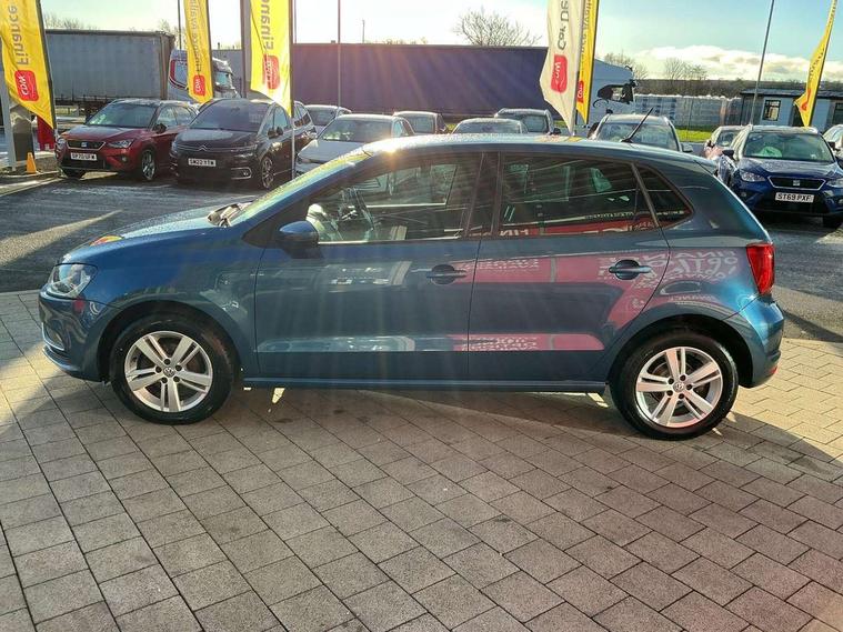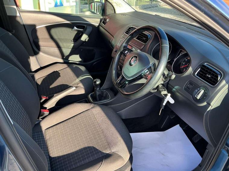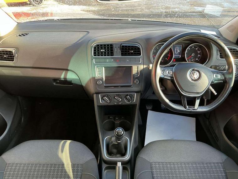 App-Connect, Bluetooth Telephone preparation, Driver alert system, Multi function display, Multifunction computer, PAS - speed related, Service interval indicator, Ultrasonic front and rear optical and audible parking sensors, Warning buzzer and light for front seatbelts unfastened, 6 speakers, Composition media system with radio, glovebox mounted CD, colour touch screen, SD card, aux-in, USB, multimedia interface, DAB Digital radio, Black grille with chrome surround, Body colour bumpers, Body colour door handles, Body colour door mirrors, Body coloured side sills, Chrome trimmed front air intake surrounds, Electric folding door mirrors, Electric front windows, Electric operated/heated door mirrors, Front fog lights with static cornering function, Front wash/wipe with interval delay, Heat insulated tinted glass 65% light absorbing from B pillar back, Heated rear window with auto timer, Rear electric windows, Rear windscreen washer and wiper with interval delay, 12V power socket in centre console, 2 bag hooks in luggage compartment, 2 cupholders, 3 rear head restraints, 3 spoke steering wheel, 4 grab handles, 60/40 split folding rear seat, Centre console storage, Chrome interior door handles, Driver and passenger sunvisors, Driver seat height adjust, Dust/pollen filter, Front door pockets, Front passenger seat height adjust, Front seat backrest storage nets, Front/rear reading lights, Glovebox, Height/reach adjustable steering column, Illuminated vanity mirror, Interior light with delay, Isofix Preparation 2 Rear child seats, Luggage compartment cover, removable, Luggage compartment lighting, Matt chrome gear lever gaiter surround, Multifunction leather steering wheel with leather gear knob/handbrake grip, Storage compartment in front doors, Storage compartment in rear doors, Sunglasses holder, Variable boot floor, Light and sight pack - Polo, 3 point height adj front seatbelts + pretensioners, 3x3 point rear seatbelts, ABS, Automatic post collision braking, Driver/front passenger airbag, Driver/Passenger whiplash optimised head restraints, ESC - Electronic Stability Control + traction control, ESP with EDL + ASR, Hill hold control, Hydraulic Brake Assist (HBA), Tyre pressure monitoring system, Alarm with remote central locking and interior protection, Electronic engine immobiliser, Air vents in Matt chrome, Matt chrome interior trim, 15" steel spare wheel,