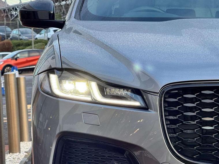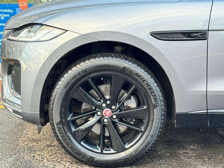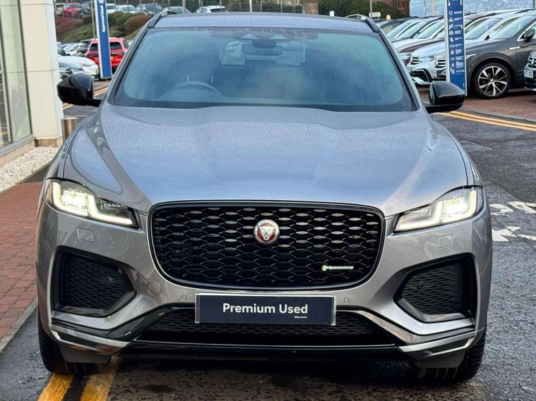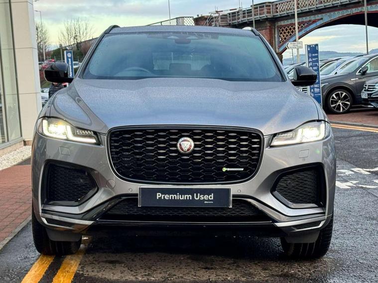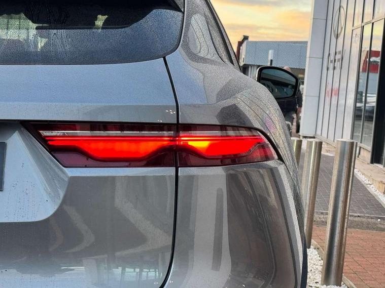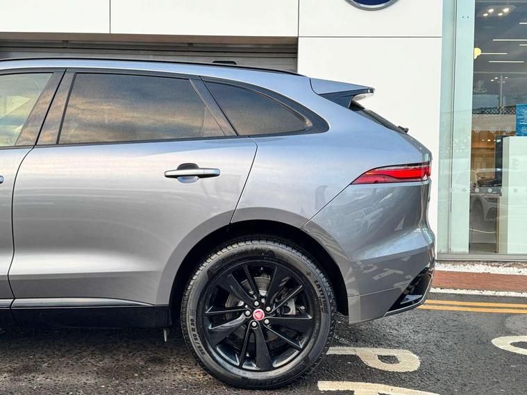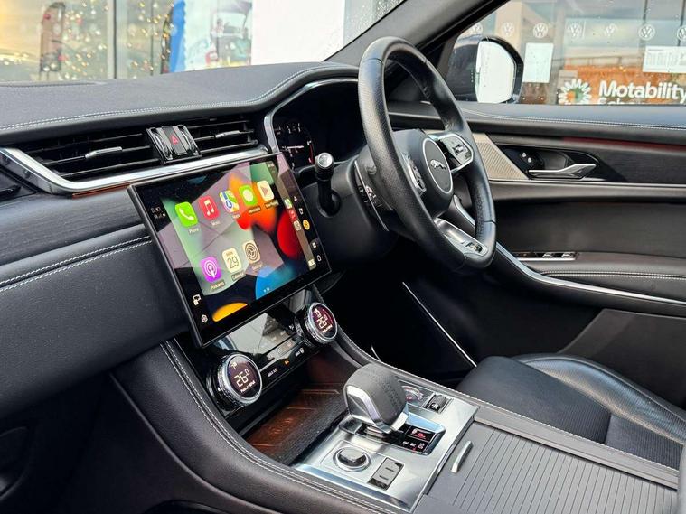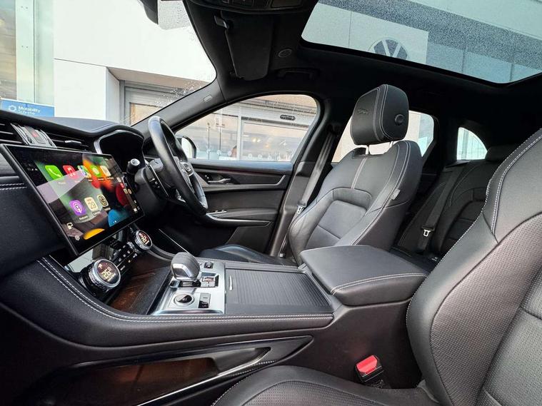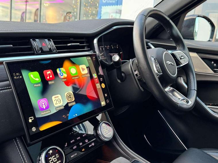 11.4" touchscreen, Android Auto, Apple car play, Bluetooth connectivity, Driver alert system, Driver condition monitor, eCall emergency call system, Eco driving style assistant, Electric power assisted steering, InControl remote, Jaguar Toggle shift selector, Lane departure warning system, Lane keep assist, Outside temperature gauge, Personalisation profile management, Pivi pro connected navigation system with app interface and media storage, Pro services and wifi hotspot, Push button starter, Service interval indicator, Speed proportional steering, Start up sequence with movement in dials and lighting, Traffic sign recognition with adaptive speed limiter, Trip computer, Voice control system, 8 speed automatic transmission, All terrain progress control, All Wheel Drive (AWD), Open differential with torque vectoring by braking, AM/FM radio, Bluetooth streaming, DAB Radio (Digital Audio Broadcasting), Dynamic volume control, InControl apps, InControl protect, iPod integration, 3 flash lane change indicators, Animated directional indicators, Approach Illumination, Auto dimming rear view mirror, Automatic headlights, Electric windows with one touch open/close and anti trap, F-Pace and R Dynamic badge, Gloss black door mirrors, Gloss black roof rails, Green tinted glass, Heated front windscreen + heated washer jets, Heated rear window with timer, Jaguar script and leaper, LED High level third brake light, LED tail lights, Non acoustic front windscreen, Privacy glass, R Dynamic badge on side door, Rain sensor windscreen wipers, Rear fog lights, Rear metal tread plates, Rear side wing doors, Rear wiper, Trailer stability assist, Variable front intermittent wipers, 12V power point front, 3 rear headrests, 3 seat bench in 2nd row, Air distribution speed, Bright metal foot pedals, Centre armrest console, Centre console with side storage, Deletion loadspace storage rails, Door sill tread plates, Fold flat front seats, Front centre armrest with storage compartment, Front door storage space, Glovebox finisher with jaguar script, Heated steering wheel, Hooks in loadspace, Illuminated glovebox, Interior front door handles with separate locking switches, ISOFIX on outer rear seats, Jaguar sense, Luggage tie downs in loadspace, Mist sensing, Multifunction steering wheel, Overhead lighting console, Overhead stowage for sunglasses, Passive front head restraints, Premium cabin lighting, Premium carpet mats, R-Dynamic branded leather steering wheel, Rear air vents, Rear armrest with twin cupholders, Rear centre headrest, Rear door storage space, Reversible boot floor, Satin chrome gearshift paddles, Shopping bag hook, Single front passenger seat, Sunvisors with illuminated vanity mirrors, Twin front cupholders with cover, Black Exterior pack - F Pace R-Dynamic/Sport, Exterior pack - F Pace R-Dynamic, Online Pack with data plan - F-Pace, 355mm front brakes and 325mm rear brakes, 3x3 point rear seatbelts, ABS, All surface progress control (ASPC), Brake pad warning light, DSC - Dynamic Stability Control, Electric parking brake (EPB), Emergency brake assist, Front airbags with passenger seat occupant detector, Front and rear seatbelt reminder, Front side airbags, Full length side window curtain airbag, Hill launch assist, Power operated child locks, Torque vectoring brake, Traction control, Tyre pressure monitoring system, Immobiliser, Keyless Start, Locking wheel nuts, Perimeter alarm, Remote central locking, Valet mode,