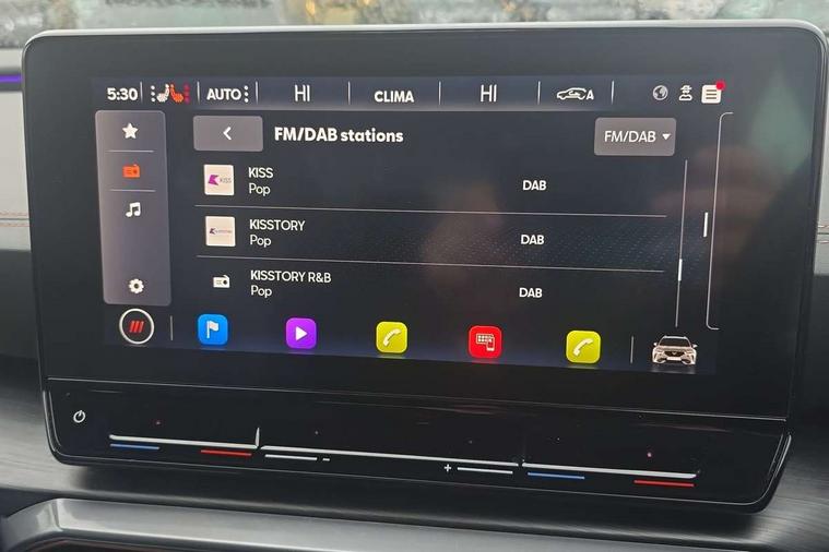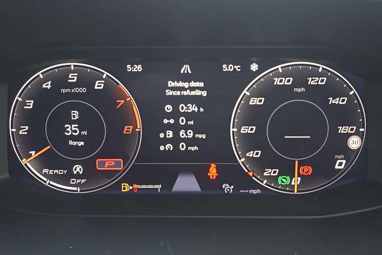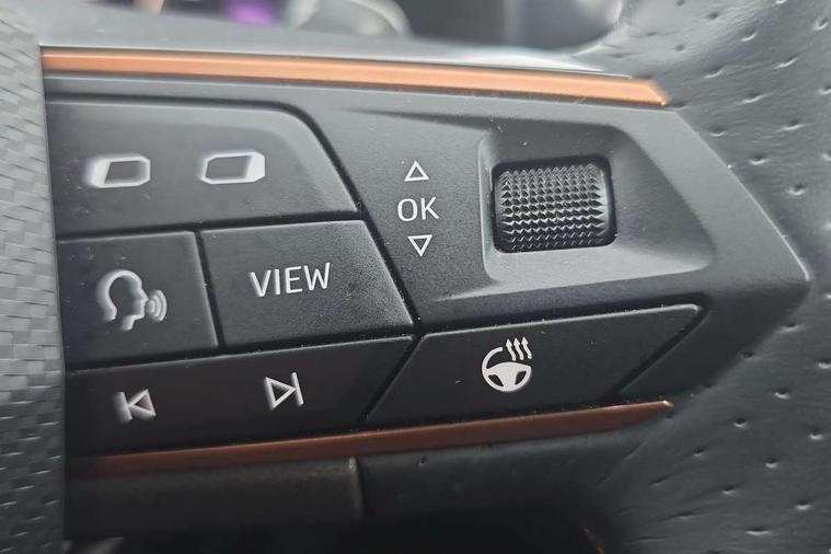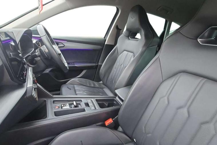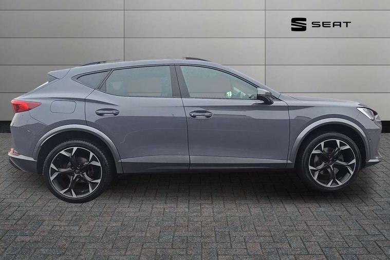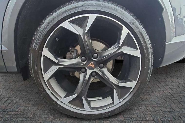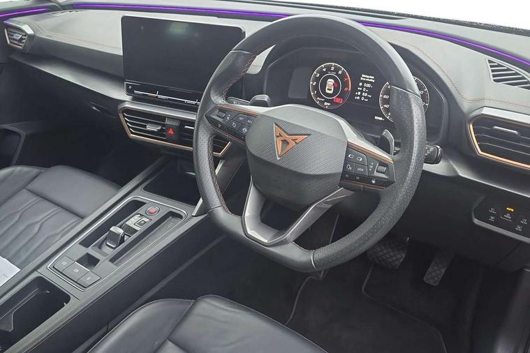 Digital cockpit and configurable dashboard, Driver alert system, Driving profile selection, E-call, Forward collision warning with automatic braking, Lane assist, Park assist (inc front/rear parking sensors), PAS, Predictive adaptive cruise control with speed limiter, Rear view camera, RPM, trip computer, outside temp gauge, instrument light brightness, low fuel warning light, lights on reminder, gearshift indicator, Service interval indicator, Start/stop system with regenerative braking, Wireless apple carplay, Wireless phone charger, Electronic locking differential and dynamic traction support, Standard suspension, 2 front and 2 rear USB type C sockets, Auxiliary input socket, DAB radio, Auto dimming rear view mirror, Body colour door handles, Body coloured bumpers, Dark grey wing mirror, Daytime running light with automatic headlight control and coming home feature, Dynamic headlight range control, Electric front/rear windows, Electrically adjustable heated and folding door mirrors with memory function, Front fog lamps with cornering function, Gloss black roof rails and window surrounds, LED Headlights, LED Taillights with dynamic indicator, Rain sensing wipers, Rear diffuser with black simulated exhaust pipes, Rear side wing doors, Rear wash/wipe, Third brake light, Tinted rear windows, Welcome lights, 12v power supply in centre console, 12V socket, 12v socket in loadspace, 2 front and 2 rear reading lights, 230V socket, 3 seat bench in 2nd row, 60/40 split rear bench seat with armrest and mechanical seat release, Dust/pollen filter, Front and rear head restraints, Front centre armrest, Height/reach adjust steering wheel, Illuminated interior front door sills, Illuminated sunvisor with mirror, Isofix, Leather multi function heated steering wheel with gear shift paddles, Luggage tie-down hooks, Single front passenger seat, Three zone climate control with control panel in rear, Variable luggage/load compartment floor, Wraparound lighting, Genuine Nappa leather Pack - Cupra, Navigation system pack with 10" navigation system - Formentor, 3 point seatbelts on all rear seats, ABS, Brake control system - ESC and brake booster, Child proof door locks, Driver and front passenger airbags with front passenger airbag de-activation, Electronic parking brake, Front and rear disc brakes, Front side curtain airbags, Hill hold control, Seat belt reminder for front and rear seats, Tyre pressure monitoring system, Anti theft alarm system, Keyless entry and start system (KESSY), Locking wheel bolts, Copper and aluminium interior detailing, 19" 'Exclusive' machined sport matte black and silver alloy wheels,