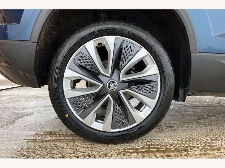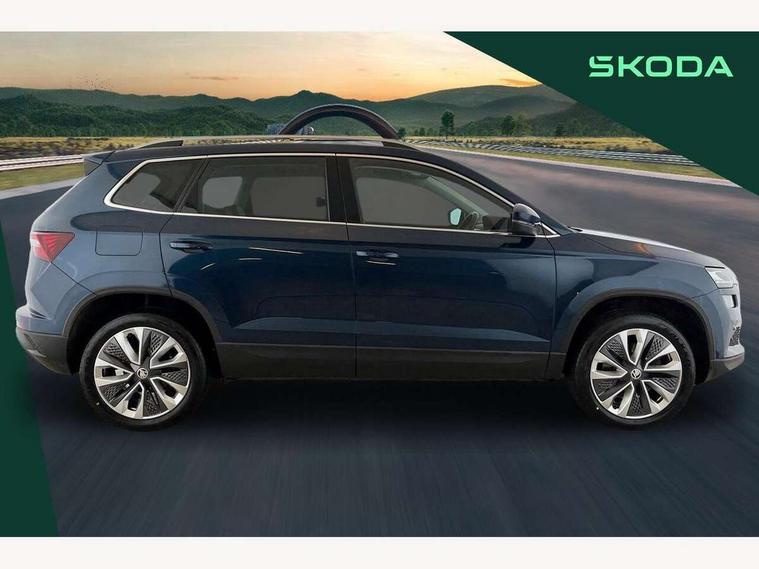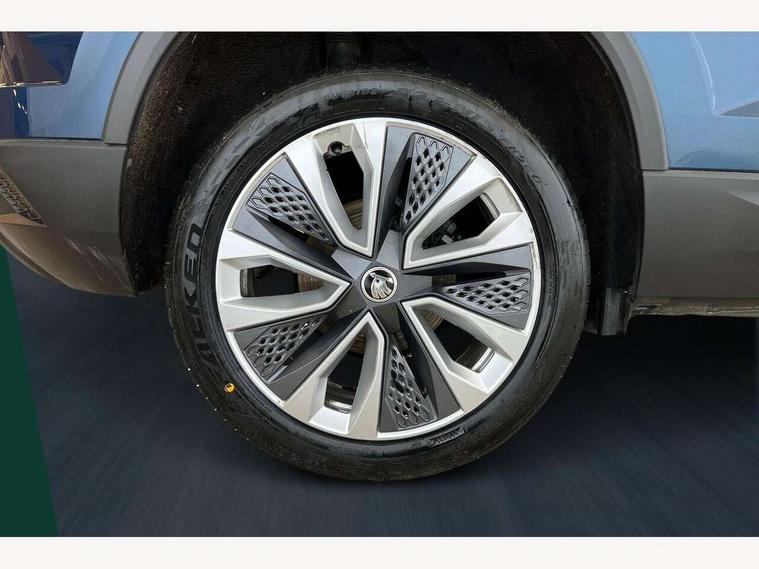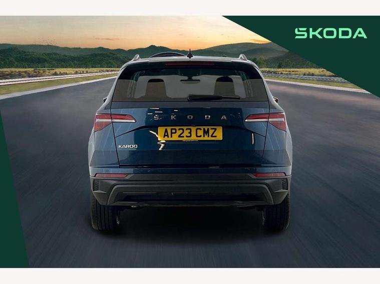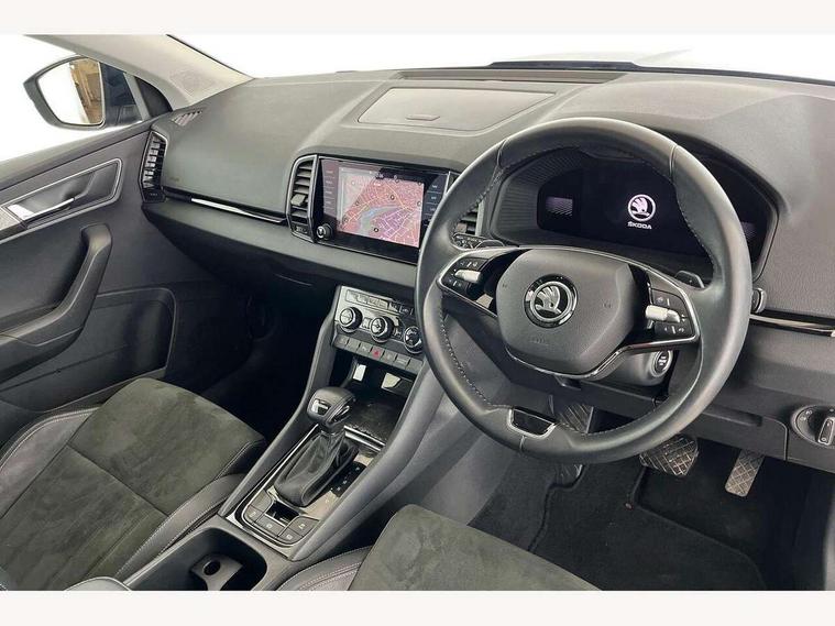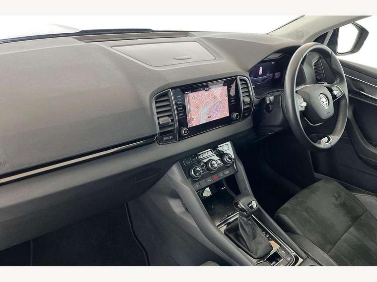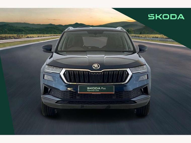 8" Digital display, Care connect, Driver fatigue sensor, Emergency services call system, Outside temperature gauge, Service interval indicator, SmartLink wireless for Apple and wired for Android, Start/stop system with regenerative braking, USB C Port x 2 in front centre console, 8 Speakers, DAB radio with Bluetooth, USB connection, Acoustic glass, Aero front windscreen wipers with intermittent function, Auto dimming rear view mirror with light and rain sensors, Black electric window control buttons, Body colour door mirrors and handles, Dynamic headlight range control with cornering light function, Electric front and rear windows with child proof lock, Heated rear windscreen, LED daytime running lights, LED rear lights with high functionality welcome effect and dynamic indicators, Light assistant (coming/leaving home/tunnel light), Plastic scuff plates, Privacy glass, Rear side wing doors, Rear spoiler, Rear window wiper with washer system and intermittent control, Safety reflectors on front doors, 1.5 litre bottle holders in driver and front passenger door panels, 12V socket in boot, 12v socket in front centre armrest with storage compartment and rear air vents, 2 Folding hooks and nets in boot, 2 spoke leather heated multifunction steering wheel with DSG paddles, 2 x Tablet holder, 3 rear height adjustable headrests, 3 seat bench in 2nd row, 4 foldable roof handles with rear coat hooks, Black floor carpet, Chrome inner door handles, Decorative door sills with KAROQ badging, Double sided boot floor, Foldable hooks in the boot, Front head restraints, Height adjustable front three point seats belts with tensioners, Height/reach adjust steering wheel, Ice scraper, Illuminated glovebox, Illuminated luggage compartment, Isofix child seat preparation for front passenger seat, Isofix child seat preparation outer rear, Manual lumbar support for front seats, Pen holder, Pollen filter, Rear boot cover, Rear reading lights, Rubbish bin door, Safety vest holder, Single front passenger seat, Storage box in upper central dashboard closed, Sunvisors with illuminated vanity mirrors, Textile floor mats, Ticket holder, VarioFlex seats with standard rear seat release, Chrome roof rails + chrome pack - Karoq, Parking pack - Karoq, Automatic door unlocking in case of crash, Automatic fuel cut off in case of crash, Child locks on rear doors, Driver airbag, Electronic parking brake with auto hold function, Emergency rear braking signal, ESC including ABS, MSR, ASR, EDS, HBA, DSR, RBS, MKB and traction control, Front side airbags, Hill hold control, Knee airbags, Passenger airbag with switch-off function, Pedestrian monitor, Seatbelt reminder signalisation and pretensioner for all seats, Three point seatbelts rear, Two tone horn, Tyre pressure display, Tyre pressure monitor, Alarm with interior monitoring, back up horn and tilt sensor with safe function, Electronic engine immobiliser, Keyless entry and start/stop, Remote central locking with 2 remote folding keys, Chrome framed air vents, 18" Procyon silver alloy wheels with anthracite aero inserts, Anti-theft wheel bolts protection, Storage on wheel cover, Tool kit,