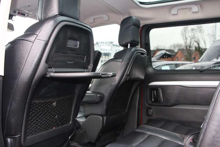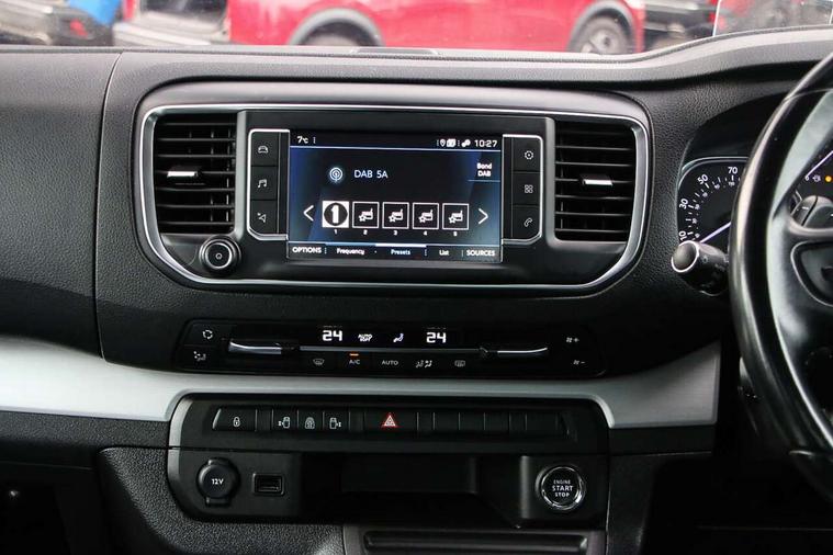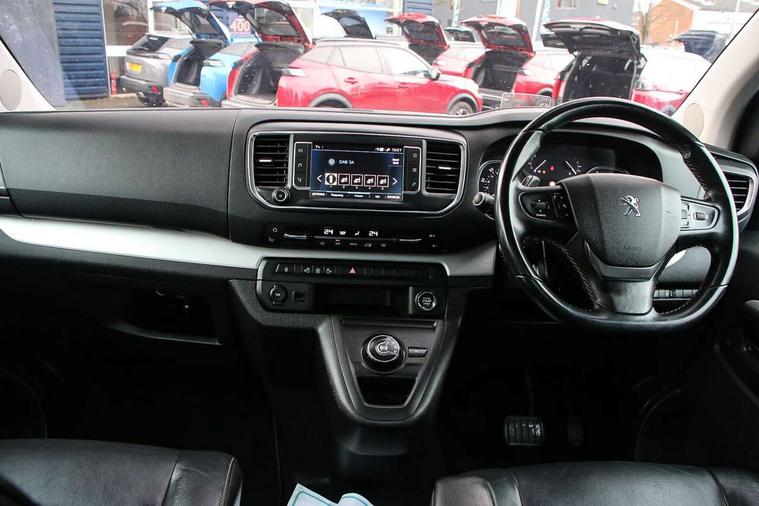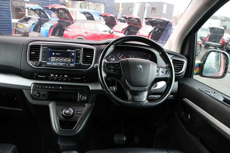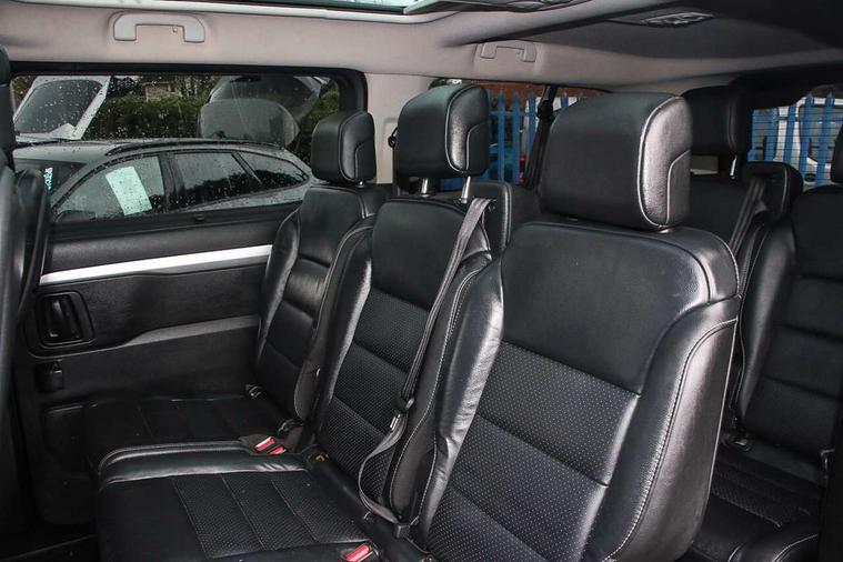 3.5" colour display instrument panel, 4 dials: rev counter, speedo with illuminated chrome plate surround, fuel gauge and water temperature, 3D connected navigation + voice control + Peugeot connect SOS and assistance, Apple car play/Android Auto, Audible lights on warning, Bluetooth telephone facility, Exterior temperature gauge with frost alarm, Head up Display, Multi function trip computer, Visio park assist 180 with front and rear sensors, blind spot monitor and reversing camera, 7" touch screen with DAB radio, USB socket, Acoustic windscreen and rear side windows, Automatic front windscreen wipers, Automatic headlights, Black/Chrome radiator grille, Body colour bumpers/side rubbing strips, Body colour door handles with chrome trim, Body colour door mirrors, Centre of rear bumper with black insert, Electric folding and heated door mirrors, Electrochrome rear view mirror, Follow me home headlamps, Halogen front fog lights, Halogen rear fog lights, Halogen rear lights, Halogen rear number plate lights, Halogen third brake light, Heated rear windows with wash wipe, LED daytime running lights, One touch electric front windows, Panoramic sunroof, Roof antenna, Split opening tailgate, Xenon headlights, 1/3:2/3 Split folding 3-seater bench in row 3 with 3 full rear seats, 12V Sockets in dashboard, rear cabin and load area, 3 seat bench in 2nd row, Additional soundproofing to passenger compartments, Additional Webasto heating, Aircraft type trays in front seat backrests, Aviation style rear seat air conditioning panel floor mounted air vents, Aviation style rear seat air conditioning panel temperature and fan speed adjustment, Aviation style rear seat air conditioning panel x 6 ceiling mounted air vents, Black carpets, Boot load restraint net, Child observation mirror, Claudia leather upholstery, Closed central storage compartment, Coat hooks, Cupholders in 3rd row seat side armrests, Driver + front passenger electric lumbar support, Driver and front passenger seat armrests, Driver and front passenger seat multi way electric adjustment, Driver and passenger side retractable grab handles with damping, Dual zone automatic air conditioning, Electric power steering with reach and rake adjustable steering column, Fixing rings x 6 in load area, Footwell illumination, Front and rear door pockets, Front cupholders x 2, Gear lever - automatic with rotary drive mode selector, Gear shift indicator, Heated front seats, Illuminated boot, Illuminated vanity mirrors, Isofix attachments on outer rear seats, LED front and rear reading lights, Lower glovebox - no lid, Map pockets on front seats, Massage function for front seats, Mistral floor mats, Mistral full grain leather steering wheel, Multifunction steering wheel, Rear parcel shelf, Refrigerated and illuminated storage in dashboard, Removable seats in 2 row, Roof lining - light grey, Satin chrome finish front interior door handles, Seatbelt not fastened audible and visual alert for front seats, Upper glovebox with lid and illumination, Window blinds, Easy entry pack - Traveller, Hi-Fi Pack - Traveller, 3 point seatbelts on all seats, ABS/EBD, Adaptive driver and front passenger airbags, Curtain airbags, Door open warning, Driver and front passenger side airbags, Driver/front passenger head+thorax airbag, Electric child locking functionality on rear windows and doors, Emergency fuel cut off, ESP, Front optimised safety headrests and rear retractable headrests (x3), height adjustable, Front ventilated disc brakes and rear disc brakes, Hill start assist, Mechanical handbrake, Tyre pressure sensor, Automatic door locking, Immobiliser, Remote central locking + deadlocks, Volumetric anti theft alarm, Brushed aluminium inlay, Chrome air vent surrounds, Decorative inlays to dashboard, door and side panels, Full size steel spare wheel,