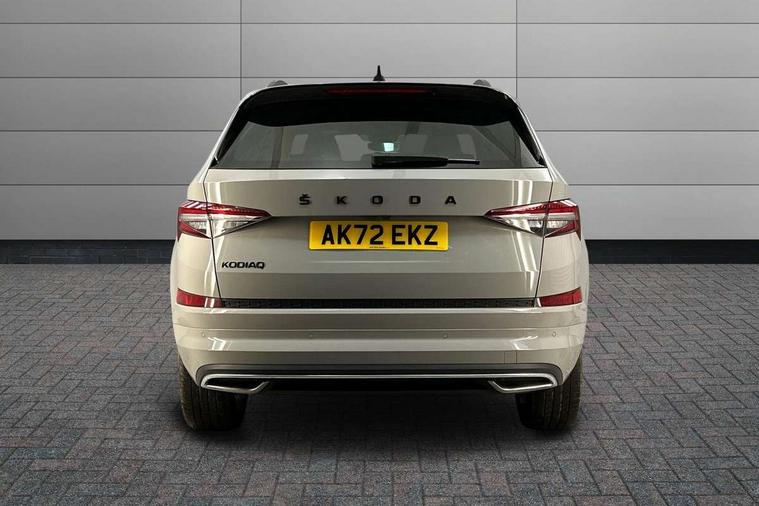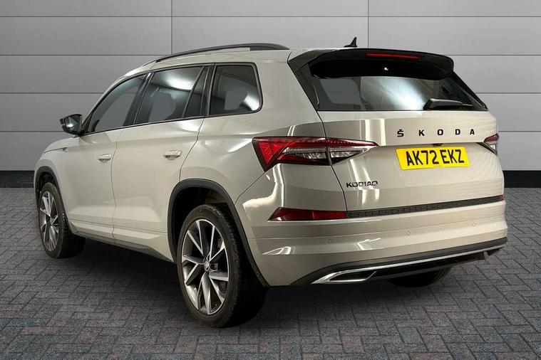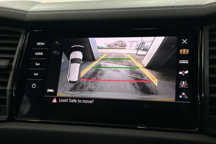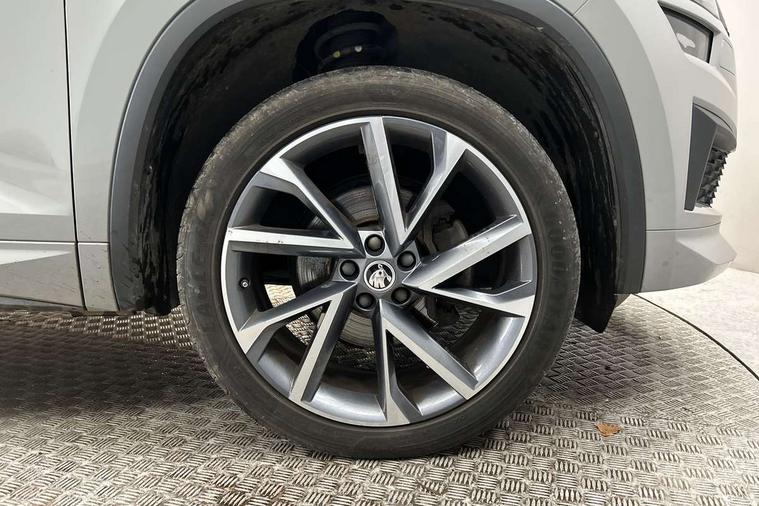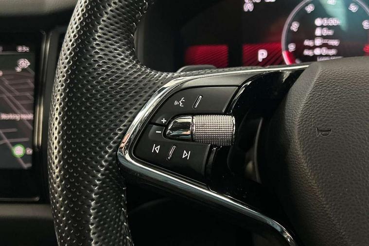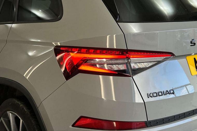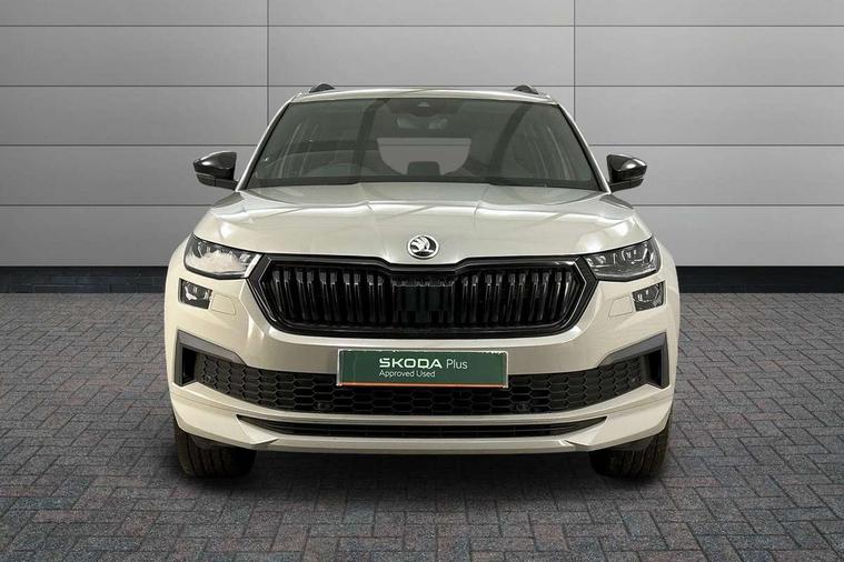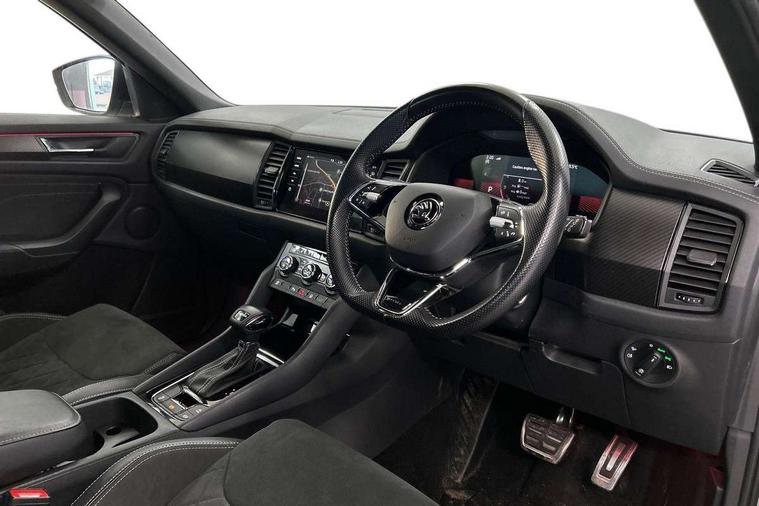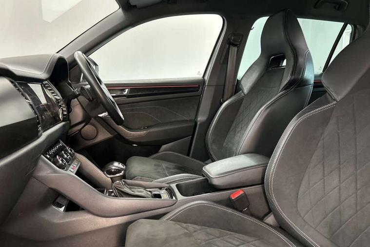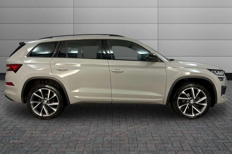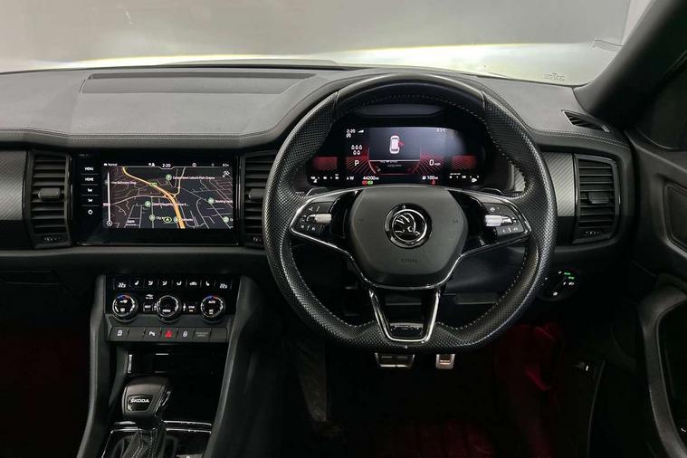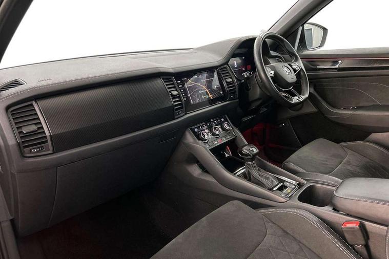 Bluetooth system, Columbus satellite navigation with 9.2" touchscreen, integrated Wi-Fi, web radio, Digital voice enhancement, E-call, ECO Stop/start function, Exterior temperature indicator, Progressive steering, Rear view camera, Smartlink wireless for apple carplay and wired for android auto, Speed limiter, Tailgate unlocking from outside, USB C Port x 2 in front centre console, Wireless charging, 8 Speakers, DAB Digital radio, Aero front windscreen wipers with intermittent function, Aero rear window wiper, Auto dimming rear view mirror, Black roof rails, Black sports styling including front grille and window surrounds, Black wheel arch surrounds, Body colour bumpers, Body colour door handles, Electric adjustable/heated/folding door mirrors, driver side auto dimming with boarding sports and memory function, Electric front and rear windows, Extended rear spoiler with finlets in gloss black, Front fog lights, Full LED matrix headlights with AFS (adaptive front light system), cornering function and AWL (all weather lighting system), Gloss black door mirrors, Headlight washers, Heated rear window, Invisible tailpipe, LED daytime running lights, LED rear fog light, LED third brake light in rear spoiler, Light assistant (coming/leaving home/tunnel light), Off-road style lower front bumper element, Privacy glass, Rain and light sensors, Rear diffuser, Rear LED lights (high functionality) with welcome effect and dynamic indicators, Rear side wing doors, Safety reflectors on front and rear doors, Sportline badge on front fender, Sports front and rear bumpers including lower rear chrome strip, Tailgate lettering in Black, Window control switches with black trim, 12V socket in boot, 2 rails with 2 hooks, 2 seat bench in 3rd row, 3 seat bench in 2nd row, 4 foldable roof handles with rear coat hooks, 60:40 foldable rear seat with sliding adjustment and backrest angle adjustment, Aluminium pedals, Black roof headlining, Bottle holders in door panel in the 1.5 litre front and 1 litre rear, Cargo storage compartments, Chrome headlight control button, Chrome interior door handles, Coat hooks on B pillar, Covered storage compartment on driver side, Front centre armrest with storage compartment, cup holder and 12V socket, Front courtesy lights, Gear shift lever with chrome frame and black gloss insert, Grey stitching in front and rear armrests and door armrests + door inserts, Height adjustable front headrests, Illuminated and cooled glovebox, Illuminated luggage compartment, Isofix child seat fittings in outer rear seats with top tether, Manually adjustable steering column, Microsuede door panels, Net programme in boot (1x horizontal Net, 2x vertical Nets), Overhead glasses storage compartment, Pollen filter, Rear centre armrest with cupholders, Single front passenger seat, Sliding trunk cover, Small Bags on the inner sides of the front backrests, Sports seats, Sunvisors with illuminated vanity mirrors, Three rear height adjustable headrests, Ticket holder on A Pillar, Umbrella in door panel, Variable boot floor, LED Interior light pack - Kodiaq, Auto door release and activation of warning lights in the event of an accident, Child locks on rear doors, Driver and front passenger airbag with knee airbag and front passenger airbag deactivation, Electronic parking brake with hill start assist, Emergency rear braking signal, ESC (incl. ABS+MSR+ASR+EDS+HBA+DSR+RBS+MKB), Front assist with autonomous emergency braking, Front side airbags with curtain airbags, Fuel cut off safety device, Height adjustable front 3 point seatbelts + pretensioners, Hill hold control, Rear disc brakes, Safety vest holder in door, Seat belt reminder for all seats, Three point rear seat belts, Two tone horn, Tyre pressure monitor, Alarm with interior monitoring and tilt sensor with safe function, Anti-theft wheel bolts, Immobiliser, Keyless entry and start system (KESSY), Remote central locking with 2 keys, Black air vent surround, Carbon finish dashboard and door inserts, Grey stitching in dashboard, 20" Vega Anthracite alloy wheels, Temporary spare wheel (space saver),