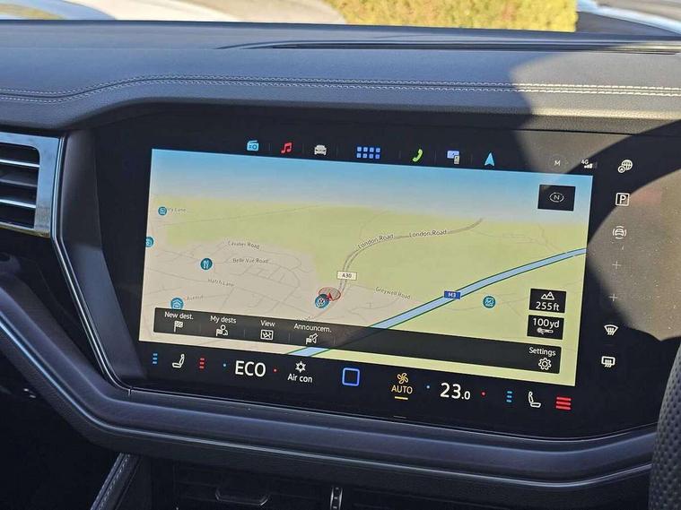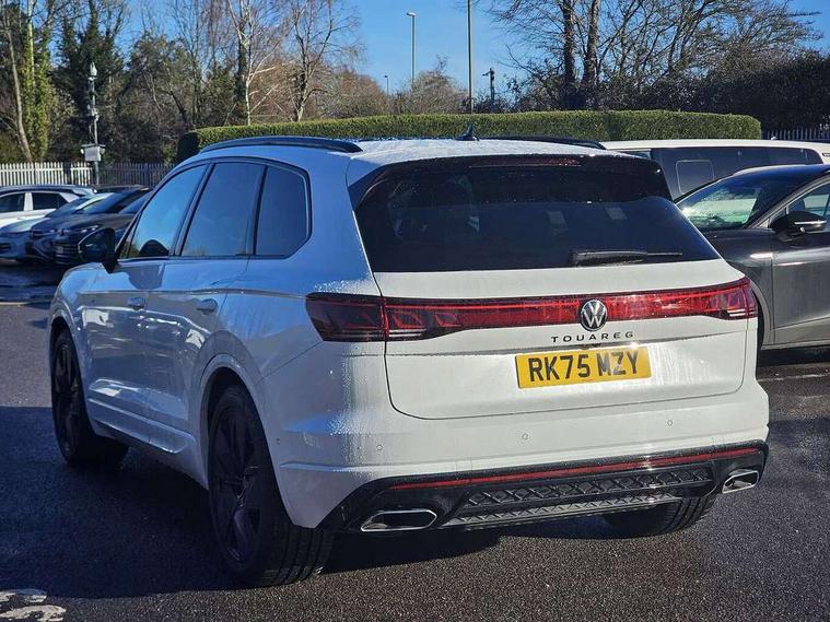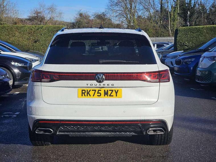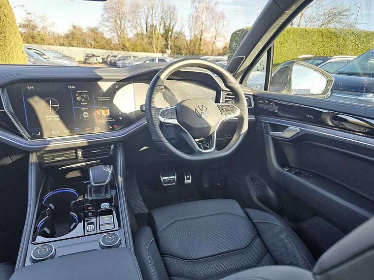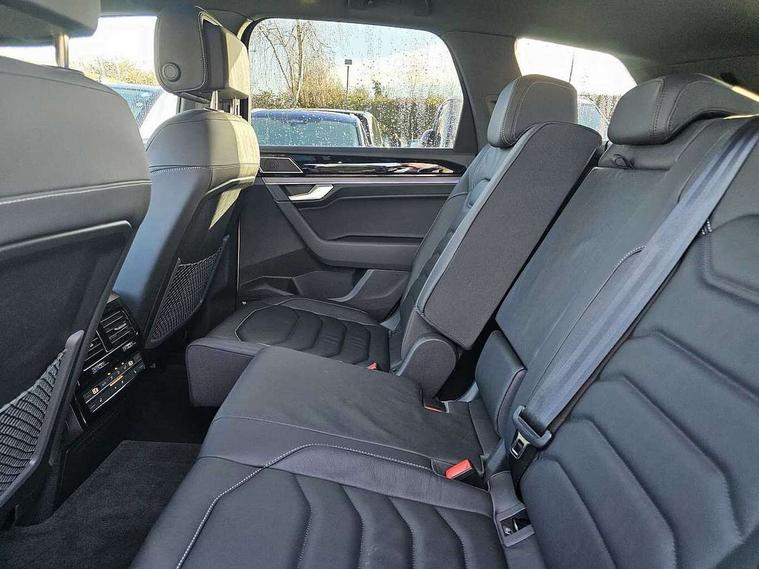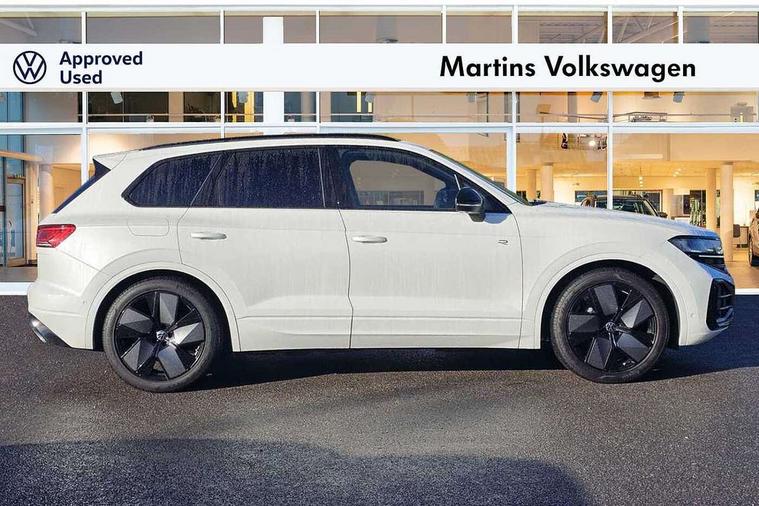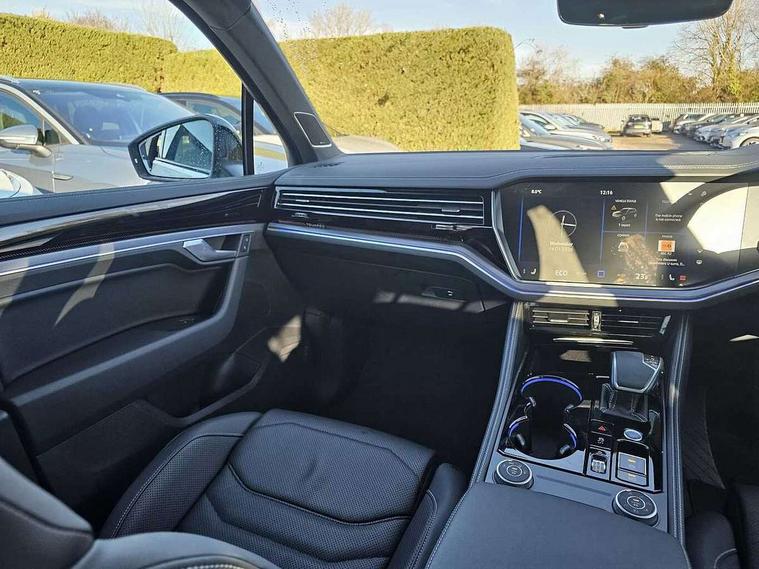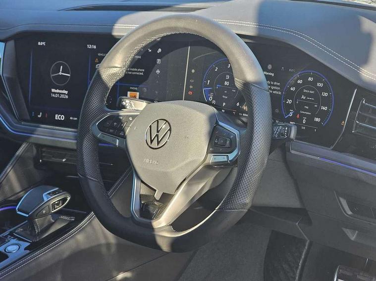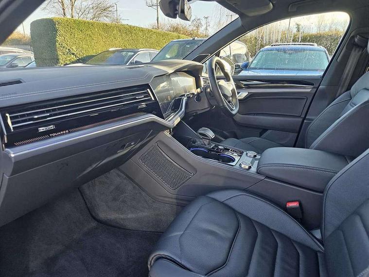 15" Screen Top infotainment system Premium (MIB3), Adaptive cruise control, Advanced driver attention and drowsiness monitor, Driver profile selection, Dynamic road sign display, E-Sim card for online connectivity, eCall emergency system, Innovision cockpit, Intelligent park assist, Mobile phone interface with inductive charging, Multi-colour Active Info display, Park Assist - Sensor controlled steering aid to assist parallel or bay parking, PAS, Warning signal and warning light for front and rear seatbelts not fastened, Wireless app connect, Adaptive chassis control, DAB Digital radio, Diversity antenna for AM/ FM reception, We Connect and We Connect Plus functionality, Automatic coming/leaving home lighting function, Automatic headlights, Black door mirrors, Black style comfort bumpers, Dynamic headlight range control with dynamic cornering light, Electric front tilt/slide panoramic sunroof and fixed rear sunroof, Electrically power adjustable, heated, folding, auto dimming, front passenger exterior door mirror lowering function, External USB type C socket and charging sockets, Gloss black roof rails, HD LED Matrix beam plus digital headlight projection with variable light distribution, Headlight washers, Highway light, LED 3rd brake light, LED daytime running lights, LED rear combination lamp with variable lighting functions and special styling, Poor weather light, Rain sensor, Rear exhaust tailpipe, Rear fog light with back up light on both sides, Rear light bar and illuminated logo, Rear side wing doors, Rear wiper, Stainless steel door sill protection, 12V socket in centre console, 3 rear headrests, 3 seat bench in 2nd row, 4 zone climate control, Airbag label on sun visor and B-pillar, Brushed stainless steel pedals, Double sun visors with illuminated vanity mirrors, Front + rear carpet mats, Front centre armrest, Leather wrapped multifunction sports steering wheel, heated, with touch control and shift paddles, Mechanical rear seat release, Power adjustable lumbar support in front, Power seats in front, right side with memory features and seat cushion depth adjustment, Rear seat backrest and split folding with center armrest, Single front passenger seat, Memory pack plus - Touareg, 3 point seatbelts, outer rear with ECE lable, ABS, Child locks on rear doors, Curtain airbags, Driver and front passenger safety-optimised head restraints, Driver/Front Passenger airbags, Extended pedestrian protection measures, Front assist, Front seat side impact airbags, Generative braking with start and stop system, Height adjustable 3 point front seatbelts with pre tensioners, Passenger airbag deactivate switch, Three 3 point rear seatbelts, Two tone horn, Warning triangle and first aid kit, Alarm system with interior protection, Easy open and close sensor controlled luggage compartment opening and closing with remote unlocking, Keyless Access Keyless locking and starting system with SAFELOCK, Aluminium decorative inserts, Black decorative trims, Gloss black decorative inserts in centre console, Tool kit,