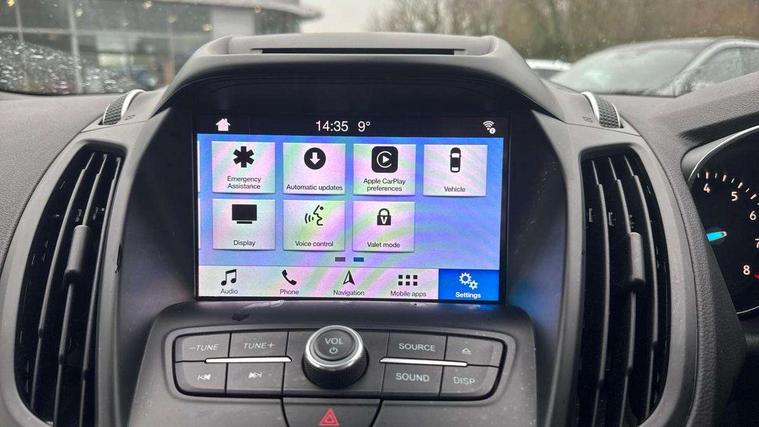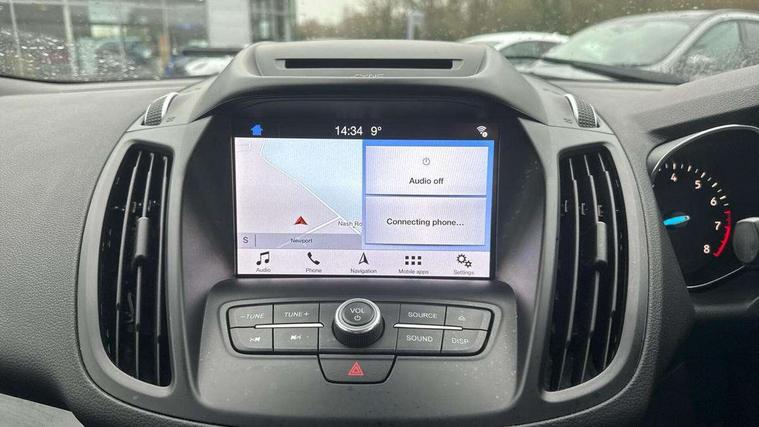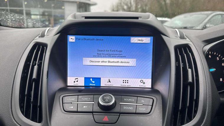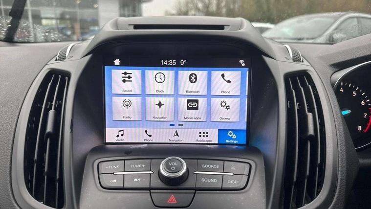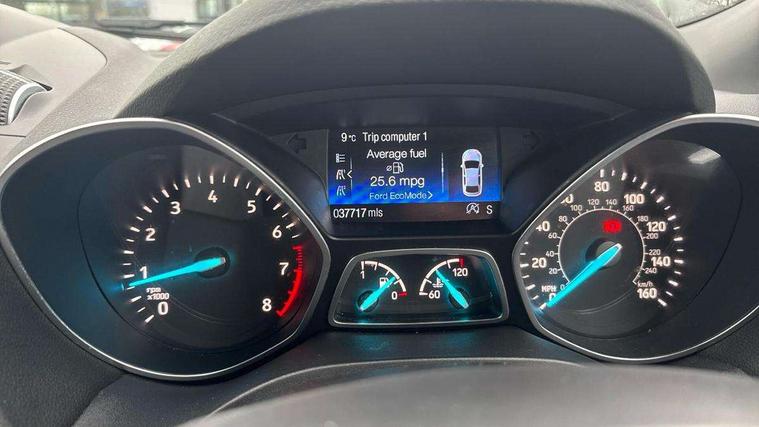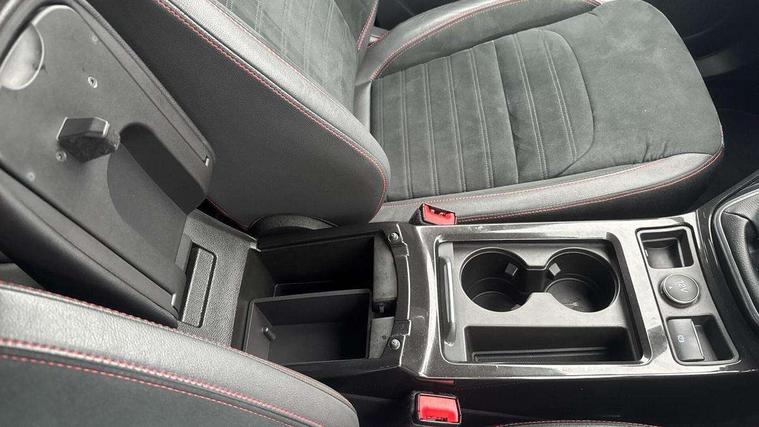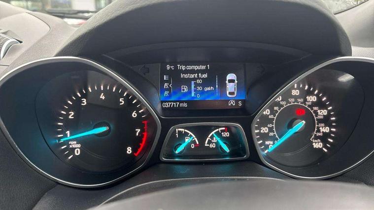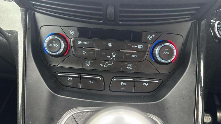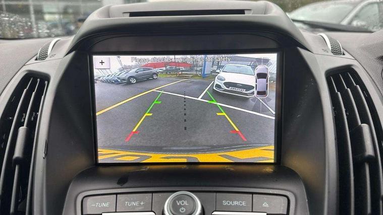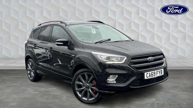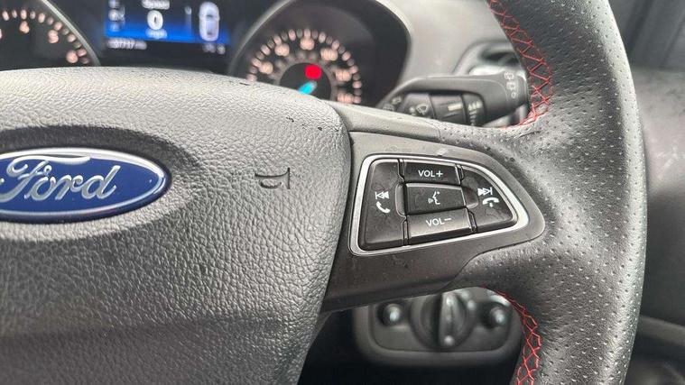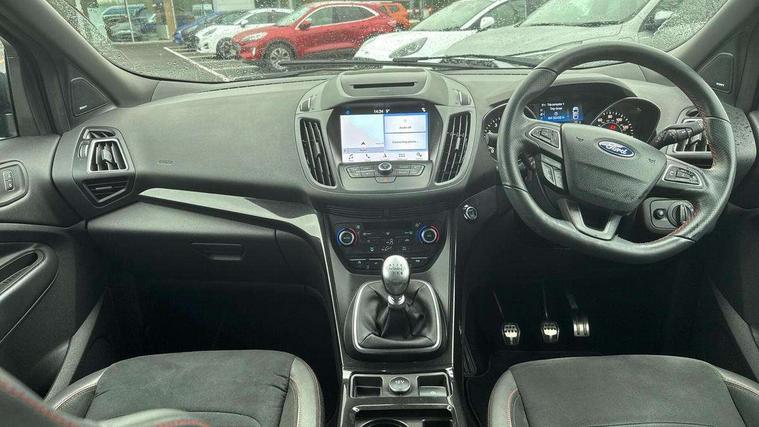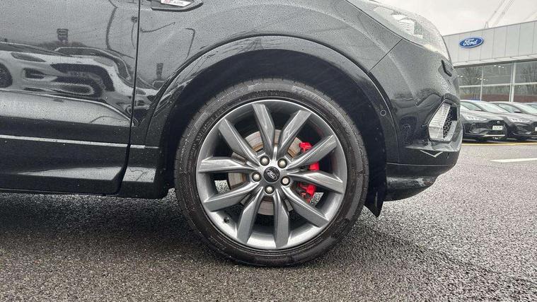 Appearance pack - Kuga/ST-Line, 19" 5x2 rock metallic alloy wheels, Mini steel spare wheel, Engine immobiliser, Keyless entry, Keyless start with 'Ford Power' starter button, Locking wheel nuts, MyKey system, Remote powered central double locking doors, Thatcham category 1 alarm, 2 USB ports, Auxiliary socket for external device, Remote audio controls on steering wheel, 3 point seatbelts on all 3 rear seats, ABS/EBD, Airbags - front driver/passenger, front & rear side, curtain, drivers knee, EBA, Electric traction assist system, Electronic Stability Programme, Front passenger airbag deactivation switch, Hill start assist, Intelligent Protection System (IPS), Red brake calipers, Tyre pressure monitoring system, Auto dimming rear view mirror, Black mirror caps, Body colour bumpers, Body styling kit - Body colour front/rear/side skirts, door claddings, wheel arches, high gloss black rear mesh, silver skid plate and rear diffuser, Electrically operated and heated door mirrors with side indicators, Electrically operated front and rear windows with global closing, Front fog lights, Front scuff plate, Large rear spoiler, Power folding door mirrors, Power opening panoramic glass sunroof, Quickclear heated windscreen, Rain sensing wipers, Tailgate wash/wipe, Twin exhaust pipes, 6 way manually adjustable passenger seat with lumbar support, 60/40 split/folding rear back and cushion, Alloy Foot Pedals, Auxiliary power socket in luggage area, Centre console with stowage tray/bottle holder/CD stowage/front and rear 12V power point, Dark headliner, Driver/passenger front seatback pockets, Dual electronic automatic temperature control, Flat bottomed leather steering wheel with red stitching + gear knob, Floor mats with red stitching, Folding rear centre armrest, Footwell courtesy lights front and rear, Front head restraints, Front overhead courtesy lights with theatre style dimming and delay, Front/rear reading lights, Isofix system on outer rear seats, Multi-colour ambient interior lighting, Part leather upholstery, Reach + rake adjustable steering column, Rear head restraints, Sports style front seats, Stowage unit in upper instrument panel, Tie down hooks, Tonneau cover, Variable intensity instrument illumination, Apple car play/Android Auto, Enhanced active park assist including perpendicular parking pull out assist, flank guard and front/rear parking sensor, EPAS, Hands free telephone, Trip computer, Sports suspension,