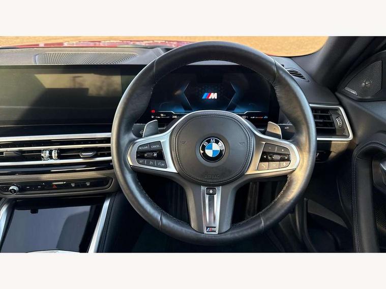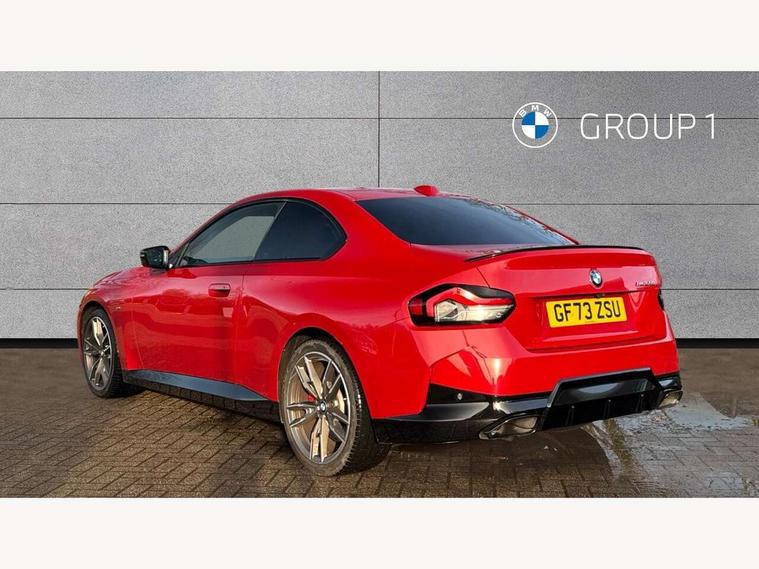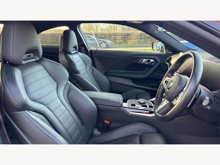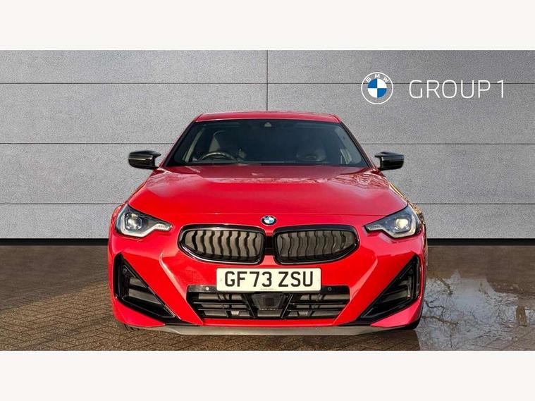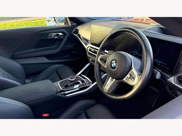 2 USB connections for charging and transferring data, 4G LTE connectivity with hard wired 4G network sim card, Attentiveness assist, Bluetooth with USB, BMW ConnectedDrive online services, BMW Intelligent Personal Assistant, BMW operating system 8 with variable, configurable widgets display information in real time, BMW Teleservices, Check Control warning system for monitoring of lights and door/luggage compartment open warning, Direct selection buttons, Drive off assistant, Driving experience switch with sport+ mode, Eco pro mode, Electric power steering, Front and rear parking sensors, Front/rear Parking distance control, iDrive controller with turn and press function, Integrated owners handbook, Intelligent functions, Live cockpit plus with nav function 12.3" instrument cluster and 14.9" centre display, Oil sensor for level and grade, Optimum shift indicator, Personal Profile, Touch operation on control display, Variable sport steering, Widescreen multi-media display, WiFi interface for wireless connection of mobile terminal devices, Aluminium lightweight construction, Balancer shaft, BMW TwinPower Turbo inline 6-cylinder petrol engine, Double VANOS, Drive performance control with ECO PRO comfort + sport mode, High precision injection, M Sport differential, Petrol Particulate Filter, Sport automatic steptronic transmission with gearshift paddles, manual gearshift time display, launch control, coasting idle ECO PRO/COMFORT modes, Twin scroll turbocharger with Valvetronic, xDrive with rear orientated application, DAB tuner, Acoustic windscreen wipers for reduced driving noise, Adaptive LED Headlights, Automatic windscreen wipers and automatic headlight, Automatically dimming rear view mirror, BMW individual lights shadow line, Body colour door handles flush with door surface, Body colour front and rear bumpers, Daytime running lights, Electric windows - front and rear, with open/close fingertip control and trap release, Exhaust tailpipes x 2 - free form finisher in black chrome in left and right, Exterior air inlets in front bumper with embellishers in high gloss black, Fading support, Flap controlled M Sport exhaust system, Front and rear bumper system with replaceable deformation elements, Front door sill finishers in black plastic with BMW designation, Front ornamental grille frame in high gloss black, Front windscreen wipers with integrated washer jets, Green tinted heat protection glazing, High beam assistant, High gloss black exterior M mirror caps, High gloss black sill, bumper trim sides and diffuser insert, High gloss shadowline exterior trim in mirror triangle cover, mirror cover panel, mirror bezel and window border, High level third brake light, Indicators integrated int mirror housing, LED registration plate light, LED technology rear tail lights, brake lights and turn indicators, Lightweight engineering, M Sport spoiler - Gurney in body colour, Model designation and M badges in cerium grey, Model designation on right side of tailgate, Rear boot, Rear fog lights, Reversing light in rear light cluster, Shark fin antenna, Side frame decorative moulding black high gloss, Single part LED rear lights with smoked glass components, Sun protection glass, Trailer stabilisation logic, Visible VIN plate, xDrive designation on left tailgate, 12V power socket in front centre console with blanking plug, 2 cupholders in front centre console, 2 zone automatic air conditioning, Ambient lighting, Compartment in front of cupholder, Conditioned based service, Driver seat backrest width adjustment, Electric front seat adjustment with driver memory, Front and rear side armrests integrated into door trim, Front armrest, Front door pockets, Front head restraints, Front M Sport seats, Front passenger seat lumbar support, Heated front seats, Illuminated glove compartment with separate small compartment, Lumbar support for driver, M headliner Anthracite, M sport leather steering wheel, M240i badge in instrument cluster, Manually adjustment steering wheel column, Rear seat backrest with manual 40:20:40 split folding, Rear seat centre foldable armrest with integrated cup holder, Single front passenger seat, Storage compartment between rear seats, Storage tray and compartment with cover in centre console, Sun visors with vanity mirrors and insert tab, Through loading system with 40/20/40 split folding 2 rear seat in 2nd row, Two folding rear seat headrests, Velour floor mats, Vernasca leather upholstery, Additional storage compartment pack without USB - 2 Series Coupe, Connected pack professional - 2 Series Coupe, Interior and exterior mirror pack - 2 Series Coupe, M Sport exterior styling aerodynamics pack - 2 Series Coupe M240i, 2 tone horn, Anti lock braking system (ABS) with cornering brake control, Automatic Stability Control (ASC), BMW emergency call, Brake drying, Child seat ISOFIX attachment for the two outer rear seats, Crash sensor activating of airbags, Unlocking doors, hazard warning lights, interior light, safety battery terminal, Deactivation of fuel pump in the event of a crash, Driver and front passenger airbags, Driver and front passenger side airbags, integrated in the door side seat backrest bolsters for all seat variants, Dynamic brake control, Dynamic stability control + (DSC+), Dynamic Traction Control - DTC, Electrically operated hand brake including automatic hold function and automatic release when driving off, Front and rear disc brakes, Head airbags for all 4 outer seats, M seat belts, M Sport brake with red calipers, Manual deactivation of front passenger airbag, Seat belt security check for driver and front passenger, Seatbelt warning, Side impact protection, Three point seat belts on 4 seats including front belt stopper, pyrotechnic belt tensioners and belt force limiters, Tyre pressure sensor, Warning triangle and first aid kit, Alarm system (Thatcham 1) with remote control and electronic engine immobiliser, Central locking switch for all doors, fuel filler cap and luggage