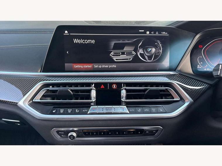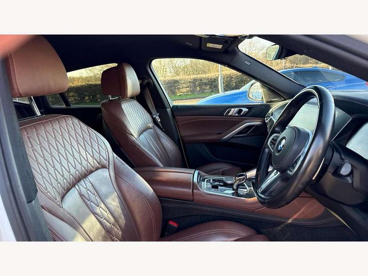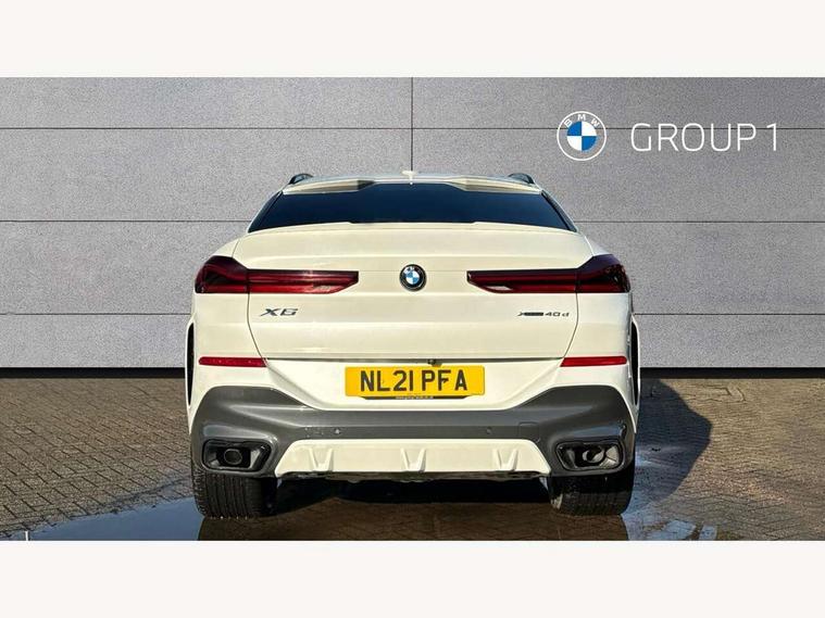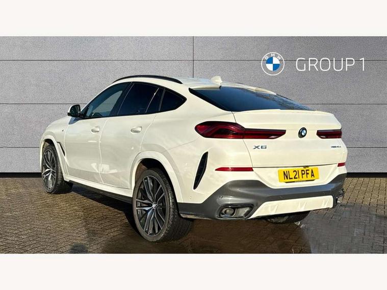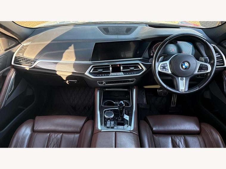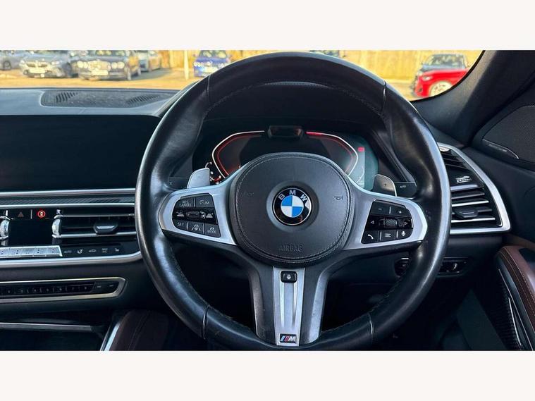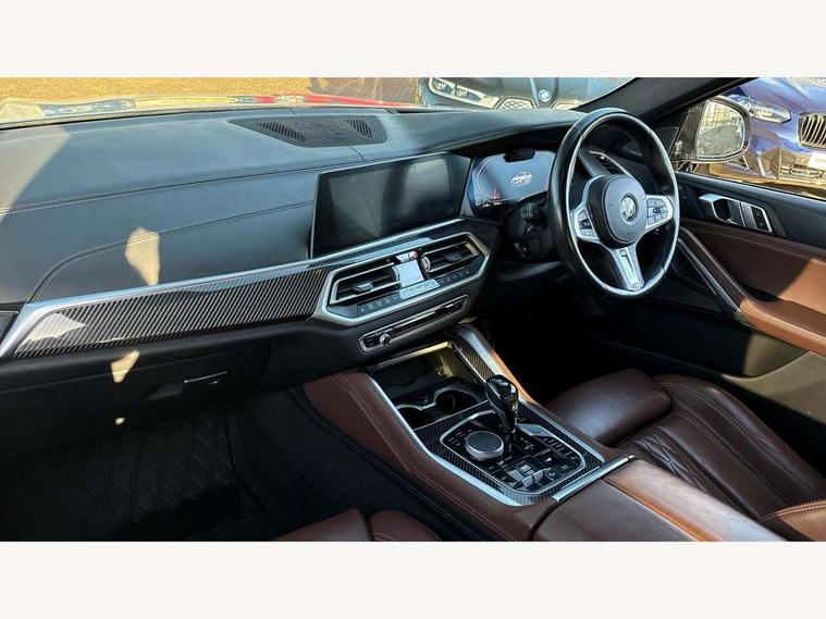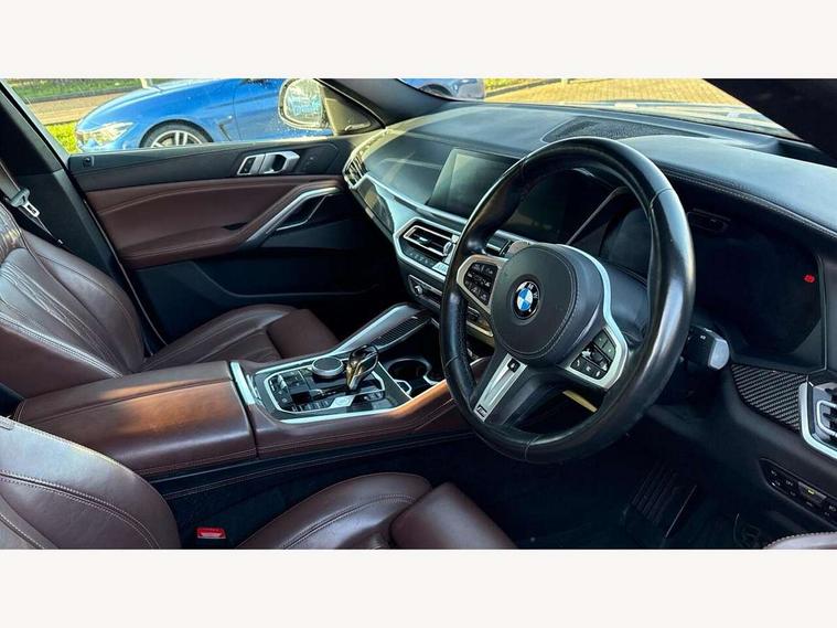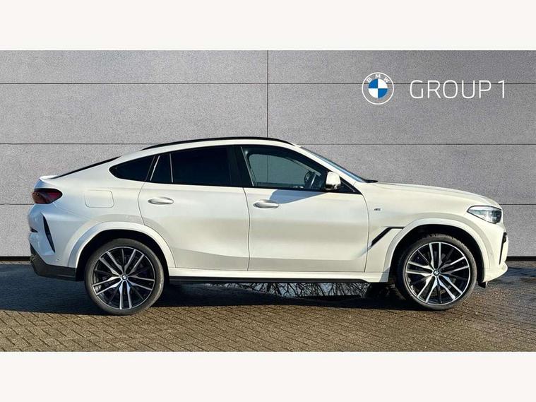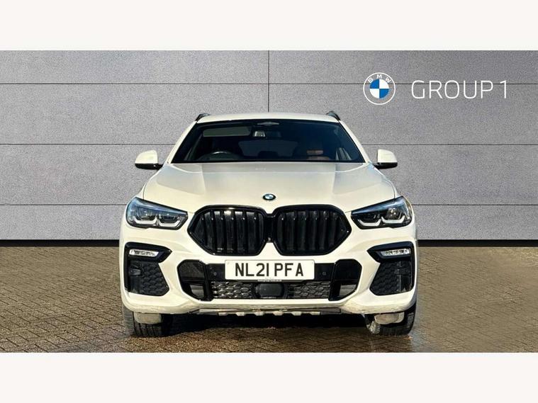 50GB hard disc drive (HDD) memory, Active guard plus, Attentiveness assist, Automatic tailgate two part with top hinged section open and manual bottom hinged section, BMW ConnectedDrive online services, BMW digital live cockpit professional - 12.3" digital instrument panel and 12.3" CID, with touch/voice command, BMW legal emergency call, BMW Teleservices, Brake force display, Brake pad wear indicator warning light, Cruise control with brake assist, Enhanced bluetooth hands free facility with Telephony wireless charging, Front/rear park distance control (PDC), iDrive touch controller with shortcut buttons, Lights on warning, Oil sensor for level and grade, On board computer inc. average speed, fuel consumption, liquid crystal Info display, journey computer, outside temperature display, personal profile, Service interval indicator, Speed limit info display, Speed limiting function, Wi-Fi hotspot, 48V Mild hybrid technology, Diesel particulate filter, Double wishbone front axle, Drive performance control with ECO PRO comfort + sport mode, Eight speed steptronic sport automatic transmission and gearshift paddles on the steering wheel, Safety battery terminal clamp, Variable vane geometry, DAB Tuner enables digital radio reception, Favourite buttons, Hi-Fi loudspeaker system, USB connection, USB type A 1.5A in cupholder, USB Type C 3A in centre armrest, Active Air Stream kidney grille with high-gloss chrome, Adaptive air flap control bar in high-gloss black, Automatically dimming rear view mirror, BMW individual exterior line aluminium satinated window frame and window guide rail in front door/pillar trim/door mirrors in high gloss black, BMW Individual high gloss shadow line, Body colour bumpers, Body colour door handles, Dynamic brake lights with LED technology, Exhaust tailpipes - single, left and right with Chrome finisher, Follow me home headlight function, Front and rear electric windows with open and close fingertip control, anti trap facility and comfort closing, Heated windscreen washer jets, High beam assistant, High gloss black outer and central air intakes on front bumper with pearlescent chrome finish, High gloss black Side elements, LED daytime running lights, LED fog lights, LED rear lights, M aerodynamic body styling, M designation on left and right front side panels, M Sport exhaust system, Rain sensor with automatic headlight activation and windscreen wiper control, Satin aluminium side window graphic, Third brake light in rear spoiler, Welcome light carpet, X6 on left tailgate, xDrive designation on right tailgate, 12V - Power sockets with 2x centre console and 1x luggage compartment, 40:20:40 split folding rear seats, Centre and rear interior light, Child seat ISOFIX attachment with rear outer seats includes top tether, Compartment in front of cupholder, Electrical steering column with adjustable height and length with activation and control on the steering column, Foldable rear centre armrest with 2 cupholders and storage compartment, Front and rear cupholders x 2, Front and rear door pockets, Front and rear door sill inlays with illuminated BMW M designation, Front and rear side armrest integrated into door trim, Front reading lights, Light inside glove compartment, Lockable glove compartment, Luggage compartment floor panel with integral storage tray, Luggage compartment lighting, M leather steering wheel, M specific key, M specific velour floor mats, Make-up mirror lights, Multifunction controls for leather steering wheel, Multifunctional hooks, Rear head restraints, Seat back with flap pocket, Storage tray and compartment with cover in centre console, Sunvisors with illuminated vanity mirrors, Toolkit located in luggage compartment, Ambient light interior pack - X6, Connected Package Professional - X6, Expanded exterior mirror pack with electric folding door mirror - X6, Non-smokers pack - X6, 3 rear seatbelts, Airbags - driver/front passenger, rear and side, first and second row seats head airbags, front passenger seat airbag deactivation + knee airbag, Anti-lock braking system (ABS), Automatic Stability Control (ASC), Brake drying, Brake energy regeneration, Brake fade compensation, Braking pre-tensioning, Cornering brake control (CBC), Crash sensor activating central locking release, hazard warning lights, fuel cut off, interior lighting + activation of safety battery terminal clamp, Deformation zones - front and rear with door reinforcements and bumpers up to 2.5 mph, DSC - Dynamic Stability Control, Dynamic brake control, Dynamic Traction Control - DTC, Electromechanical parking brake with automatic drive away release and auto hold function, Electronic brake force distribution, Front and rear brake discs with interior ventilation, Front and rear seatbelts with seatbelt stopper, seatbelt tensioner for front and outer rear seats and belt force limiter, Front head restraints with anti-whiplash, Hill start assistant, Integrated brake system, M Compound brake in high gloss blue, M Sport braking system, Mechanical child proof lock on rear doors, Passive protection for pedestrians, Seat occupancy detection for driver and passenger side, Side impact protection, Two tone horn, Tyre pressure monitoring system, Warning triangle and first aid kit, Closing system with central locking, Driver and front passenger door centre lock switch, Locking wheel bolts, Thatcham 1 alarm system with remote control and engine immobiliser, Start/stop toggle diamond shaped trim finisher in pearl chrome,