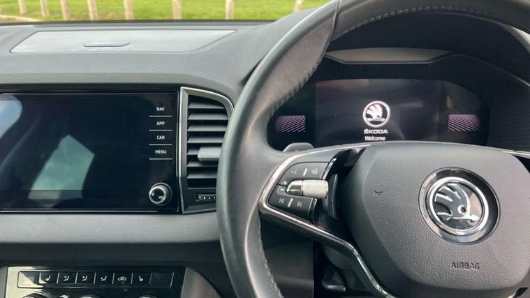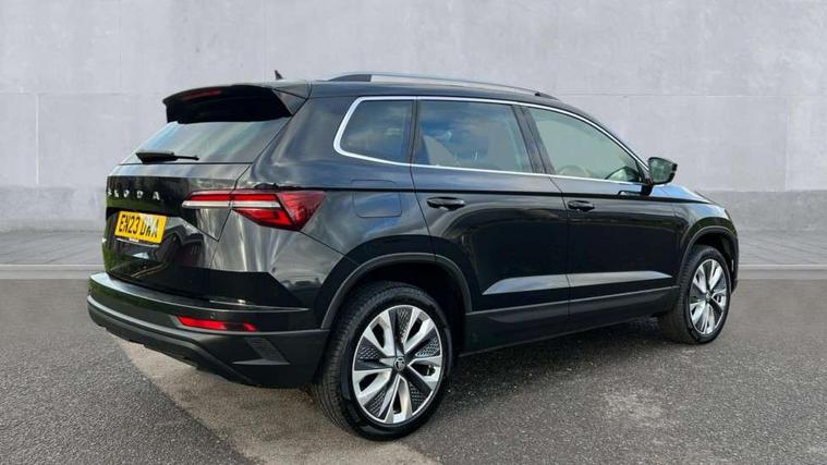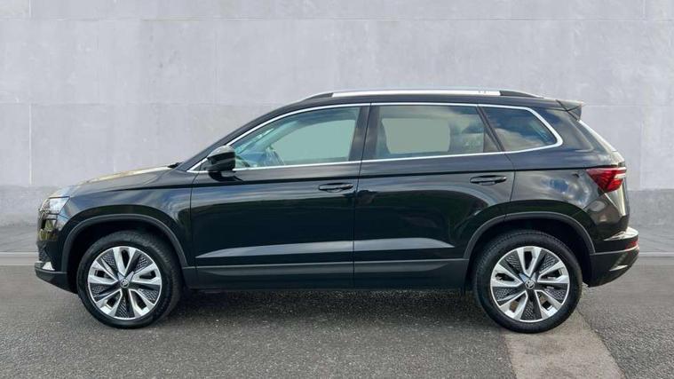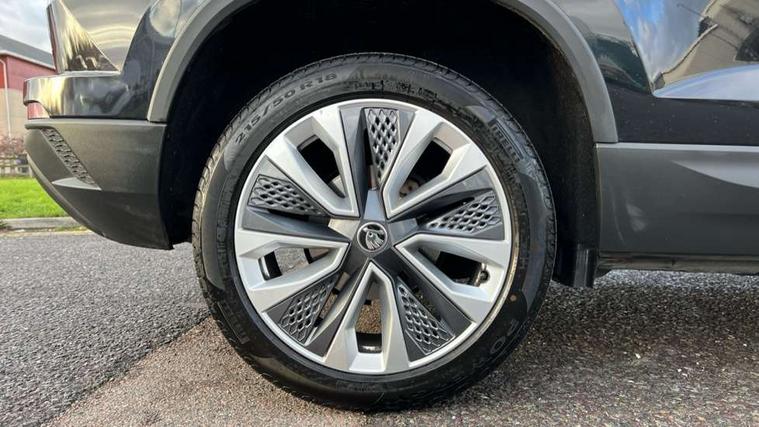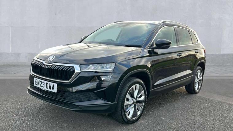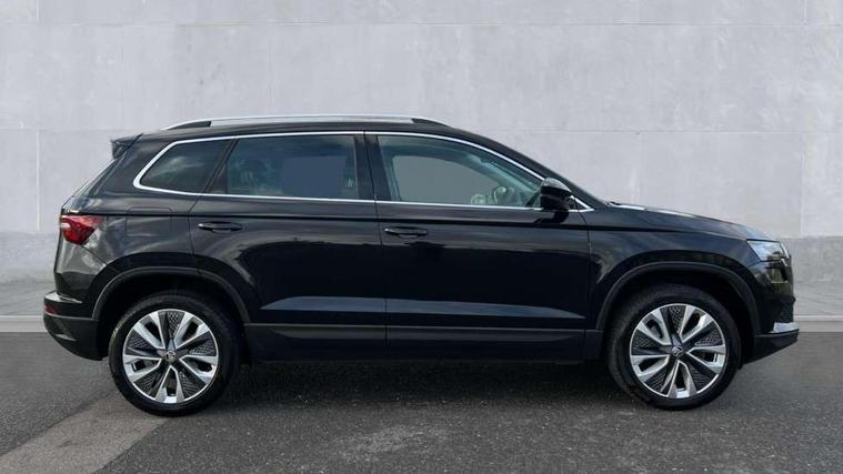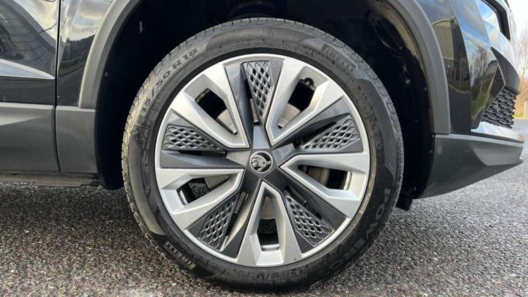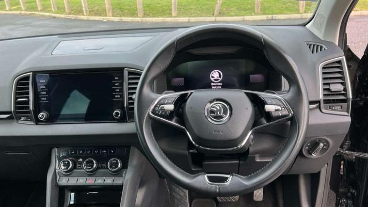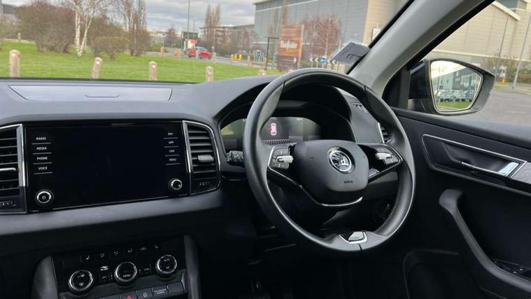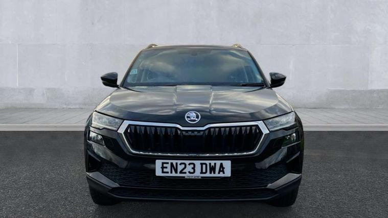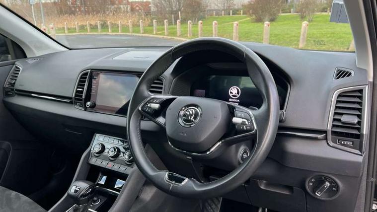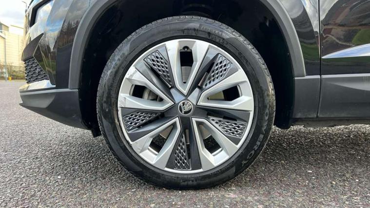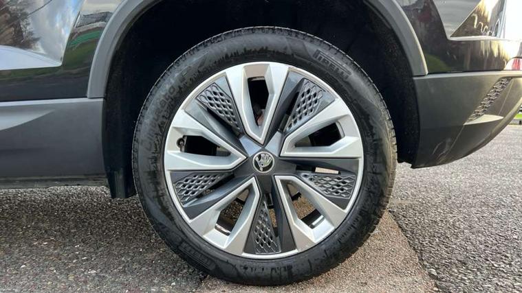 8" Digital display, Care connect, Driver fatigue sensor, Emergency services call system, Outside temperature gauge, Service interval indicator, SmartLink wireless for Apple and wired for Android, Start/stop system with regenerative braking, USB C Port x 2 in front centre console, 8 speakers, DAB radio with Bluetooth, USB connection, Acoustic glass, Aero front windscreen wipers with intermittent function, Auto dimming rear view mirror with light and rain sensors, Black electric window control buttons, Body colour door mirrors and handles, Dynamic headlight range control with cornering light function, Electric front and rear windows with child proof lock, Heated rear windscreen, LED daytime running lights, LED rear lights with high functionality welcome effect and dynamic indicators, Light assistant (coming/leaving home/tunnel light), Plastic scuff plates, Privacy glass, Rear side wing doors, Rear spoiler, Rear window wiper with washer system and intermittent control, Safety reflectors on front doors, 1.5 litre bottle holders in driver and front passenger door panels, 12V socket in boot, 12v socket in front centre armrest with storage compartment and rear air vents, 2 spoke leather heated multifunction steering wheel with DSG paddles, 2 x Tablet holder, 3 rear height adjustable headrests, 3 seat bench in 2nd row, 4 foldable roof handles with rear coat hooks, Black floor carpet, Chrome inner door handles, Decorative door sills with KAROQ badging, Double sided boot floor, Foldable hooks in the boot, Front head restraints, Height adjustable front three point seats belts with tensioners, Height/reach adjust steering wheel, Ice scraper, Illuminated glovebox, Illuminated luggage compartment, Isofix child seat preparation for front passenger seat, Isofix child seat preparation outer rear, Manual lumbar support for front seats, Pen holder, Pollen filter, Rear boot cover, Rear reading lights, Rubbish bin door, Safety vest holder, Single front passenger seat, Storage box in upper central dashboard closed, Sunvisors with illuminated vanity mirrors, Textile floor mats, Ticket holder, Tool kit, VarioFlex seats with standard rear seat release, Boot pack - Karoq, Chrome roof rails + chrome pack - Karoq, Parking pack - Karoq, Automatic door unlocking in case of crash, Automatic fuel cut off in case of crash, Child locks on rear doors, Driver airbag, Electronic parking brake with auto hold function, Emergency rear braking signal, ESC including ABS, MSR, ASR, EDS, HBA, DSR, RBS, MKB and traction control, Front side airbags, Hill hold control, Knee airbags, Passenger airbag with switch-off function, Pedestrian monitor, Seatbelt reminder signalisation and pretensioner for all seats, Three point seatbelts rear, Two tone horn, Tyre pressure display, Tyre pressure monitor, Alarm with interior monitoring, back up horn and tilt sensor with safe function, Electronic engine immobiliser, Keyless entry and start/stop, Remote central locking with 2 remote folding keys, Chrome framed air vents, 18" Procyon silver alloy wheels with anthracite aero inserts, Anti-theft wheel bolts protection, Storage on wheel cover,
