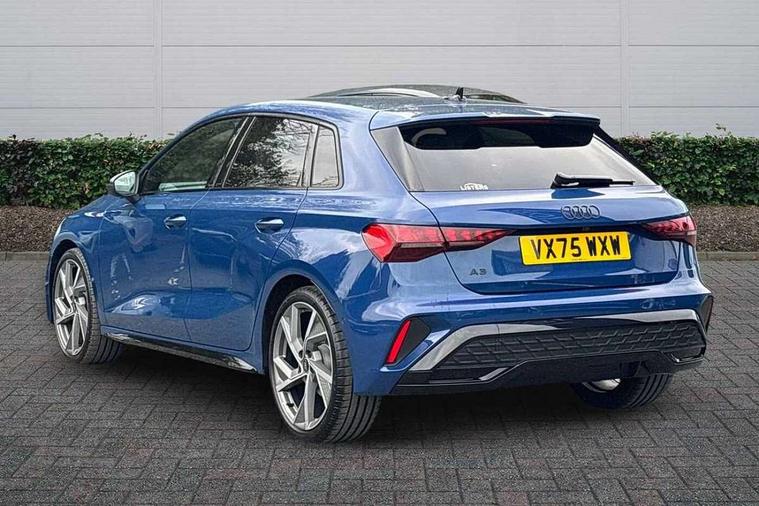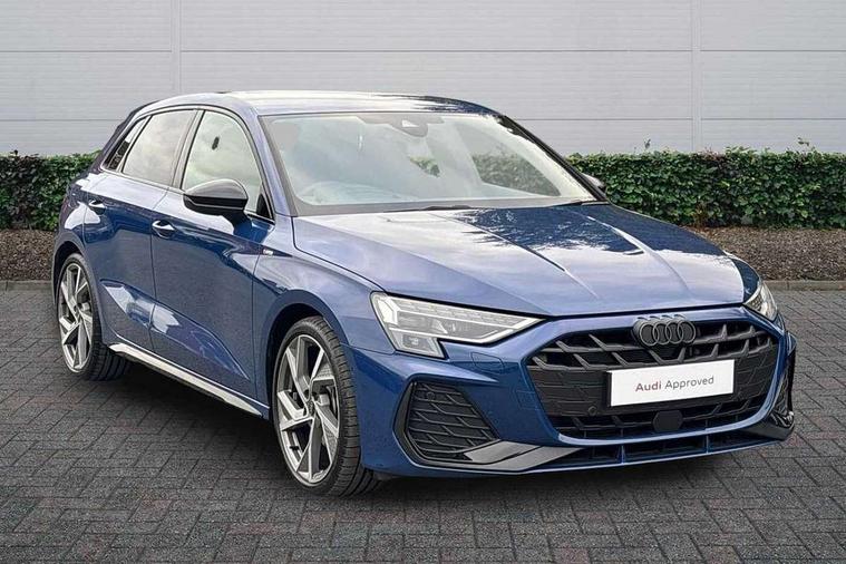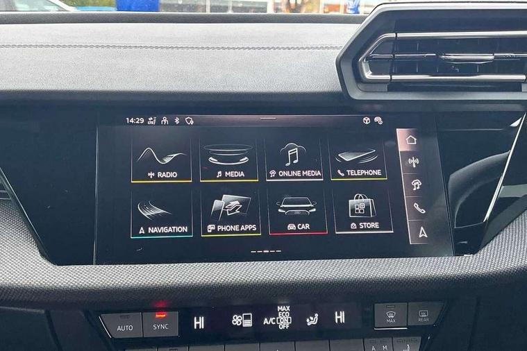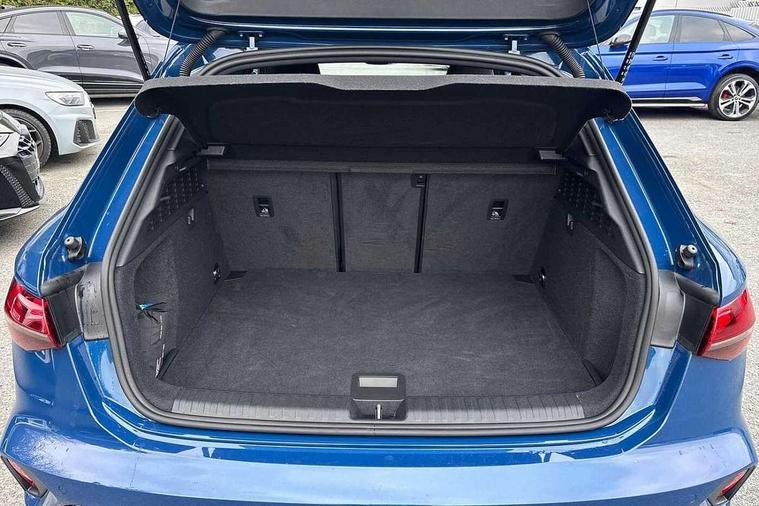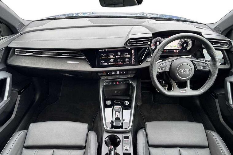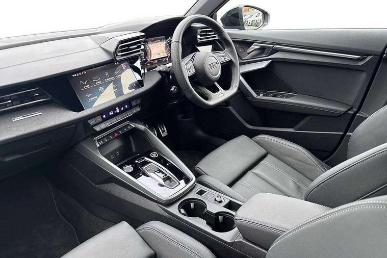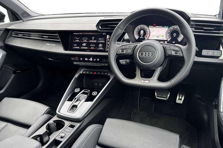 Adjustable speed limiter, Audi drive select, Audi smartphone interface with app store includes wireless Apple carplay, Android auto and Amazon alexa integration, Audi virtual cockpit plus - 12.3" full HD resolution dynamic digital instrument cluster, Automatic start/stop system with recuperation, Bluetooth interface, Camera based traffic sign recognition, Collision avoidance assistant, Cruise control, Distraction and Fatigue warning, e-Call (emergency call), Electromechanical power speed sensitive steering, Emergency assist, Lane departure warning system, MMI Navigation Plus with high resolution 10.1" colour touch screen display, Park Assist with parking system Plus, Service indicator, Tailgate, Trip computer, Voice control system with natural language interaction, Sports suspension, Audi Phonebox light with wireless charging, Audi sound system - 10 loudspeakers including centre loudspeaker and subwoofer, DAB Digital radio, USB ports with charging function in the rear, Acoustic glass windscreen, All weather light, Anthracite grey Audi rings (front and rear), Audi beam uses LEDs to project the Audi logo onto the ground as you exit your A3, Auto dimming frameless rear view mirror, Automatic dynamic range control, Black accents front and rear bumpers, Black accents in the area of the Audi single frame grille, Black accents window trims strips, Dipped beam, main beam, position light and turning light, Electrically adjustable/heated/folding/auto dimming door mirrors with integrated LED indications + kerb view function for passenger side, Exterior model badging, Front and rear side air inlets in grained matt black with dark liquid chrome frame, Front electric windows, Heat insulating glass windscreen, Illuminated door sills with aluminium inserts at the front with S logo, Intersection light, LED 3rd brake light, LED brake lights, LED daytime running x3, LED headlights with LED rear lights and dynamic rear indicators, LED rear number plate lights, LED reverse light, LED tail lights, Light and rain sensors, Manoeuvring light, Motorway light, Privacy glass - dark tinted rear window, rear door and side windows, Rear diffuser and grill in grained matt black with inlay in dark liquid chrome, Rear electric windows, Rear side wing doors, Rear wiper, S roof spoiler, Static cornering light, 12V socket and storage compartment in front centre console, 3 seat bench in 2nd row, 3 spoke flat bottomed leather multifunction sport steering wheel with gear shift paddles, 3-zone deluxe automatic air conditioning, 4 way electrically adjustable lumbar support for driver and front passenger, 40/20/40 split folding rear seat bench, Black cloth headlining, Black front and rear floor mats, Front and rear centre armrest in artificial leather with contrasting stitching on armrests and instrument panel, Front and rear headrests, Heated front seats, Height and reach adjustable steering wheel, Manual boot compartment lid, Manually adjustable front seats, Rear centre armrest with cupholder, S badging on the steering wheel, Seat side bolsters, Single front passenger seat, Stainless steel pedals and front footrest in black, Twin leather upholstery with front sports seats S embossed logo, Aluminium interior elements pack - A3, 3x3 point rear seat belts, Driver and front passenger airbag with passenger airbag deactivation, Electronic Stabilisation Control (ESC) including ABS, ASR and EDL, First aid kit with warning triangle and 2 safety vests, Front side airbags with head airbags and interaction airbag, Hill hold assist, Pre-sense front with pedestrian and cyclist detection, Seatbelt monitoring, Tyre pressure loss indicator, Anti theft alarm, Anti-theft wheel bolts, Electronically operated child locks, Immobiliser, Remote central locking with safelock, Black dashboard,