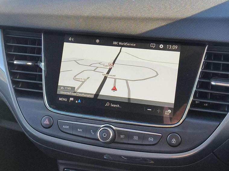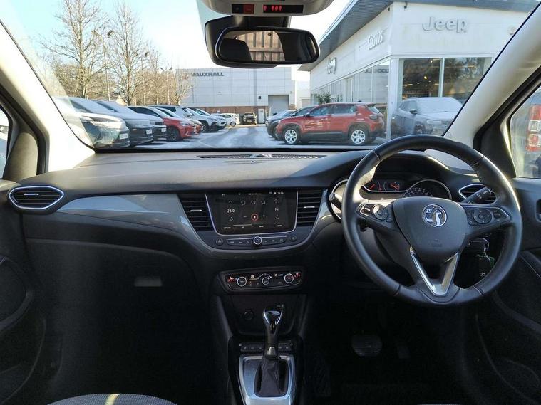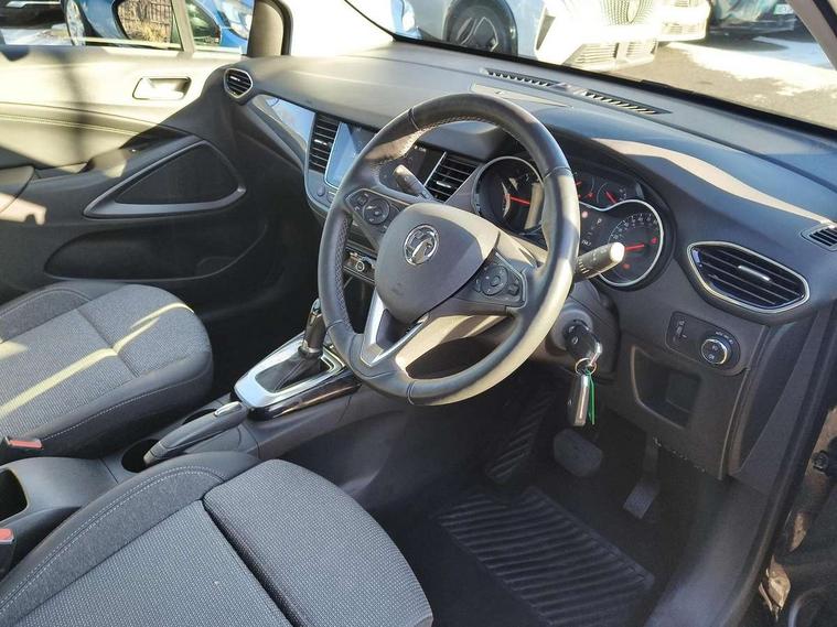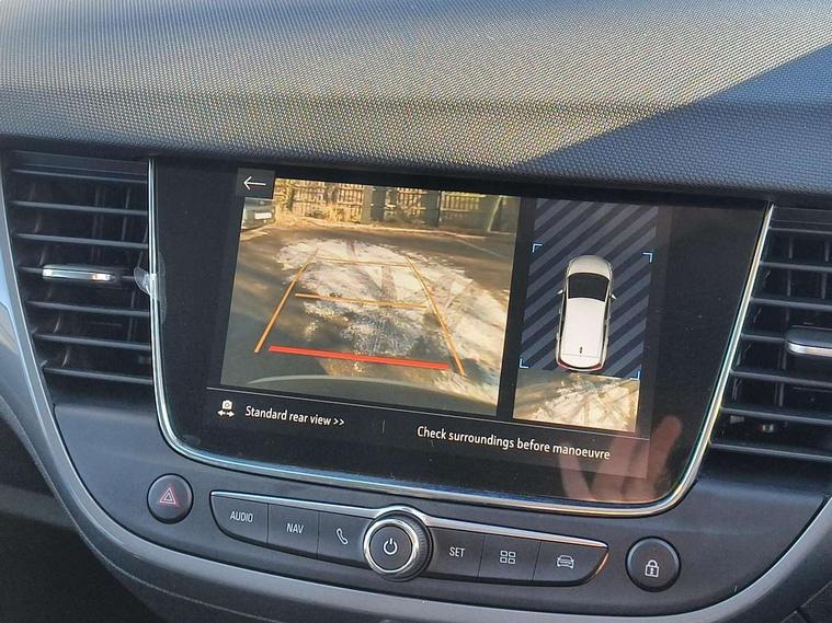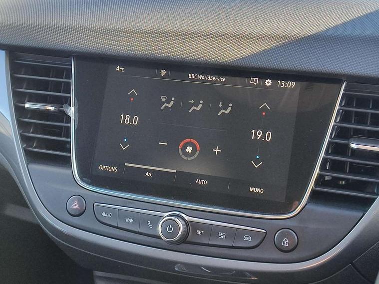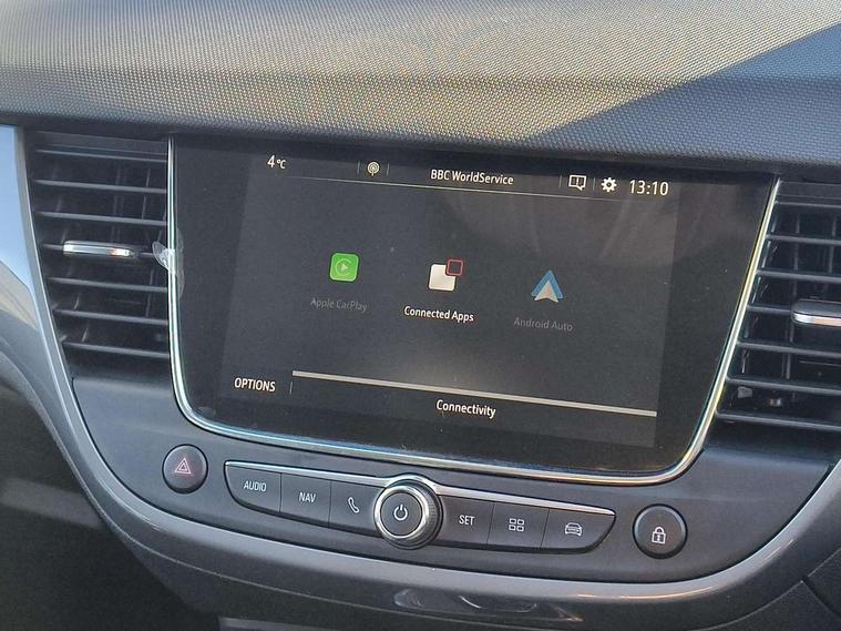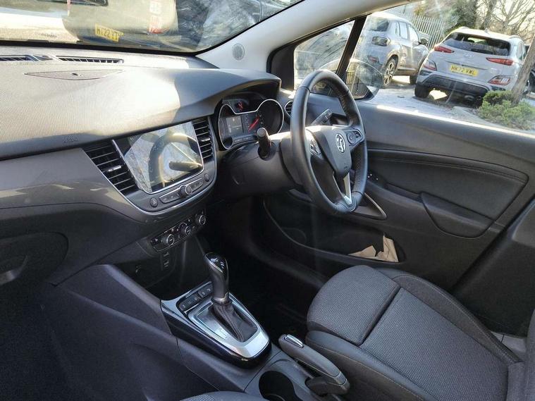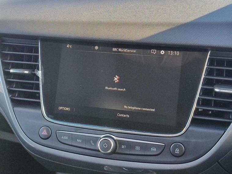 3.5" monochrome instrument colour display, Audible lights on warning, Bluetooth connectivity, Cruise control + speed limiter, Digital clock with automatic RDS time adjustment, Driver drowsiness alert system, E-call, Forward collision warning, Instrumentation - Speedometer, rev counter, low fuel gauge warning light + water temperature gauge warning light, shift up/down indicate light, Lane departure warning system, Multi function trip computer, Multimedia sat nav pro with 8" colour touchscreen, AM/FM, Bluetooth streaming, Bluetooth mobile phone portal, apple CarPlay/Android Auto + 6 speakers, Outside temperature display with ice warning, Refridgerant low indicator, Service interval indicator, Speed sensitive power steering, Speed sign recognition, Vauxhall connect, Front wheel drive, 2 x USB connections, DAB Digital radio, Steering wheel mounted audio/phone/cruise controls, 2 speed wipers/wash wipe/intermittent wipe, Alloy effect front and rear skid plates, Automatic anti dazzle rear view mirror, Automatic headlamp levelling system, Automatic high beam control with cornering light, Automatic lighting control, Black door mirror housings, Black radiator grille with chrome bar, Black roof, Body colour door handles, Body colour front and rear bumpers, Chrome effect upper window moulding, Dark tinted rear side windows + tailgate window, Electrically adjustable and heated door mirrors, Front power windows with express up/down and anti-pinch function, Hazard warning lights, Headlamps for left side traffic, Heated rear window, Integrated tailgate spoiler, Intermittent rear wash/wipe, LED daytime running lights, LED front fog lights, LED Headlights, LED side repeat indicators, LED tail lights, Rain sensitive windscreen wipers, Rear fog lights, Rear power windows with express up/down and anti-pinch function, Rear side wing doors, Rear wing door, Reversing light, Side window demist vents, Solar heat absorbing windscreen and windows, Third brake light, Welcome lighting, Windscreen demist vents, 12v power outlet - front, 2 way adjustable front passenger seat, 2 way front passive headrests, 3 rear seats, 3 spoke flat bottomed leather covered steering wheel with bezel decoration, 4 way electrically adjustable lumbar support for drivers seat, 60/40 split folding rear seat backrest, Adjustable rear seat backrest, Air recirculation facility, Ambient lighting, Anti submarining ramps in front seats, Cabin particulate filter - removes dust, airborne particles and pollen, Centre console, Driver and front passenger illuminated vanity mirrors with flip up covers, Driver's seat armrest, Drivers ergonomic active seat with 8 way manual adjustable driver seat , height, reach and backrest, Dual zone electronic climate control, Fade up/fade down on interior lighting, Four adjustable facia vents, Front door pockets with bottle holders, Front map reading lights, Fully carpeted luggage area, Glovebox with lid, Height adjustable front/rear head restraints, Illuminated load area, Interior courtesy light operated by all doors, Isofix system on outer rear seats, Jet black premium leather side bolsters, Luggage compartment cover, Multi-speed fan with Illuminated control, Open storage compartment in centre console, Passenger assist handles, Reach + rake adjustable steering column, Rear centre headrest, Rear door pockets with bottle holders, Rear floor ventilation ducts, Rear reading lights, Satin chrome effect bezel on steering wheel, Seat cushion extension, Single front passenger seat, Sparkle cloth/vinyl upholstery, Storage pockets on front seat backs, Two drinks holders in centre console, Rear view camera plus pack - Crossland, Winter pack - Crossland, 3x3 point rear seatbelts, 6 airbags - Driver and co-driver front, front side, head curtain roof airbags, front and rear row coverage airbags, ABS, Automatic emergency braking with pedestrian detection, Child locks on rear doors, CSC - Cornering stability control, Deactivate switch for side impact airbags, Deformation zones front and rear, Dual seatbelt pretensioners on front seats, EBD - Electronic brakeforce distribution, Energy absorbing steering column, Engine drag torque control, ESP + traction control, Front and rear seatbelt unfastened audible warning and warning light, Front side impact airbag, Hill start assist, Hydraulic Brake Assist (HBA), Hydraulic brake boost, Inertia reel lap and diagonal seatbelts for all seats, Passenger airbag deactivate switch, Pedestrian detection, Rear seat belt pretensioners, Reinforced passenger safety cell, Seatbelt load limiter, Side impact protection beams, Smart seatbelt reminder for front and rear seats, Tyre pressure monitoring system, 2 remote folding keys, Electronically protected audio equipment, Engine immobiliser, Locking wheel nuts, Remote central deadlocking, Remote control central locking activation switch on driver door, Remote control central locking operates on doors, tailgate and fuel filler flap, Remote security alarm system, Visible vehicle identification number, Black facia with silver trim insert, Black trim inserts on front doors, Cluster black with chrome rings, 17" five twin spoke diamond bi colour alloy wheels,