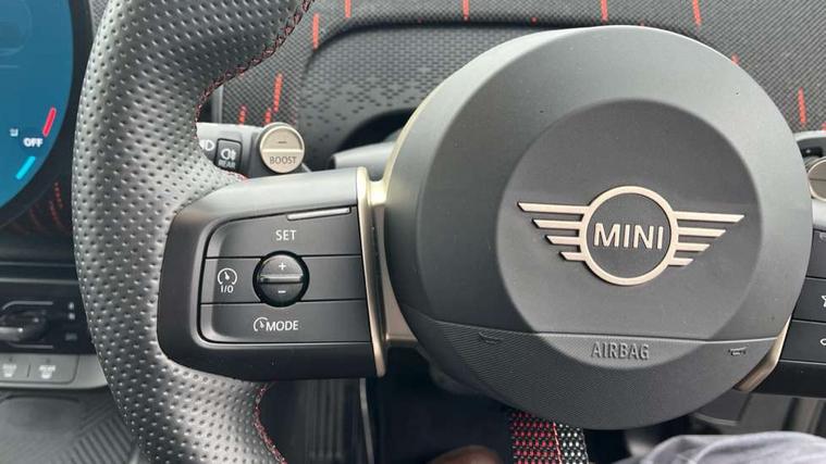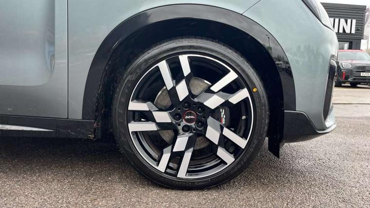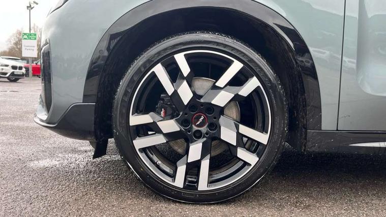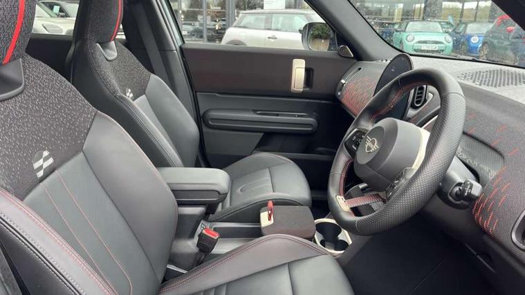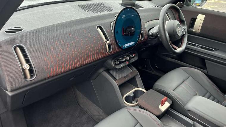 Bluetooth connection, Circular OLED Screen, Compatible mobile phone bluetooth with audio streaming, Cruise Control (DCC), Digital dashboard display, Driving Assistant Plus Preparation, E-call, Electro-mechanical speed dependant steering assistance, MINI Experience Modes, MINI Head up display, Mini navigation system, MINI TeleServices, Parking assistant in camera and ultrasound based assistance system, rear view camera, parking aid and distance control, Double clutch sports transmission, Larger capacity fuel tank, 6 speakers, DAB Digital radio, Auto tailgate, Electric adjustable heated door mirrors, Front and rear apron, Front and rear electric windows, Heated rear window, High beam assistant, High gloss hexagonal patterned grille surround, Interior rear-view mirror with automatic anti-dazzle function, LED daytime running lights, LED headlights with extended contents including Adaptable light signatures, LED rear lights, LED third brake light, Rain sensor with auto headlights, Rear roof spoiler with airblades, Rear side wing doors, Rear window wiper, Roof rails, 3 Seat sliding rear bench in 2nd row, 60/40 split rear bench seat, Anthracite headliner, Auto air conditioning, Driver and front passenger seat heating, Floor mats, Front armrest, Front headrests, Heated steering wheel, Height and length steering column adjustment, JCW Front sports seats, Lidded storage box in Black/Red knit, Luggage compartment separating net, Perforated Vescin steering wheel, Rear headrests, Seat adjustment for rear seats, Single front passenger seat, Sunvisors with vanity mirrors, Vescin/Cloth upholstery, Wireless charging tray, Interior and exterior mirror package - Mini Countryman, 3x3 point rear seat belts, 6 Airbags - front, side, head and seat belt tensioners, ABS, Brake calipers in Black with JCW badge, DSC - Dynamic Stability Control, Electronic handbrake, Electronic Stability Programme (ESP), Front ISOFIX (iSize), Hill hold assist, Hill start assist, JCW Sport Brakes, Manual rear child locks, Traction control, Tyre pressure monitoring system, Warning triangle, Alarm system with tilt sensor, monitoring doors, bonnet interior and tailgate, Auto drive away locking, Comfort access system, Deadlocking function, Electronic vehicle immobiliser, Locking wheel bolts, Remote control locking, Start/stop toggle with keyless go, JCW Black/Red dashboard knit, MINI Mobility Kit,