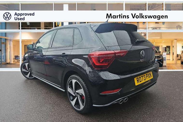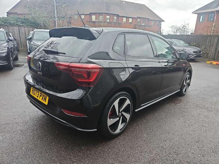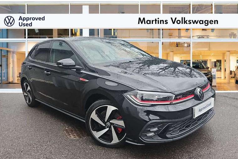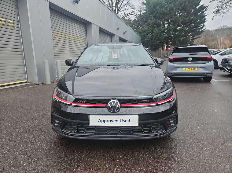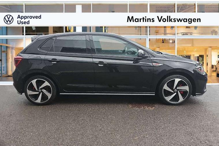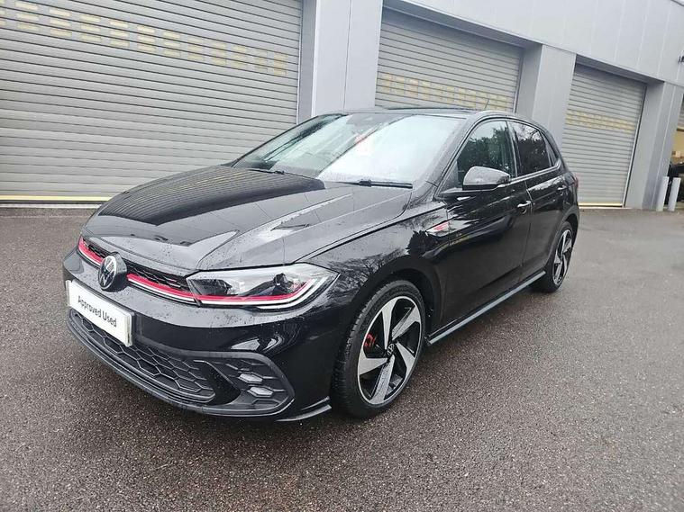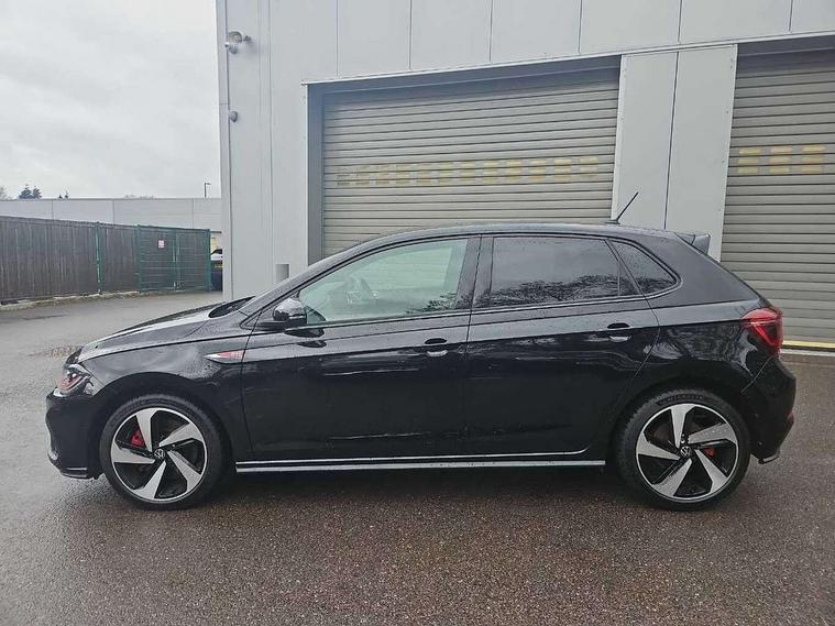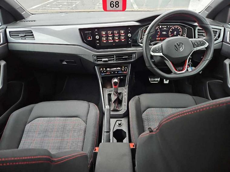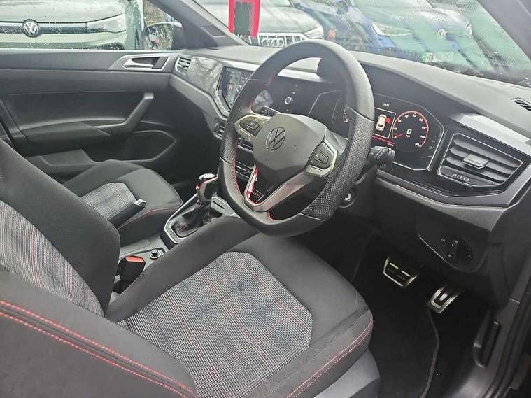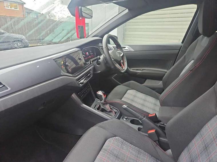 Adaptive cruise control with follow-to-stop and speed limiter, Bluetooth mobile phone interface, Digital Cockpit Pro with 10.25" Display, Driver alert system, Dynamic road sign display, Eco mode, Emergency call service, Power assisted speed sensitive steering, Preparation for We connect and We connect plus, Speedo and rev counter, electronic odometer, trip, service interval display and fuel gauge, Travel Assist - Lane keeping system and traffic jam assist, Travel assist including emergency assist, Trip computer, Warning signal and warning light for front and rear seatbelts not fastened, Washer fluid level indicator, Wireless app connect, Adaptive chassis control, Front wheel drive, Heavy duty rear axle, Rear shock absorpion sports version, Sports select suspension lowered by 15mm, Start-stop system with battery regeneration (recuperation - energy recovery during braking), DAB Digital radio, Diversity antenna for FM reception, Front and rear 6 speakers, Body colour bumpers, Body colour door handles, Electric front windows, Front scuff plates in aluminium with GTI logo, Heat insulating darkened glass in side and rear windows, Heat insulating glass windscreen, Power folding adjustable/heated exterior mirrors and front passenger exterior mirror lowering function, Rain sensor, Rear electric windows, Rear fog light, Rear side wing doors, Rear windscreen washer and wiper with interval delay, Sport bumpers with air intakes with honeycomb structure, Third brake light, Twin chrome exhaust tailpipes, 12V power socket in centre console, 2 USB-C ports in the front, 2 USB-C charging sockets on the center console in the rear, 3 rear head restraints, 60/40 split folding rear seat and rear seat bench not split, Air care climatronic air conditoning system with active combination filter and 2-zone temperature control, Black roof lining, Chrome plated radiator grille inserts, air vent surrounds and light switch surrounds, Door and side trim panel, Driver and front passenger seat height adjustment, Driver/passenger sunvisors with illuminated vanity mirrors, Front + rear carpet mats in recycled material, Front centre armrest, Front footwell illumination, Front seat backrest storage pockets, GTI sports gearshift knob in aluminium leather, Handbrake lever handle in leather, Headliner in recycled material, Isofix child seat preparation easy-fit (for two outer rear seats, and front passenger seat) compatible with I-size, LED interior light with switch off delay and dimmer, 2 reading lights front and rear, Luggage compartment cover, Luggage compartment floor, Luggage compartment lighting, Single front passenger seat, Stainless steel pedals, Standard pedal cluster, Three spoke leather wrapped multifunction sports steering wheel with shifting paddles, IQ LED matrix headlights pack - Polo, Light and sight pack - Polo GTI, 3 point height adj front seatbelts + pretensioners, 3x3 point rear seatbelts, ABS, Driver and front passenger airbag with front passenger airbag deactivation, Drivers and front passengers safety optimised head restraints, ESC (Electronic stability control) + EDL (Electronic Differntial lock) and ASR (Traction control), Extended and predictive pedestrian/ cyclist protection, Front and rear disc brakes with red brake calipers, Front curtain and side airbags with center airbag, Hill hold control, Manual child lock in rear doors, Two tone horn, Tyre pressure loss indicator, Alarm with interior protection, Anti-theft alarm system with interior monitoring, backup horn, and towing protection, Anti-theft wheel bolts, Electronic engine immobiliser, Chrome applications on rotary light, mirror adjustment, window regulator switches, outlet with frame in black, Low rolling resistance tyres,