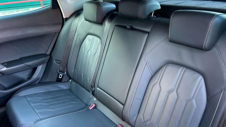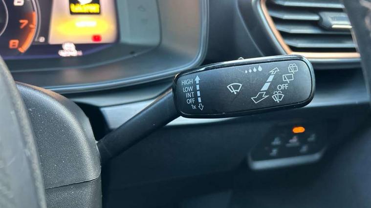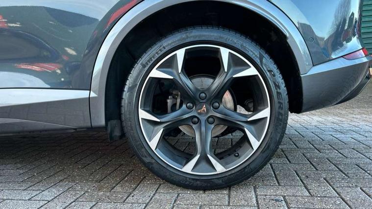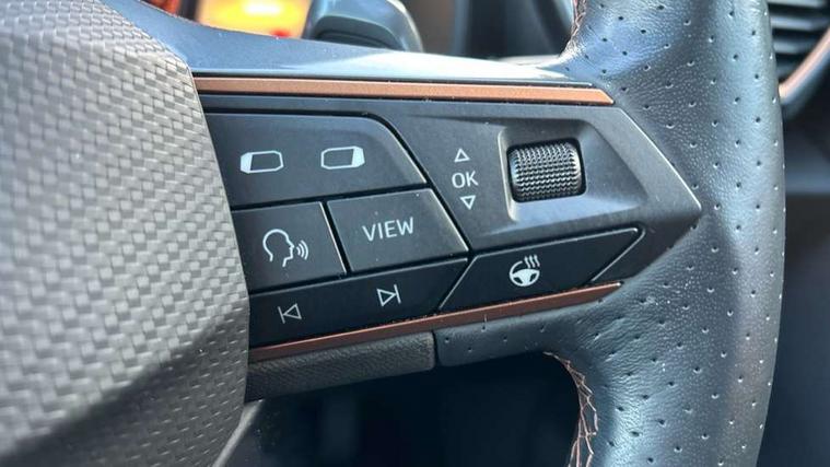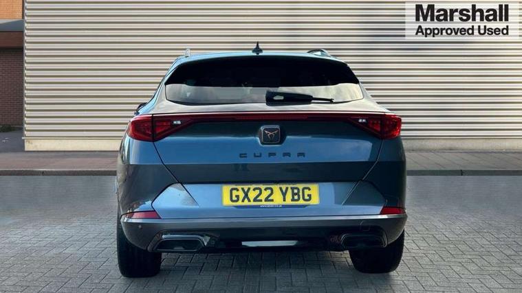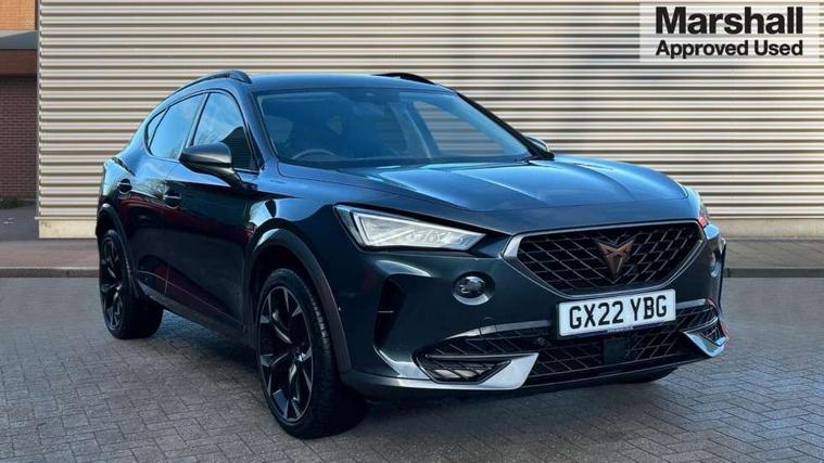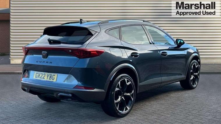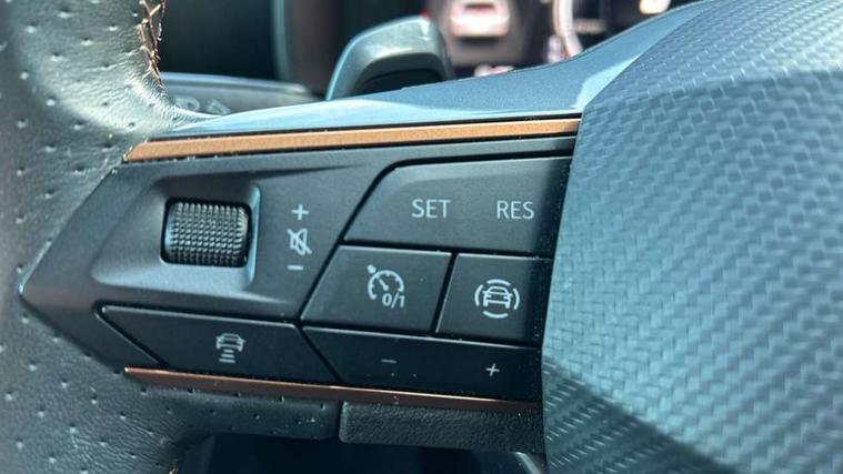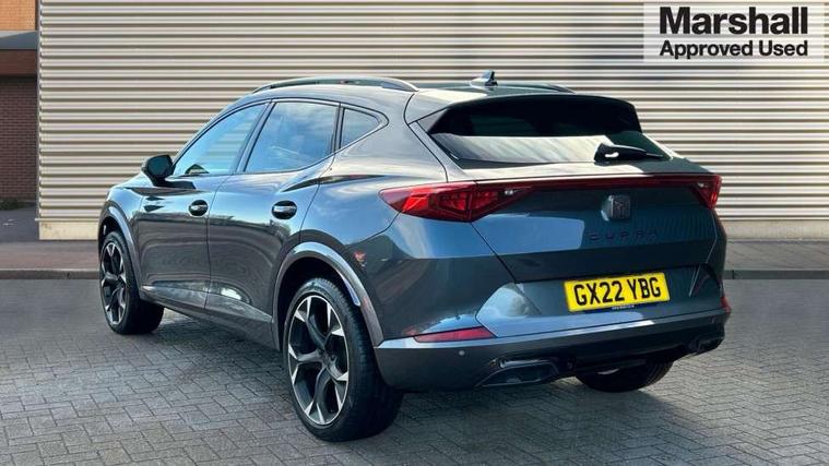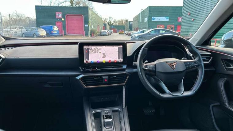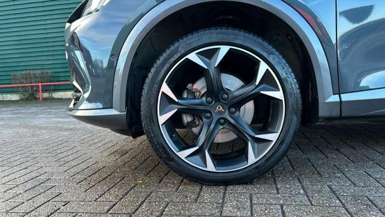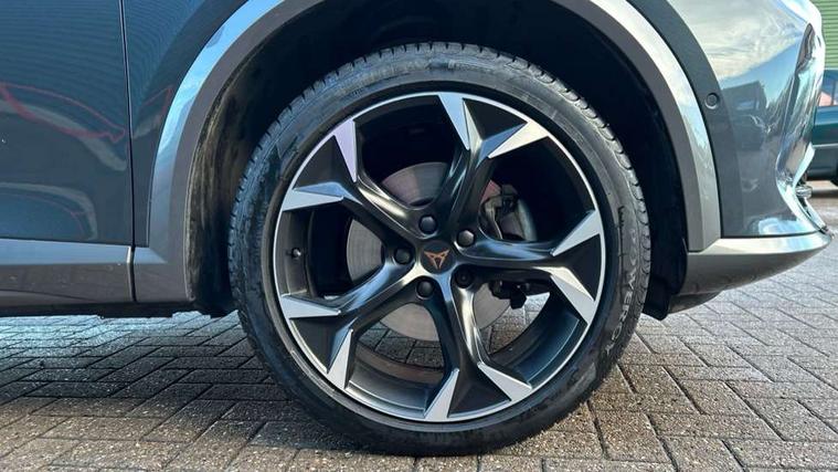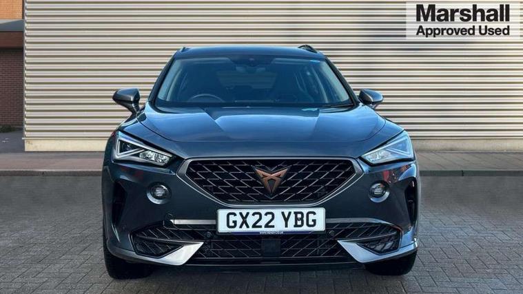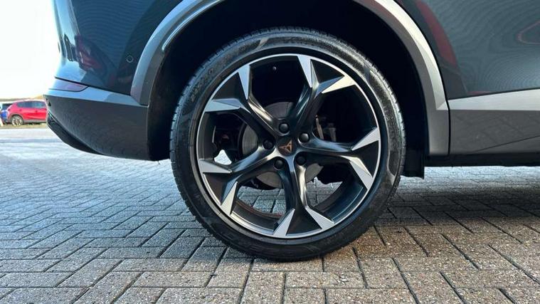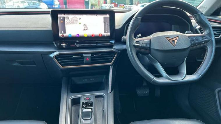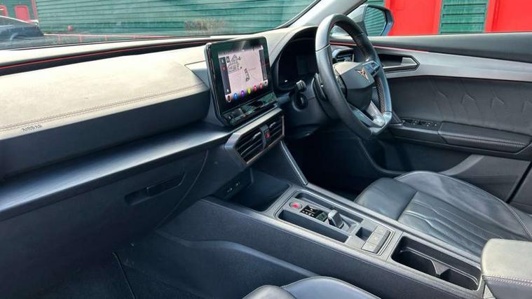 Digital cockpit and configurable dashboard, Driver alert system, Driving profile selection, E-call, Forward collision warning with automatic braking, Lane assist, Park assist (inc front/rear parking sensors), PAS, Predictive adaptive cruise control with speed limiter, Rear view camera, RPM, trip computer, outside temp gauge, instrument light brightness, low fuel warning light, lights on reminder, gearshift indicator, Service interval indicator, Start/stop system with regenerative braking, Wireless apple carplay, Wireless phone charger, Electronic locking differential and dynamic traction support, Standard suspension, 2 front and 2 rear USB type C sockets, Auxiliary input socket, DAB radio, Auto dimming rear view mirror, Body colour door handles, Body coloured bumpers, Dark grey wing mirror, Daytime running light with automatic headlight control and coming home feature, Dynamic headlight range control, Electric front/rear windows, Electrically adjustable heated and folding door mirrors with memory function, Front fog lamps with cornering function, Gloss black roof rails and window surrounds, LED Headlights, LED Taillights with dynamic indicator, Rain sensing wipers, Rear diffuser with black simulated exhaust pipes, Rear side wing doors, Rear wash/wipe, Third brake light, Tinted rear windows, Welcome lights, 12v power supply in centre console, 12V socket, 12v socket in loadspace, 2 front and 2 rear reading lights, 230V socket, 3 seat bench in 2nd row, 60/40 split rear bench seat with armrest and mechanical seat release, Dust/pollen filter, Front and rear head restraints, Front centre armrest, Height/reach adjust steering wheel, Illuminated interior front door sills, Illuminated sunvisor with mirror, Isofix, Leather multi function heated steering wheel with gear shift paddles, Luggage tie-down hooks, Single front passenger seat, Three zone climate control with control panel in rear, Variable luggage/load compartment floor, Wraparound lighting, Genuine Nappa leather Pack - Cupra, Navigation system pack with 10" navigation system - Formentor, 3 point seatbelts on all rear seats, ABS, Brake control system - ESC and brake booster, Child proof door locks, Driver and front passenger airbags with front passenger airbag de-activation, Electronic parking brake, Front and rear disc brakes, Front side curtain airbags, Hill hold control, Seat belt reminder for front and rear seats, Tyre pressure monitoring system, Anti theft alarm system, Keyless entry and start system (KESSY), Locking wheel bolts, Copper and aluminium interior detailing, 19" 'Exclusive' machined sport matte black and silver alloy wheels,