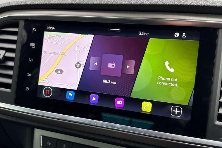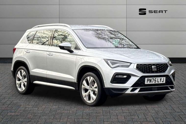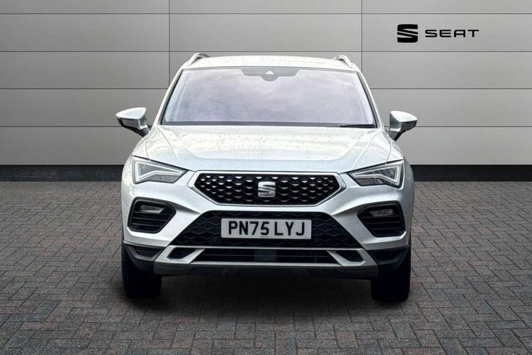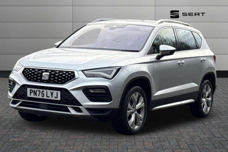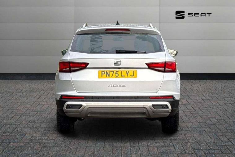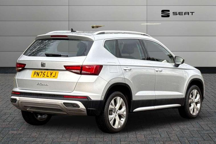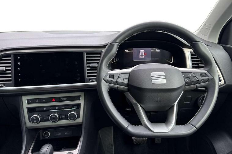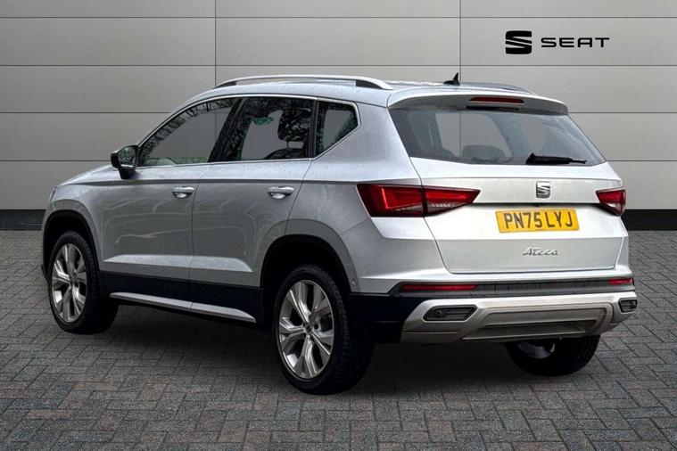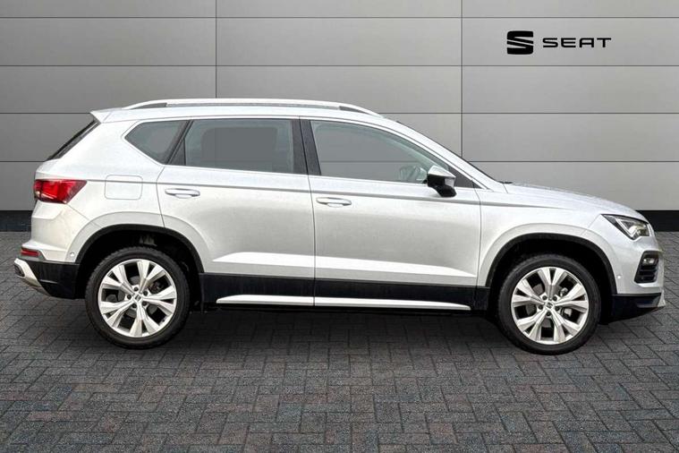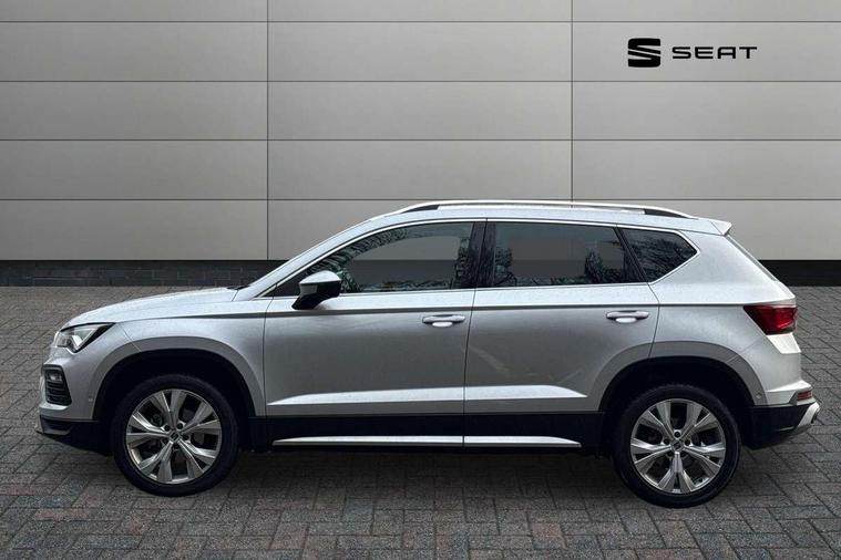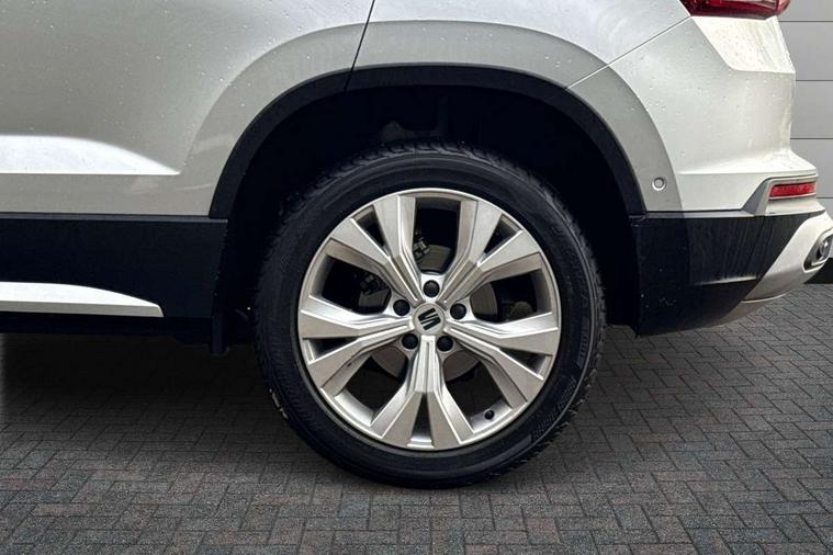 8" Digital cockpit, Colour multi-function on board computer display, E-call, Electric tailgate, Outside temperature gauge, Progressive power assisted steering, Rear view camera, SEAT drive profile with driving experience button - Normal, Sport, Eco and Individual mode, gearshift, steering and throttle response, Self parking functionality (includes front and rear parking sensors), Start/stop system, Trip computer, wired and wireless full link smartphone integration, Wireless phone charger, Steering wheel mounted audio/phone controls, Black wheel arch surrounds, Body colour bumpers, Chrome front grille frame, Chrome roof rails, Chrome side window trim, Dark tinted rear windows, Daytime running lights, Door mirrors with welcome light silhouette, Dynamic headlight range control with self adjusting whilst driving, Electric adjustable/heated/folding door mirrors, Front and rear electric windows, Front grille hot stamping, Full LED headlamps with lens and LED front fog lamps with cornering function, Heat reflecting windscreen, Illuminated aluminium front door sill, LED 3rd brake light, LED rear tail lights with dynamic indicators, Rear exhaust tailpipe, Rear fog lights, Rear side wing doors, Rear wash/wipe, Reflex silver side mouldings, Variable front intermittent wipers, 12V socket in front, 3 seat bench in 2nd row, 60/40 split folding rear seat, Dinamica upholstery with front comfort seats, Drawer under right front seat, Dual zone climate control, Front and rear head restraints, Front centre armrest, Front seat back storage pockets, Height adjustable driver and passenger seat with lumbar adjustment, ISOFIX points in outer rear seats with top tether anchorage points, Leather sports steering wheel and gear knob, Rear armrest and easy back seat release mechanism from boot, Single front passenger seat, Steering wheel mounted gearshift paddles, Convenience pack - Ateca, Interior lighting pack - Ateca, Navigation system pack with DAB - Ateca, Safety and driving pack (M) - Ateca, Safety and driving pack with attention and drowsiness assist - Ateca, 3x3 point rear seatbelts, ABS, Traction control system (TCS), Electronic stability control (ESC) and Electronic differential lock system (XDS), Airbags - Driver and front passenger airbag with deactivation, front side, two curtain and driver's knee airbags, Electric parking brake with auto hold function, Front and rear seatbelt reminder, Hill hold control, Manual rear child locks, Single tone horn, Tiredness recognition system, Tyre pressure monitoring system, Alarm, Keyless entry, Locking wheel bolts, Remote central locking, Chrome interior detailing, 18" Brillaint silver alloy wheels,