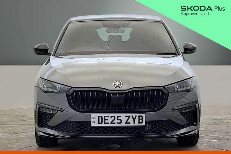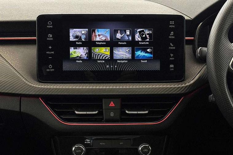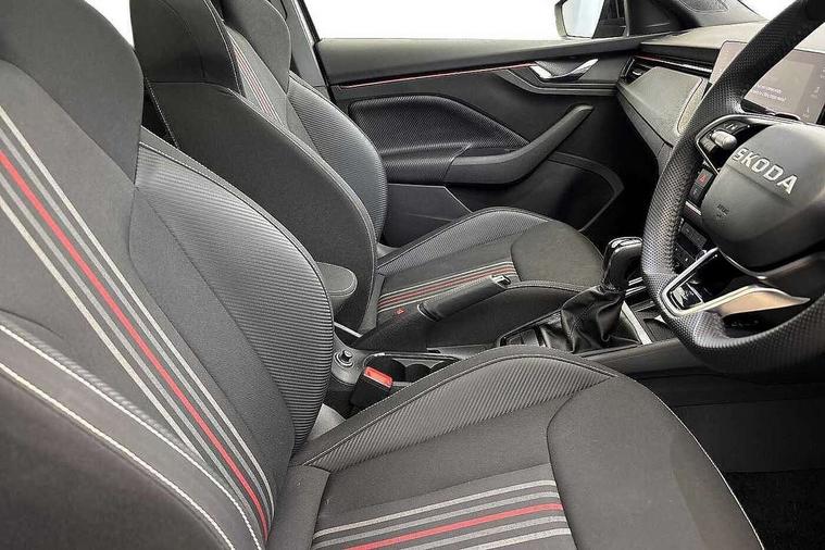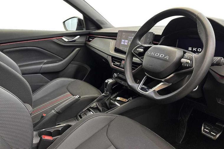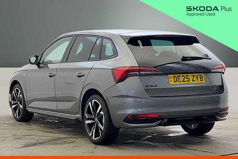 Advanced driver attention and drowsiness monitor, Bluetooth, e-Call (emergency call), Front assist system, PAS, Rear parking sensors, Rear view camera, Speed limiter, Tailgate, Traffic sign recognition, Virtual Cockpit - 10.25" digital display, Voice control system, Wireless smartlink, 4 USB C ports, 8 Speakers, 9.2" Skoda navigation display, DAB radio, Auto dimming rear view mirror, Automatic headlamp activation with Coming home and Leaving home feature, Automatic high/low beam, Automatic intermittent wipers, Black door mirrors, Black lettering on boot lid, Black radiator grille, Black rear diffuser, Black roof spoiler, Body colour bumpers, Body colour door handles, Chrome moulding around grille, Extended tailgate glass, Front and rear electric windows, Heated rear window, LED 3rd brake light, LED brake lights, LED daytime running lights, LED high beam, LED low beam, Light sensors, Monte carlo plaque, Panoramic glass roof, Privacy glass, Rear LED fog light, Rear side wing doors, Rear wiper, Tinted windows, Unique dark chrome design logo on alloy wheels, 12V socket in luggage compartment, 3 seat bench in 2nd row, Aluminium pedals, Ambient lighting in white/red, Black / White armrest stitching, Black ceiling, Black roof headlining, Cargo elements, Chrome inner door handles, Door inserts in art.leather carbon, Driver and passenger sun visors with vanity mirror, Dual zone climate control, Front and rear roof lights, Front centre armrest, Front head restraints, Height adjustable driver seat, Height adjustable passenger seat, Ice scraper, Illuminated glove compartment, Inner circulation control with pollen filter, ISOFIX for front passenger seat, Isofix preparation for back seats, Leather gearknob and handbrake lever, Luggage net under rear parcel shelf, Manual lumbar support for front seats, Monte Carlo cloth upholstery, Net package and top tether hooks in boot space, Pocket on the back of both front seats, incl. mobile phone pockets, Rear centre armrest, Red hotstamping, Single front passenger seat, Skoda lettering on steering wheel, Sport seats, Textile floor mats, Third rear headrest, Ticket holder, Top tether for front passenger seat, Umbrella in driver's door, Light and view plus pack - Scala, 3x3 point rear seatbelts, ABS, Child locks, Curtain airbags and front side airbags, Disc brakes, Driver and front passenger airbags, ESP, Hill hold control, Manual leather parking brake, One tone horn, Passenger airbag switch off function, Seatbelt reminder for driver and front passenger, Tyre pressure monitoring system, Anti theft alarm system with interior monitoring, backup horn and towing protection, Anti-theft wheel bolts, Remote central locking with 2 remote folding keys, SAFE function for remote central locking, Carbon effect decorative inserts, 18" Ursa black diamond cut alloy wheels,