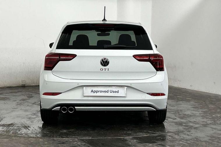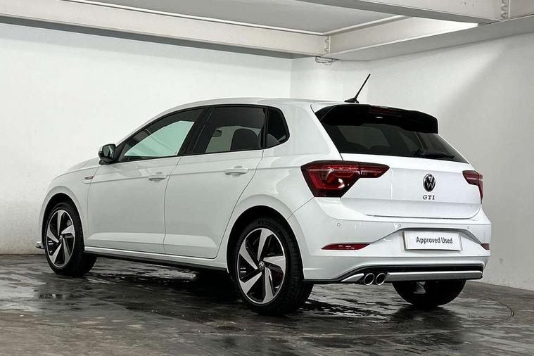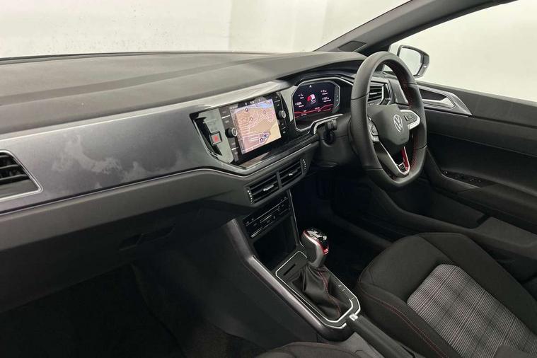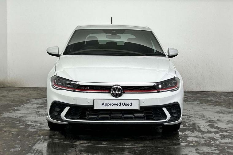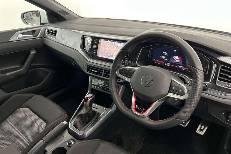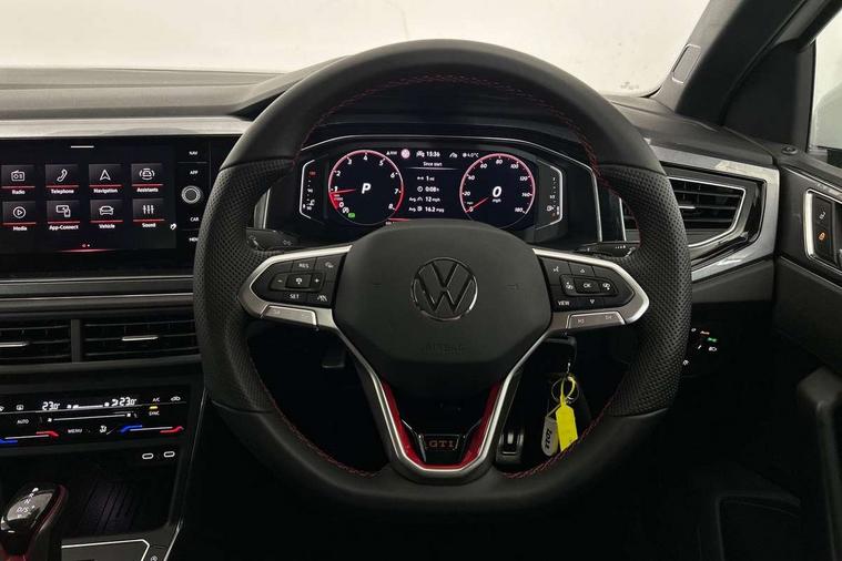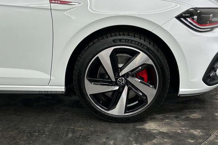Adaptive cruise control with follow-to-stop and speed limiter, Advanced driver attention and drowsiness monitor, Bluetooth mobile phone interface, Digital Cockpit Pro with 10.25" Display, Dynamic road sign display, Eco mode, Emergency call service, Multifunction camera, Power assisted speed sensitive steering, Preparation for We connect and We connect plus, Speedo and rev counter, electronic odometer, trip, service interval display and fuel gauge, Travel Assist - Lane keeping system and traffic jam assist, Travel assist including emergency assist, Trip computer, Warning signal and warning light for front and rear seatbelts not fastened, Washer fluid level indicator, Wireless app connect, Adaptive chassis control, Front wheel drive, Heavy duty rear axle, Rear shock absorpion sports version, Sports select suspension lowered by 15mm, Start-stop system with battery regeneration (recuperation - energy recovery during braking), DAB Digital radio, Diversity antenna for FM reception, Body colour bumpers, Body colour door handles, Electric front windows, Front scuff plates in aluminium with GTI logo, Heat insulating glass windscreen, Power folding adjustable/heated exterior mirrors and front passenger exterior mirror lowering function, Rain sensor, Rear electric windows, Rear fog light, Rear side wing doors, Rear windscreen washer and wiper with interval delay, Sport bumpers with air intakes with honeycomb structure, Third brake light, Twin chrome exhaust tailpipes, 12V power socket in centre console, 2 USB-C ports in the front, 2 USB-C charging sockets on the center console in the rear, 3 rear head restraints, 60/40 split folding rear seat and rear seat bench not split, Air care climatronic air conditoning system with active combination filter and 2-zone temperature control, Black roof lining, Carpet mats, front and rear, Chrome plated radiator grille inserts, air vent surrounds and light switch surrounds, Door and side trim panel, Driver and front passenger seat height adjustment, Driver/passenger sunvisors with illuminated vanity mirrors, Front centre armrest, Front footwell illumination, Front seat backrest storage pockets, GTI sports gearshift knob in aluminium leather, Handbrake lever handle in leather, Headliner in recycled material, Isofix child seat preparation easy-fit (for two outer rear seats, and front passenger seat) compatible with I-size, LED interior light with switch off delay and dimmer, 2 reading lights front and rear, Luggage compartment cover, Luggage compartment floor, Luggage compartment lighting, Lumbar adjustment for front seats, Single front passenger seat, Stainless steel pedals, Standard pedal cluster, Three spoke leather wrapped multifunction sports steering wheel with shifting paddles, IQ LED matrix headlights pack - Polo, Light and sight pack - Polo GTI, 3 point height adj front seatbelts + pretensioners, 3x3 point rear seatbelts, ABS, Driver and front passenger airbag with front passenger airbag deactivation, Drivers and front passengers safety optimised head restraints, ESC (Electronic stability control) + EDL (Electronic Differntial lock) and ASR (Traction control), Extended and predictive pedestrian/ cyclist protection, Front and rear disc brakes with red brake calipers, Front curtain and side airbags with center airbag, Hill hold control, Manual child lock in rear doors, Two tone horn, Tyre pressure loss indicator, Alarm with interior protection, Anti-theft alarm system with interior monitoring, backup horn, and towing protection, Anti-theft wheel bolts, Electronic engine immobiliser, Chrome applications on rotary light, mirror adjustment, window regulator switches, outlet with frame in black, Low rolling resistance tyres,