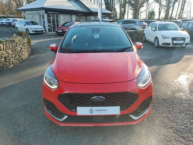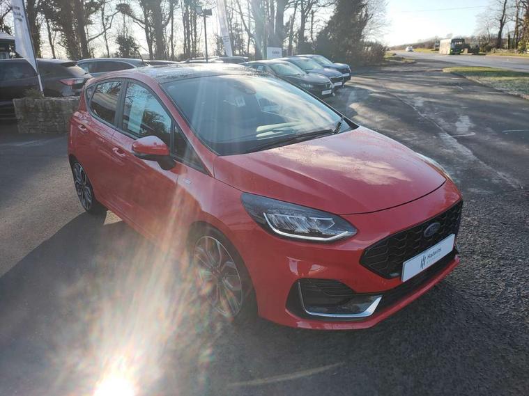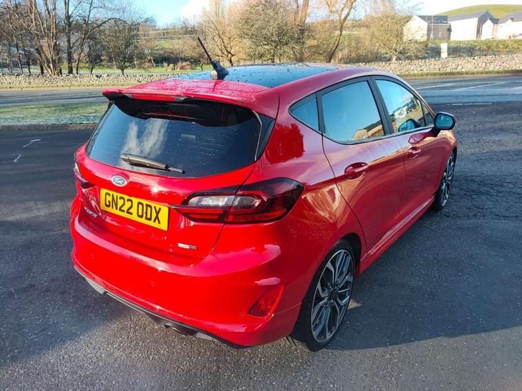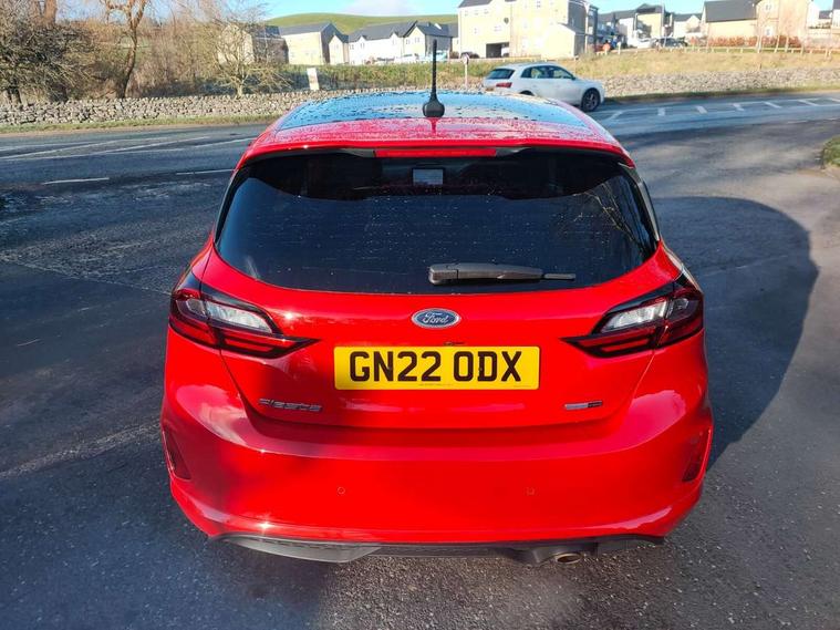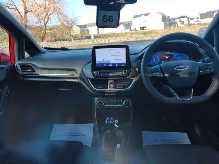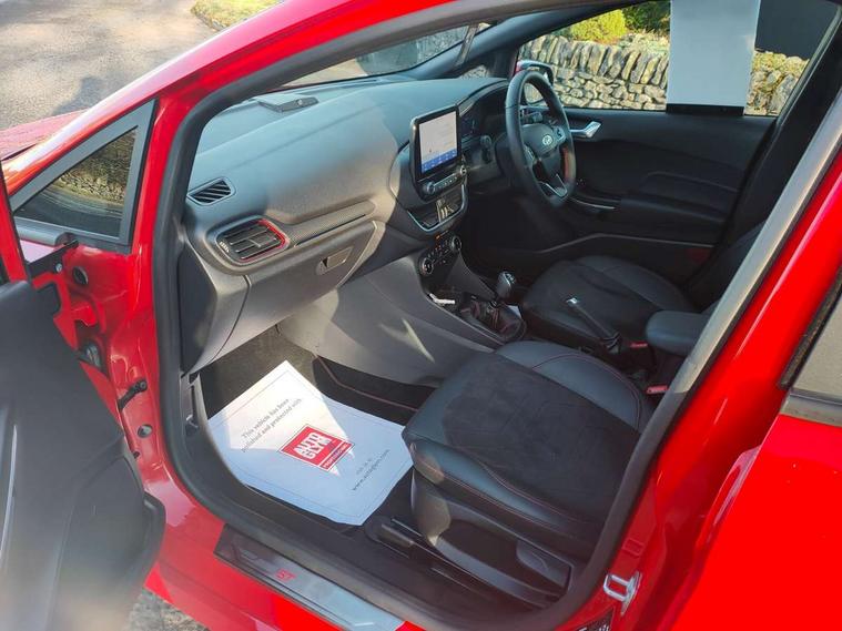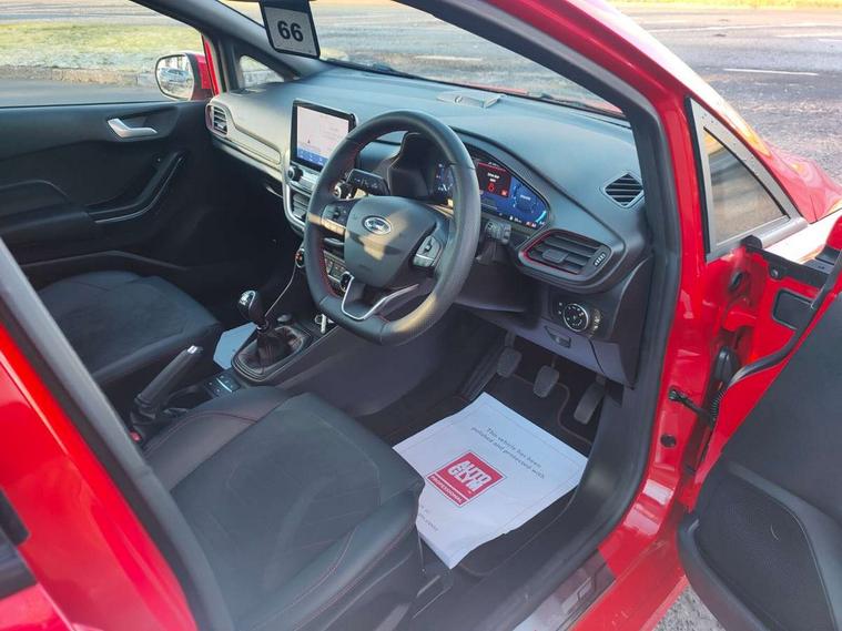 12.3" Full digital cluster, Driver alert system, Electric power steering, Ford easy fuel, Ford SYNC 3 Nav with DAB radio, 8" touch screen, voice control, emergency assist, Apple CarPlay/Android auto, 2x USB, 6 speaker, Ford pass connect, Rear parking distance sensors, Rear view camera, Selectable drive modes (Normal, Sport, Track), Speed sign recognition, Trip computer, Wrong way alert, Sports suspension, Auto high beam, Body colour bumpers, Body colour large rear spoiler, Body coloured electrically operated with side indicators, Electric front windows/one touch facility, Front unique ST scuff plates, LED Night signature to rear lights, LED third brake light, Quickclear heated windscreen, Rain sensing wipers and auto dimming rear view mirror, Rear privacy glass, Rear side wing doors, Rear wiper, Unique ST-Line upper grille & full bodystyling kit with ST-Line wing badges, 3 seat bench in 2nd row, 4 way manually adjustable passenger seat, Adjustable head restraints, Black headlining, Centre console with opening armrest, 2x cupholders, 12v and USB, Drivers and Passenger lumbar support, EATC - Electronic Auto Temperature control, Front floor mats in velour, Leather gaiter, LED ambient lighting, Manual 4-way driver seat adjust, Sensico partial premium leather upholstery with red stitching, Sensico wrapped steering wheel, Single front passenger seat, NCAP Pack - Fiesta, Winter pack [GTBAB]- Fiesta, 3 point seatbelts on all rear seats, Electronic stability control with hill start assist, Manual child lock in rear doors, Tyre pressure monitoring system, Ford keyfree system with Keyless entry and keyless start, MyKey system, Remote central locking, Thatcham alarm with power door dead locks, 18" 5x2 spoke alloys with pearl grey machined finish,
