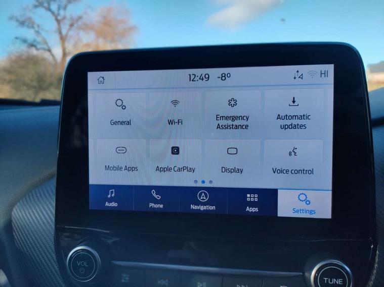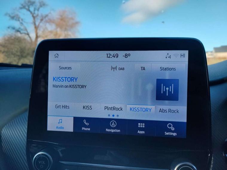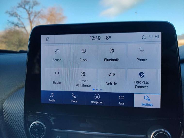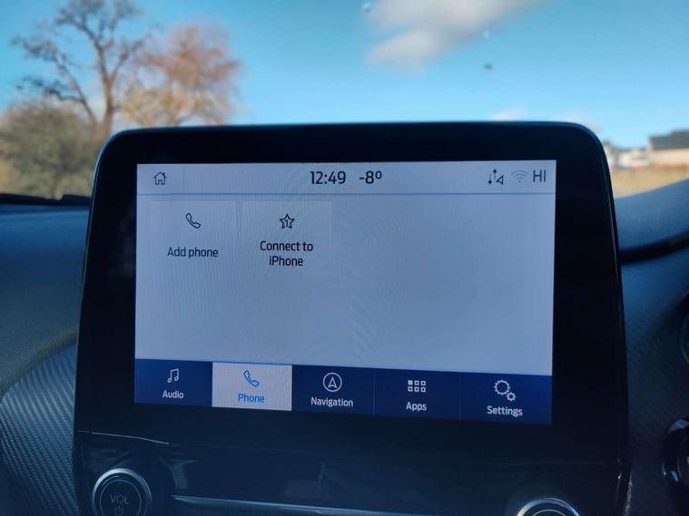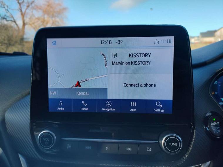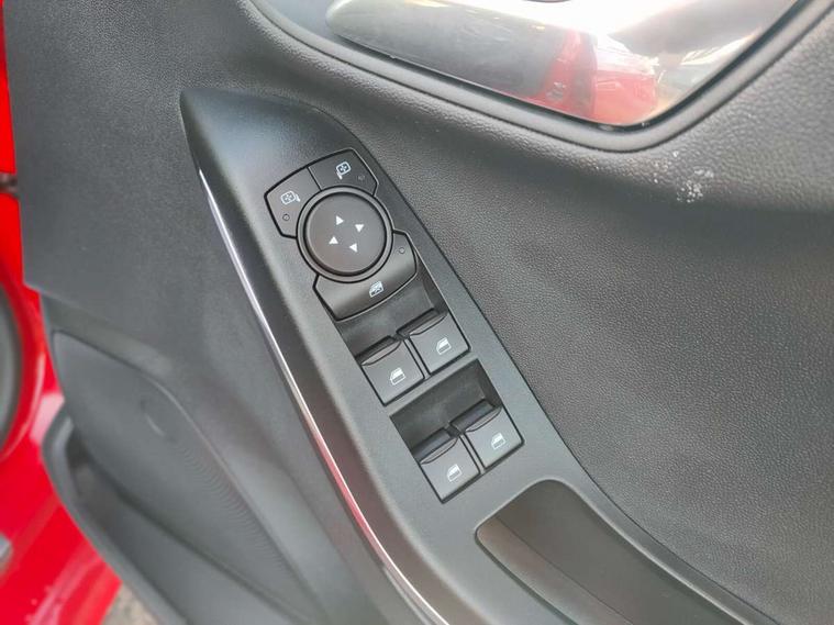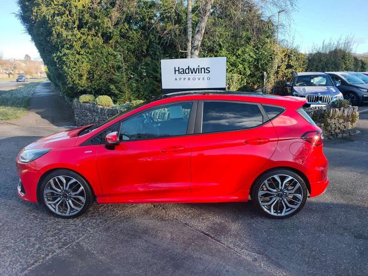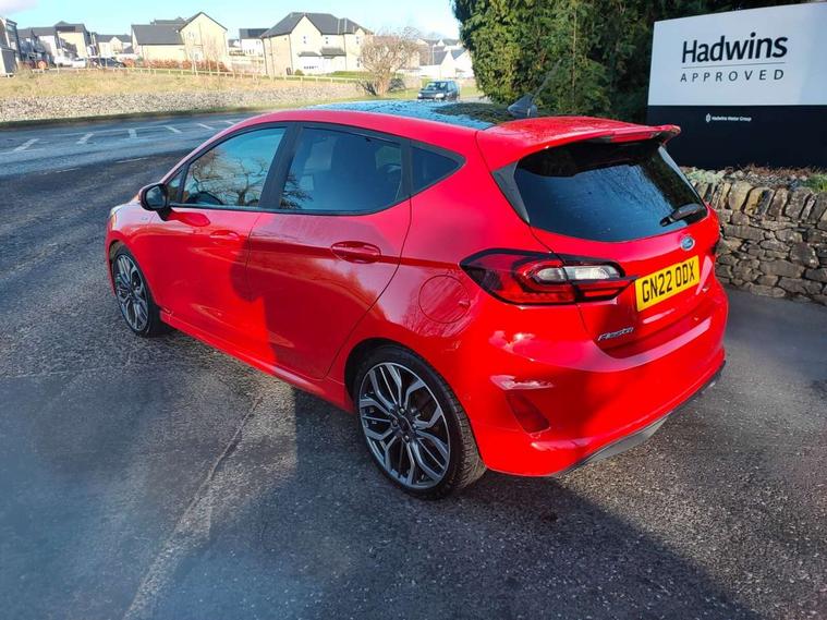 12.3" Full digital cluster, Driver alert system, Electric power steering, Ford easy fuel, Ford SYNC 3 Nav with DAB radio, 8" touch screen, voice control, emergency assist, Apple CarPlay/Android auto, 2x USB, 6 speaker, Ford pass connect, Rear parking distance sensors, Rear view camera, Selectable drive modes (Normal, Sport, Track), Speed sign recognition, Trip computer, Wrong way alert, Sports suspension, Auto high beam, Body colour bumpers, Body colour large rear spoiler, Body coloured electrically operated with side indicators, Electric front windows/one touch facility, Front unique ST scuff plates, LED Night signature to rear lights, LED third brake light, Quickclear heated windscreen, Rain sensing wipers and auto dimming rear view mirror, Rear privacy glass, Rear side wing doors, Rear wiper, Unique ST-Line upper grille & full bodystyling kit with ST-Line wing badges, 3 seat bench in 2nd row, 4 way manually adjustable passenger seat, Adjustable head restraints, Black headlining, Centre console with opening armrest, 2x cupholders, 12v and USB, Drivers and Passenger lumbar support, EATC - Electronic Auto Temperature control, Front floor mats in velour, Leather gaiter, LED ambient lighting, Manual 4-way driver seat adjust, Sensico partial premium leather upholstery with red stitching, Sensico wrapped steering wheel, Single front passenger seat, NCAP Pack - Fiesta, Winter pack [GTBAB]- Fiesta, 3 point seatbelts on all rear seats, Electronic stability control with hill start assist, Manual child lock in rear doors, Tyre pressure monitoring system, Ford keyfree system with Keyless entry and keyless start, MyKey system, Remote central locking, Thatcham alarm with power door dead locks, 18" 5x2 spoke alloys with pearl grey machined finish,