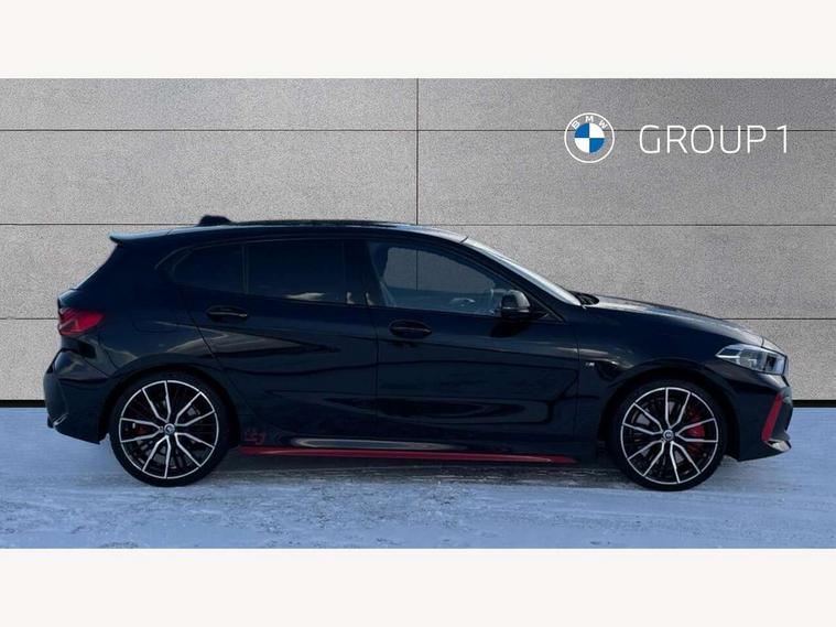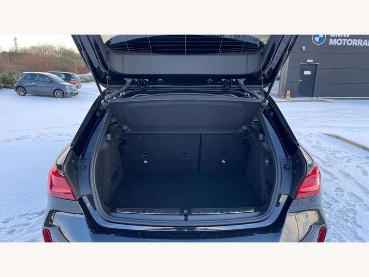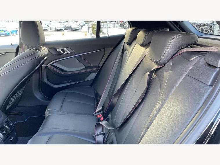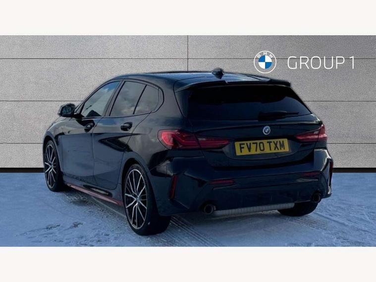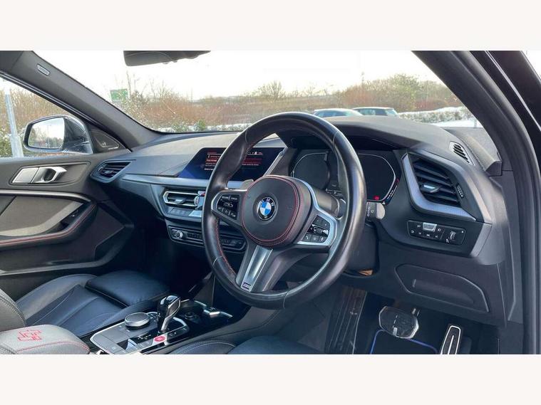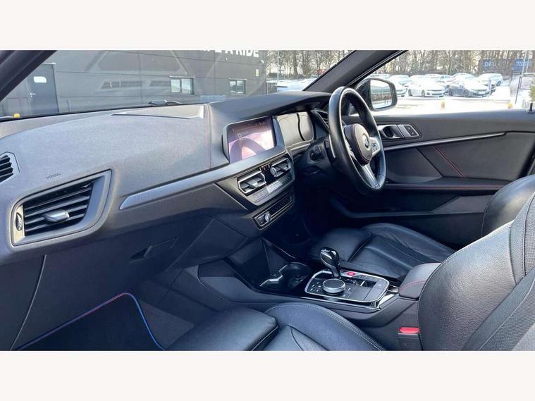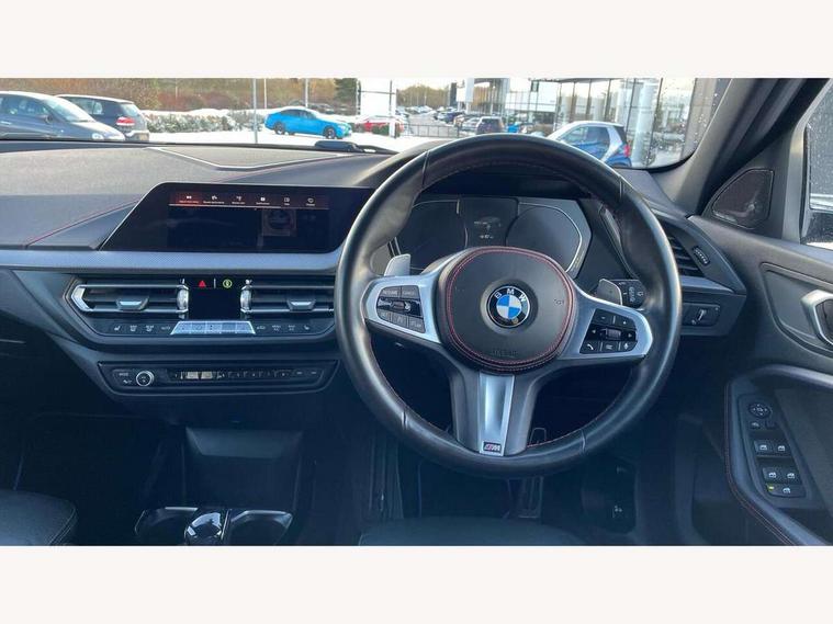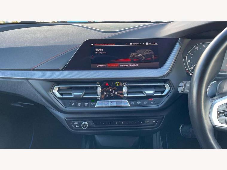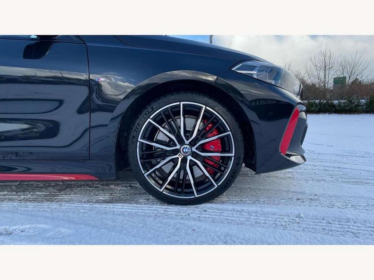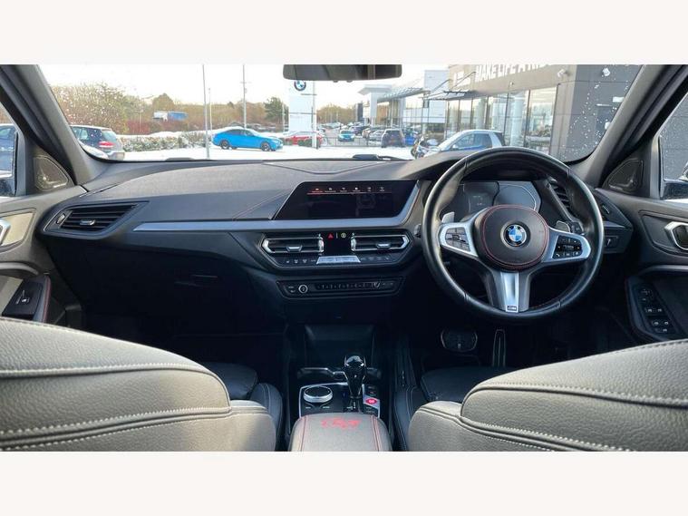 Active guard plus, Attentiveness assist, BMW Online services, BMW Teleservices, Check Control warning system for monitoring of lights and door/luggage compartment open warning, Connected eDrive Services, Eco pro mode, Electric power steering with Servotronic steering optimised at all speed ranges, Integrated owners handbook, Oil sensor for level and grade, On board computer, Optimum shift indicator, Personal Profile, Pull away assistant, Speed limiter, Aluminium lightweight construction, Anti roll bar front and rear, Balancer shaft, Double VANOS, Drive Performance Control, Eight speed sport automatic transmission with electronic selector lever, Electronic differential lock, High precision injection, M sports suspension + self levelling, Petrol Particulate Filter, VALVETRONIC engine management, Bluetooth audio streaming, DAB Digital radio, Air inlets in front left and right with highlight clasp in red, Auto dimming rear view mirror, Automatic headlight beam throw control, Black chrome tailpipe finishers, BMW individual lights shadow line, Body colour door handles, Body colour mirror caps, Chrome 'M' logo side designation, Chrome kidney grille frame with Satin Aluminium struts, Direction indicator side lights in exterior mirrors, Electric folding and anti dazzle exterior mirrors, Fading support, Follow me home headlights, Front and rear electric windows with open and close fingertip control, anti trap facility and comfort closing, Front door sill finishers in black plastic with BMW designation, Green tinted heat protection glazing, Heated, electrically adjustable exterior mirror aspheric on driver side, convex on passenger side, High gloss shadowline window frame, Recess cover mirror frames and B/C pillar embelisher trim, High level third brake light, LED daytime running lights, LED eyebrow turn indicators, Lightweight engineering, Matt black air guide grilles, Model designation on right side of tailgate, Nearside reverse light in rear light cluster, Preparation for high beam assistant, Rain sensor including auto headlights activation, Rear fog lights, Rear window wiper, Shark fin antenna, Visible VIN plate, Welcome lighting, Windscreen wipers with integrated washing jets, 12V power socket in centre console, 3 rear seat head restraints, Anthracite headlining, Centre armrest in black/red highlight including embroidered 'ti' designation in red, Child seat ISOFIX attachment for two outer rear seats and front passenger seat with anchorage points, Conditioned based service, Driver and front passenger seat heating, Floor mats with red binding, Folding rear clothes hook, Folding rear seats, Four grab handles integrated in roof lining, Front and rear door pockets, Front and rear side armrest integrated into door trim, Front armrest foldable with integrated storage compartment, Front sports seats with electric side bolster adjustment, Glove compartment, Height adjustable front head restraints, Instrument panel top section , door armrests and door panels in black/red highlight, Manual adjust steering wheel, Multi-function controls for steering wheel, Rear seat backrest with manual 60:40 split folding with 3 top tether clips integrated on rear of seat panels, Storage compartment in centre console, Sun visors with vanity mirrors and insert tab, Three spoke M sport design multi function leather steering wheel in unique red stitching, Two zone automatic air conditioning, Connected pack professional - 1 Series, Extended Lighting pack - 1 Series, Extended storage pack - 1 Series, Interior lights pack - 1 Series, Luggage compartment pack - 1 Series, M Sport exterior styling aerodynamics pack - 1 Series, 2 tone horn, 3 point seatbelts on all seats, front pyrotechnic belt tensioners, stopper and belt force limiters, rear coded belt buckles, Airbags - Front driver and passenger, front and rear head, front side, curtain head protection, Anti lock braking system (ABS) with brake assist, BMW emergency call, Brake drying, Braking readiness, Crash sensor activating central locking release, hazard warning lights, fuel cut off, interior lighting + activation of safety battery terminal clamp, Driver and front passenger seat belt security check, Dynamic stability control + (DSC+), Dynamic Traction Control - DTC, Electrically operated hand brake, Front and rear disc brakes, Front passenger manual airbag deactivation, M Sport braking system with red calipers, M sport seatbelt, Rear child proof door locks, Seatbelt warning, Side impact protection, Tyre pressure monitoring system, Warning triangle and first aid kit, Automatic drive away locking facility, Central locking switch for all doors, fuel filler cap and luggage compartment, Deadlocking function system to all doors, Locking wheel bolts, Remote control with integrated key with High-gloss Black inlay and M designation and 1 button for open/ close lock, window, open luggage compartment, Start/stop button with comfort go keyless engine start and auto start stop deactivation button, Thatcham Cat.1 alarm and immobiliser, Reduced rolling resistance tyres,
