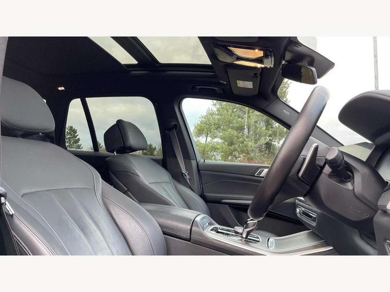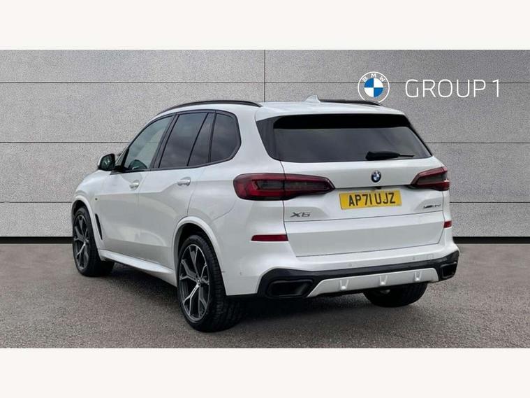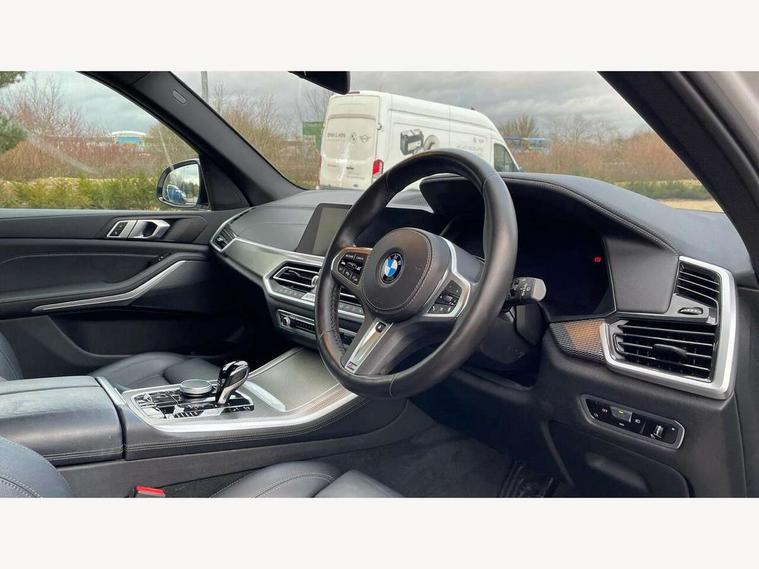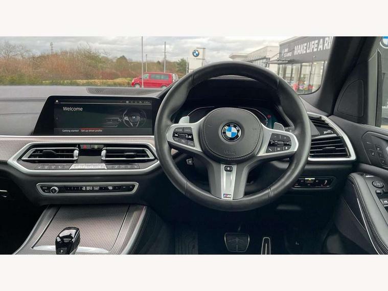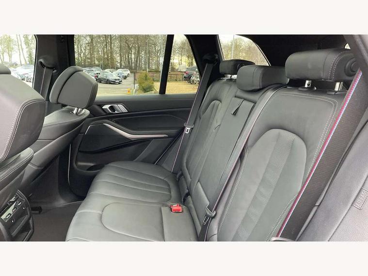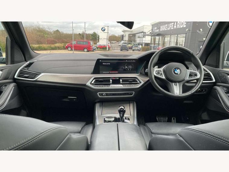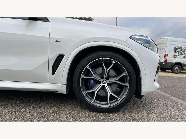 20GB hard disc drive (HDD) memory, Active guard plus, Attentiveness assist, Automatic tailgate with top hinged section open and manual bottom hinged section, BMW ConnectedDrive online services, BMW digital live cockpit professional - 12.3" digital instrument panel and 12.3" CID, with touch/voice command, BMW legal emergency call, BMW Teleservices, Brake force display, Brake pad wear indicator warning light, Cruise control with brake assist, Enhanced bluetooth with wireless charging, Front/rear park distance control, iDrive touch controller with shortcut buttons, Lights on warning, Oil sensor for level and grade, On board computer inc. average speed, fuel consumption, liquid crystal Info display, journey computer, outside temperature display, personal profile, Service interval indicator, Speed limit info display, Speed limiting function, Wi-Fi hotspot, 48V Mild hybrid technology, Adaptive 2-axle air suspension, Common rail technology, Diesel particulate filter, Double wishbone front axle, Drive performance control with ECO PRO comfort + sport mode, Eight speed steptronic sport automatic transmission and gearshift paddles on the steering wheel, Safety battery terminal clamp, Variable vane geometry, DAB Tuner enables digital radio reception, Favourite buttons, Hi-Fi loudspeaker system, USB connection, USB type A 1.5A in cupholder, USB Type C 3A in centre armrest, Active Air Stream kidney grille with high-gloss chrome, Adaptive air flap control bar in high-gloss black, Automatically dimming rear view mirror, BMW Individual high gloss black shadow line roof rails, Body colour bumpers, Body colour door handles, Dynamic brake lights with LED technology, Exhaust tailpipes - single, left and right with Chrome finisher, Follow me home headlight function, Front and rear electric windows with open and close fingertip control, anti trap facility and comfort closing, Heated windscreen washer jets, High beam assistant, High gloss black outer and central air intakes on front bumper with pearlescent chrome finish, High gloss black Side elements, LED daytime running lights, LED rear lights, M aerodynamic body styling, M designation on left and right front side panels, Pearlescent chrome front grille bars, Rain sensor with automatic headlight activation and windscreen wiper control, Rear side wing doors, Satin aluminium side window graphic, Third brake light in rear spoiler, Variable intermittent rear wash/wipe, Welcome light carpet, X5 on left tailgate, xDrive designation on right tailgate, 12V - Power sockets with 2x centre console and 1x luggage compartment, 3 seat bench in 2nd row, 40:20:40 split folding rear seats, Ambient interior lighting with 6 pre-designed selectable lights including dynamic function, Centre and rear interior light, Child seat ISOFIX attachment with rear outer seats includes top tether, Compartment in front of cupholder, Electric front seat adjustment with driver and front passenger memory function, Electrical steering column with adjustable height and length with activation and control on the steering column, Foldable rear centre armrest with 2 cupholders and storage compartment, Front and rear cupholders x 2, Front and rear door pockets, Front and rear door sill inlays with illuminated BMW M designation, Front and rear side armrest integrated into door trim, Front footwell lights, Front reading lights, Light inside glove compartment, Lockable glove compartment, Luggage compartment floor panel with integral storage tray, Luggage compartment lighting, M leather steering wheel, M specific key, M specific steering wheel, M specific velour floor mats, Make-up mirror lights, Multifunction controls for leather steering wheel, Multifunctional hooks, Rear head restraints, Seat back with flap pocket, Securing rings in luggage compartment, Single front passenger seat, Storage bins on all doors, Storage tray and compartment with cover in centre console, Sunvisors with illuminated vanity mirrors, Toolkit located in luggage compartment, Connected Package Professional - X5, Expanded exterior mirror pack - X5/X5 M, Non-smokers pack - X5, Airbags - driver/front passenger, rear and side, first and second row seats head airbags, front passenger seat airbag deactivation + knee airbag, Anti-lock braking system (ABS), Automatic Stability Control (ASC), Brake drying, Brake energy regeneration, Brake fade compensation, Braking pre-tensioning, Cornering brake control (CBC), Crash sensor activating central locking release, hazard warning lights, fuel cut off, interior lighting + activation of safety battery terminal clamp, Deformation zones - front and rear with door reinforcements and bumpers up to 2.5 mph, DSC - Dynamic Stability Control, Dynamic brake control, Dynamic Traction Control - DTC, Electromechanical parking brake with automatic drive away release and auto hold function, Electronic brake force distribution, Front and rear seatbelts with seatbelt stopper, seatbelt tensioner for front and outer rear seats and belt force limiter, Front head restraints with anti-whiplash, Height adjustable front seatbelts, Hill start assistant, Integrated brake system, M Sport braking system in blue high gloss + blue painted brake calipers with M designation, Mechanical child proof lock on rear doors, Passive protection for pedestrians, Seat occupancy detection for driver and passenger side, Side impact protection, Three 3 point inertia reel seatbelts, Two tone horn, Tyre pressure monitoring system, Ventilated front and rear disc brakes, Warning triangle and first aid kit, Closing system with central locking, Driver and front passenger door centre lock switch, Locking wheel bolts, Thatcham 1 alarm system with remote control and engine immobiliser, Start/stop toggle diamond shaped trim finisher in pearl chrome,