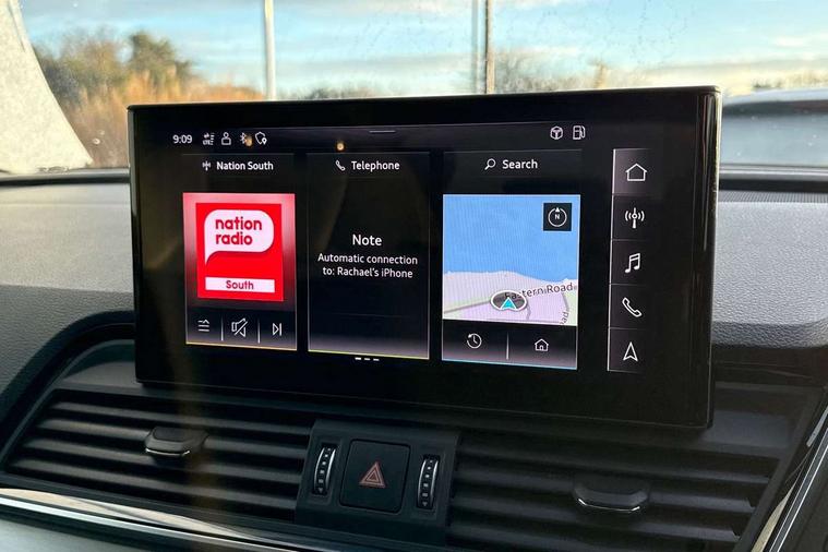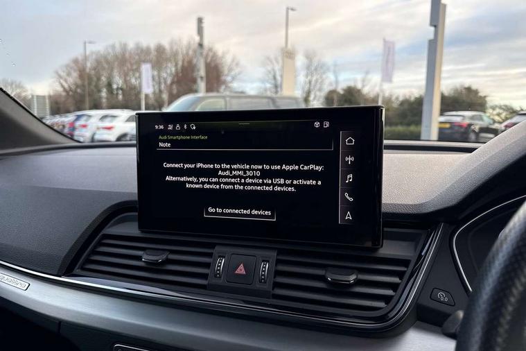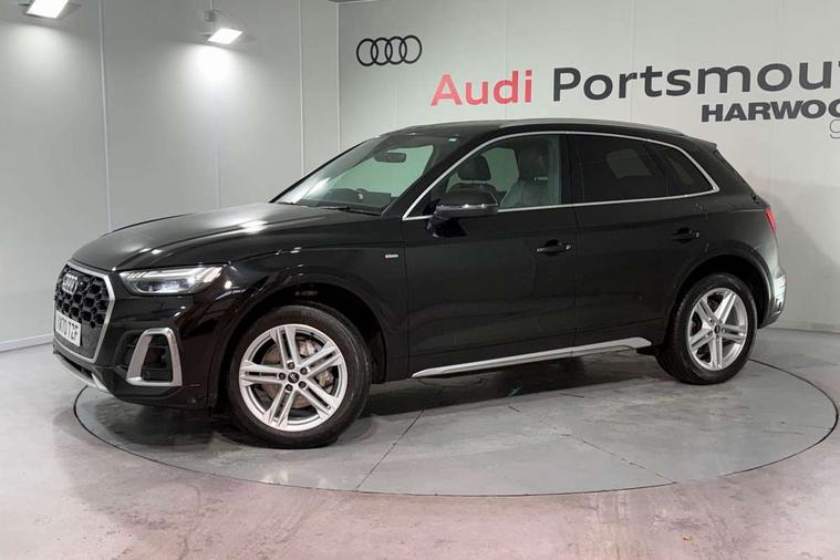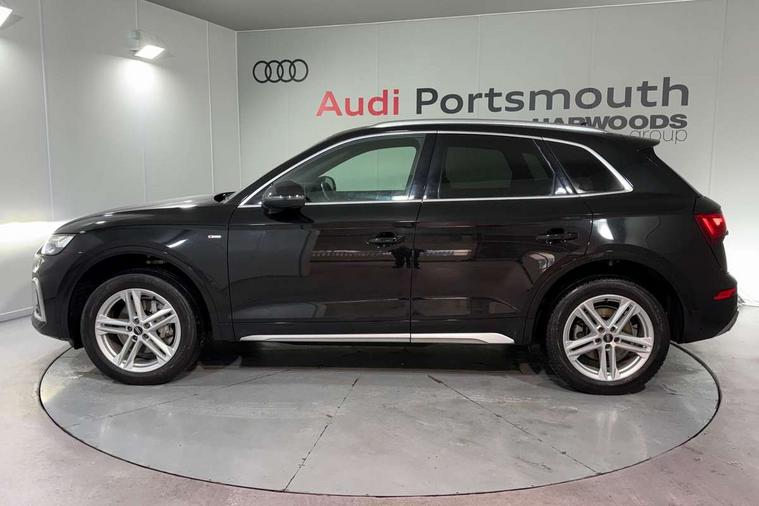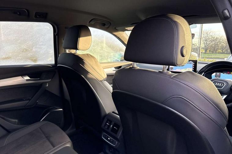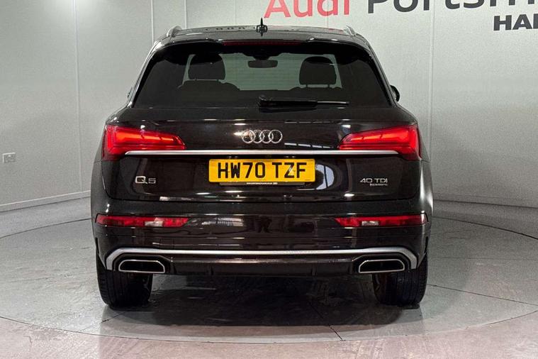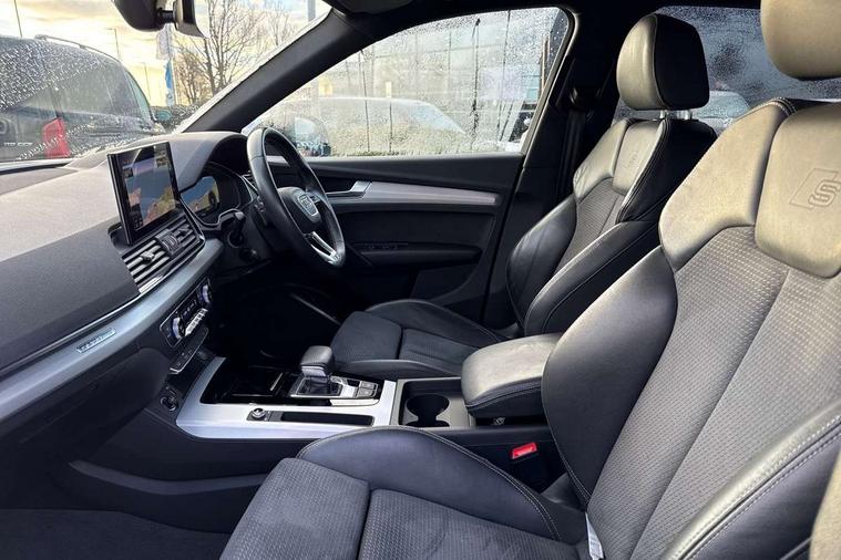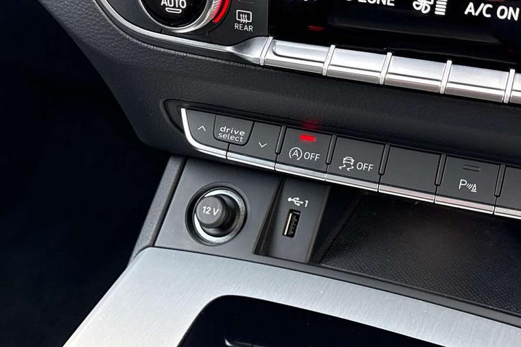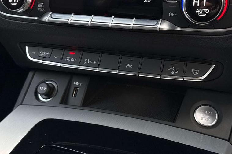 Amazon alexa Integration, Audi connect safety and service (e-call), Audi drive select, Audi virtual cockpit plus with 12.3" screen and three different layout designs, Audi wireless smartphone interface, Automatic start-stop system with coasting functionality and efficiency programme, Electro - mechanical power assisted steering, MMI navigation plus with 10.1" touch screen, Mobile telephone preparation - bluetooth interface, Power tailgate, Service interval indicator, Voice control system with Audi hotword activation "Hey Audi", Diesel particulate filter, Quattro on demand, 2 USB charging ports, DAB Digital radio, Acoustic windscreen, Aluminium roof rails, Audi matrix LED headlights with LED rear lights + dynamic front and rear indicators, Auto dimming rear view mirror, Automatic headlight adjustment, Automatic headlights and windscreen wipers, Body colour bumpers, Body colour door mirrors, Body colour rear diffuser with matt aluminium silver surrounds, Body colour underbody protection, Chrome plated exhaust trims, Door sills in Selenite silver, Electric adjustable/heated/folding door mirrors, Front air inlet surrounds in aluminium, Front and rear electric windows, Front radiator grille in honeycomb design, Headlight washers, Lower bumpers painted in contrast Manhattan grey, Rear chrome trim strip below lights, Rear privacy glass and rear side windows, Rear spoiler, Rear wiper, Roof bars, S Line badges on the front wings, S Line front and rear bumpers, S Line side skirts, 3 rear headrests, 40:20:40 split folding rear seat with rear centre armrest, Black cloth headlining, Contrast stitching on seats, steering wheel and gear lever gaiter, Deluxe 3 zone electronic climate control, Front centre armrest, Front/rear floor mats, Gear lever in black leather, Heated front seats, Height adjustable front head restraints, Height/reach adjustable steering column, Illuminated door sill trims with S logo, ISOFIX child seat mounting and top tether, Manual seat adjustment with 4-way electric lumbar support, Removable luggage compartment floor, Stainless steel pedals, Sunvisors with vanity mirrors, Tool kit, Trunk roller cover, High gloss pack - Q5, LED interior light pack - Q5, 3 point seatbelts on all seats, 6 airbags - Driver, front passenger, curtain and side airbags, Electrically operated child locks on rear doors, Electromechanical parking brake, Electronic stabilisation control including ABS, ASR and EDL, Front passenger airbag deactivation, Hill descent control, Hill hold assist, Multi collision brake assist, Pop-up bonnet for pedestrian protection, Pre sense city, Seat belt force limiter, Seatbelt monitoring, Tyre pressure warning, Warning triangle and first aid kit, Anti theft alarm, Anti-theft wheel bolts, Keyless Go access/ignition system, Matt brushed aluminium inlays,