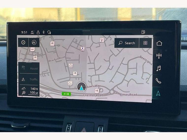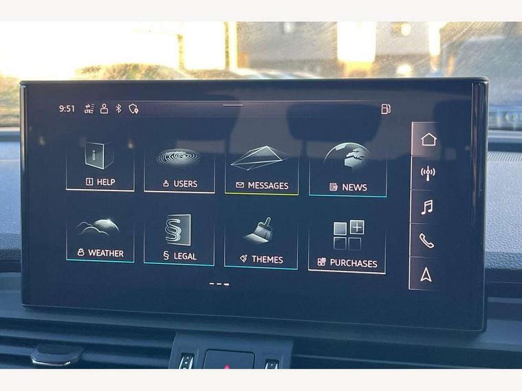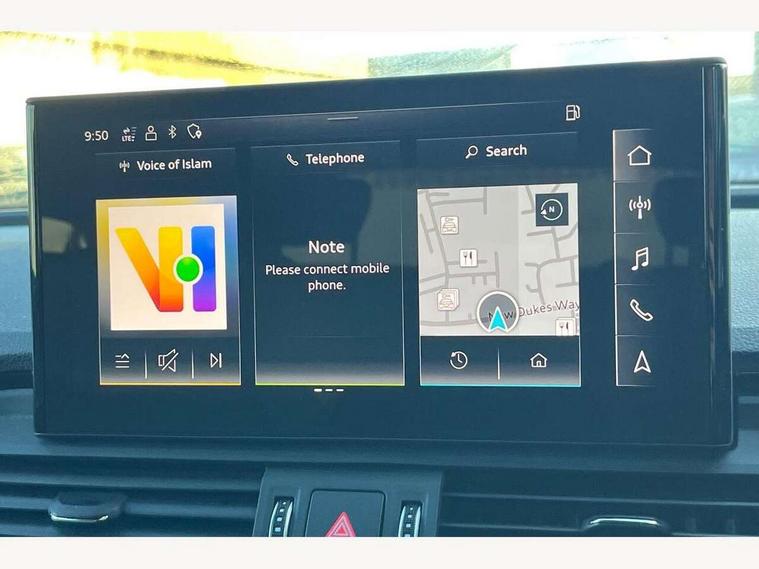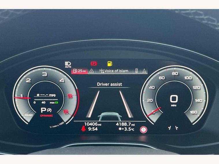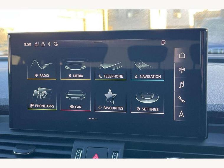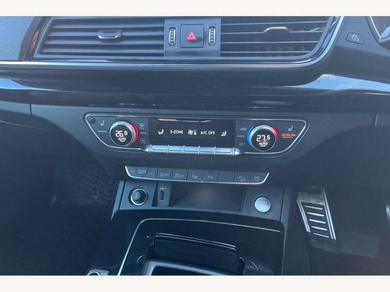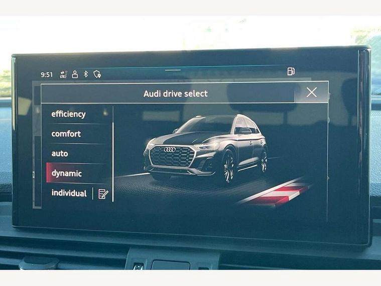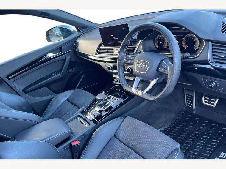 Acoustic front and rear parking sensor, Audi connect safety and service (e-call), Audi drive select, Audi virtual cockpit plus with 12.3" screen and three different layout designs, Audi wireless smartphone interface, Automatic start-stop system with coasting functionality and efficiency programme, Bluetooth interface, Camera based traffic sign recognition, Electro - mechanical power assisted steering, Lane departure warning, MMI navigation plus with 10.1" touch screen, Power tailgate, Reversing camera, Service interval indicator, Voice control system with Audi hotword activation "Hey Audi", Diesel particulate filter, Quattro on demand, S line sports suspension, 2 x USB charging port with aux input socket, 8 loudspeakers, DAB Digital radio, Acoustic windscreen, Auto dimming door mirrors, Auto dimming frameless rear view mirror, Automatic headlight adjustment, Automatic headlights and windscreen wipers, Black roof rails, Black styling with black rings, Body colour bumpers, Body colour rear diffuser with matt aluminium silver surrounds, Body colour underbody protection, Chrome plated exhaust trims, Daytime running lights, Door sills in Selenite silver, Electric adjustable/heated/folding door mirrors, Front air inlet surrounds in aluminium, Front and rear electric windows, Front radiator grille in honeycomb design, LED 3rd brake light, LED headlights and LED tail lights, Loading edge protection in stainless steel, Lower bumpers painted in contrast Manhattan grey, Rear chrome trim strip below lights, Rear privacy glass and rear side windows, Rear side wing doors, Rear wiper, Roof bars, S Line badges on the front wing panels, S Line front and rear bumpers, S Line rear spoiler, S Line side skirts, 3 rear headrests, Black cloth headlining, Comfort front centre armrest, Contrast stitching on seats, steering wheel and gear lever gaiter, Deluxe 3 zone electronic climate control, Front head restraints, Front sport seats with S embossed logo, Front/rear floor mats, Gear lever in black leather, Heated front seats, Height/reach adjustable steering column, Illuminated door sill trims with S logo, Luggage compartment cover, Manual seat adjustment with 4-way electric lumbar support, Single front passenger seat, Stainless steel pedals, Sunvisors with vanity mirrors, Top surface of the rear centre armrest in artificial leather, High gloss pack - Q5, LED interior light pack - Q5, 3 point seatbelts on all seats, 6 airbags - Driver, front passenger, curtain and side airbags, Attention and drowsiness assist, Electrically operated child locks on rear doors, Electromechanical parking brake, Electronic stabilisation control including ABS, ASR and EDL, First aid kit with warning triangle and vests, Front passenger airbag deactivation, Hill descent control, Hill hold assist, ISOFIX child seat mounting for front passenger seat and ISOFIX child seat mounting with Top Tether for outer rear seats, Multi collision brake assist, Pop-up bonnet for pedestrian protection, Pre sense city, Seatbelt monitoring, Tyre pressure warning, Anti theft alarm, Anti-theft wheel bolts, Remote central locking, Remote control key with SAFELOCK and keyless go, Air vents inserts and centre console in gloss black, Tool kit, Tyre repair kit,