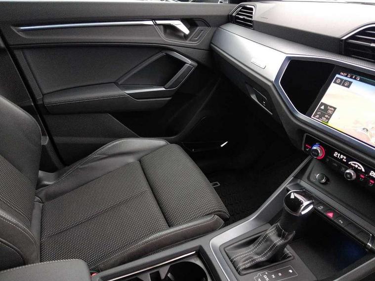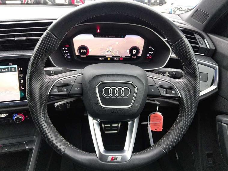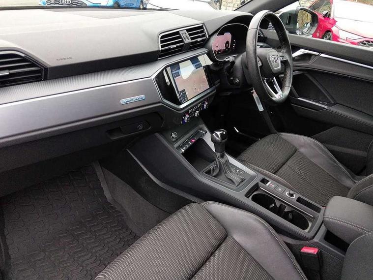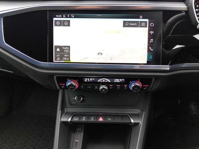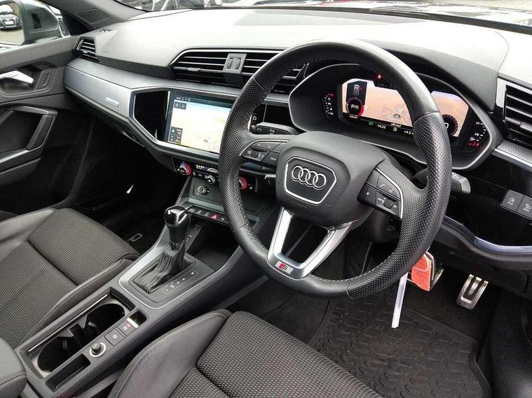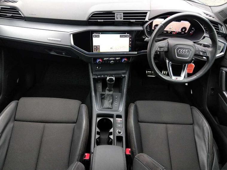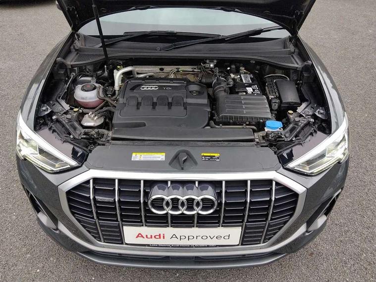 Audi connect safety and service (e-call), Audi drive select, Audi lane departure warning, Audi side assist, Audi smartphone interface, Bluetooth interface, Camera based traffic sign recognition, MMI navigation plus with MMI touch, Power opening/closing tailgate, Progressive steering, Rear parking sensors, Service interval indicator, Stop/start system, Voice control system, Diesel particulate filter, Sports suspension, 1 x USB type C and 1 USB type A charging points, 6 speakers, DAB digital radio module, Acoustic windscreen, Aluminium roof rails, Aluminium window trim, Auto dimming rear view mirror, Body coloured bumpers, Diffuser in matt Platinum grey, Electrically adjustable and heated door mirrors with integrated LED side indicators, Front and rear electric windows, Front fog lights, Front side air inlets in matt platinum grey, Front spoiler blade in matt platinum grey, Grille vertical bars in aluminium silver/Matt, High gloss black finish B and C pillars, LED headlights with LED daytime running lights and dynamic rear indicator, LED rear lights, Privacy glass, Rain and light sensors, Rear diffuser strip in matt titanium black, S Line badge on wings, S Line front and rear bumpers, Side skirt insert in matt Platinium grey, Titanium black radiator grille, 12V socket in rear centre console, 40:20:40 split folding rear bench seat, Adjustable rear seat bench/backrest with centre armrest and cupholder, Aluminium door sill trims, Black cloth headlining, Dual zone climate control, Front and rear black floor mats with contrast stitching in rock grey, Front and rear headrests, Front centre armrest with storage compartment and angle adjustment, Illuminated door sill trims with S logo, ISOFIX child seat mounting and Top Tether with front passenger airbag deactivation, Manual front seats with height adjustment, Perforated leather gearknob, Stainless steel luggage compartment sill finisher, Stainless steel pedals, Non smoking pack - Q3, 3x3 point rear seatbelts, 6 airbags - Driver, front passenger, curtain and side windows, Audi pre-sense front with pedestrain and cyclist recognition, Electrically operated child locks on rear doors, Electromechanical parking brake, Electronic stabilisation control including ABS, ASR and EDL, Hill hold assist, Pre sense basic, Seatbelt monitoring, Tyre pressure warning, Warning triangle and first aid kit, Anti theft alarm, Anti theft wheel bolts, Remote central locking, Dark matt brushed aluminium inlay, MMI touch colour display in gloss black with aluminium surround,